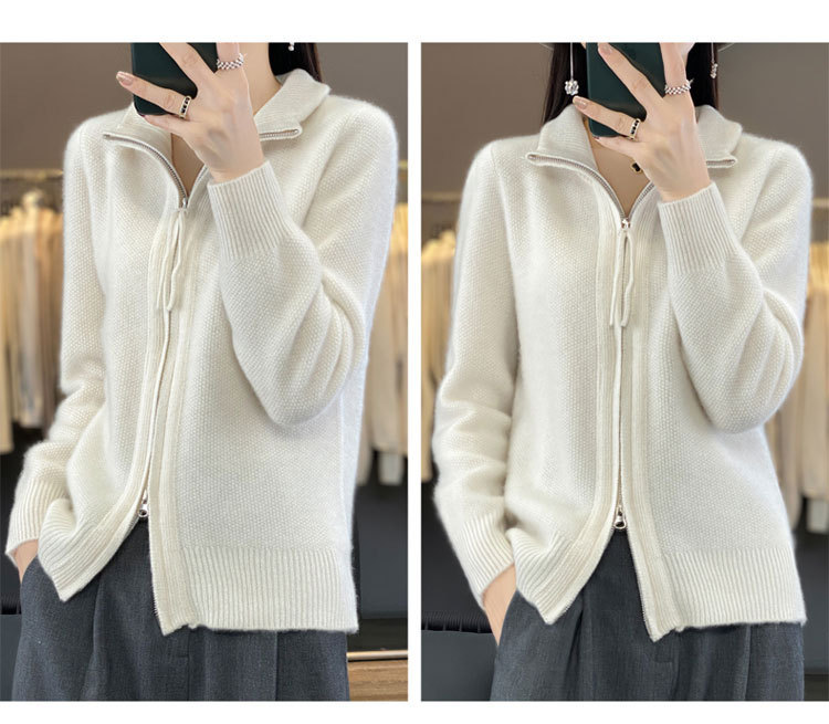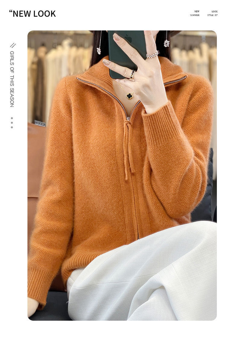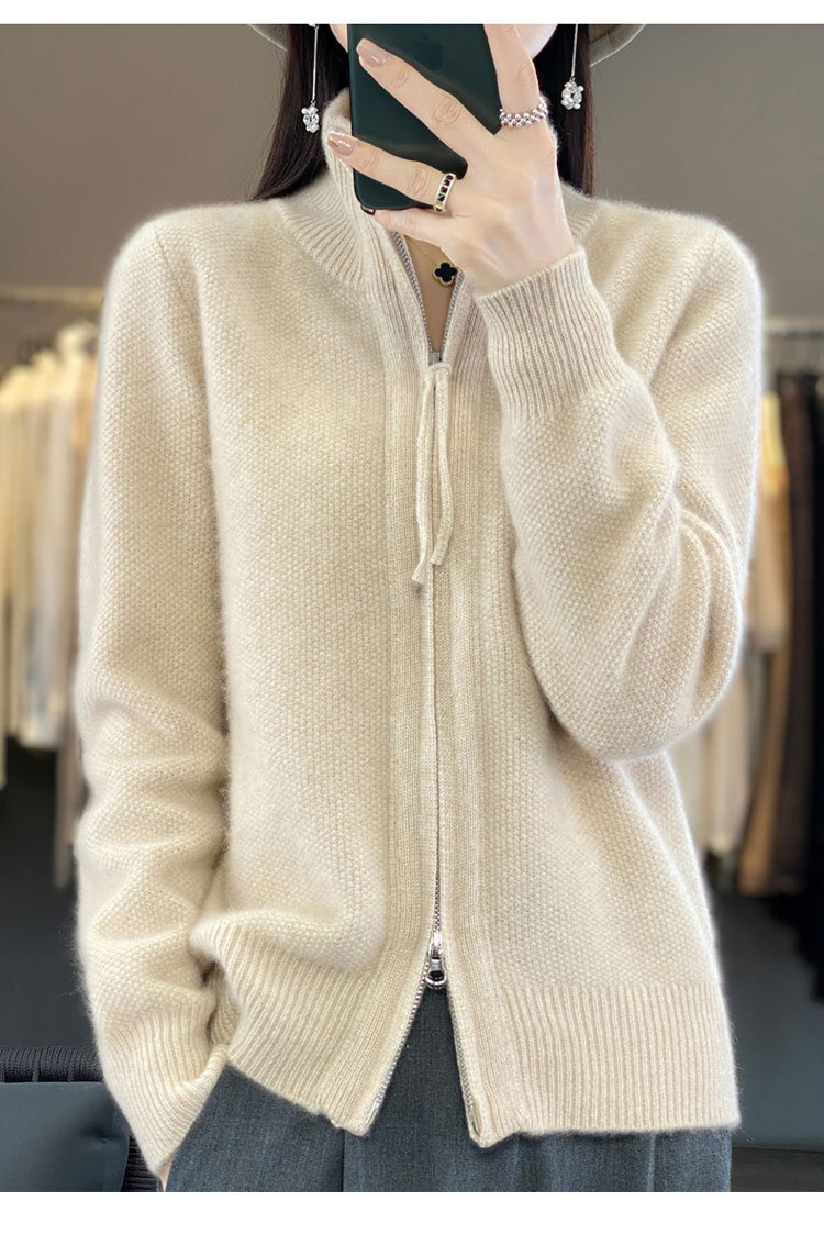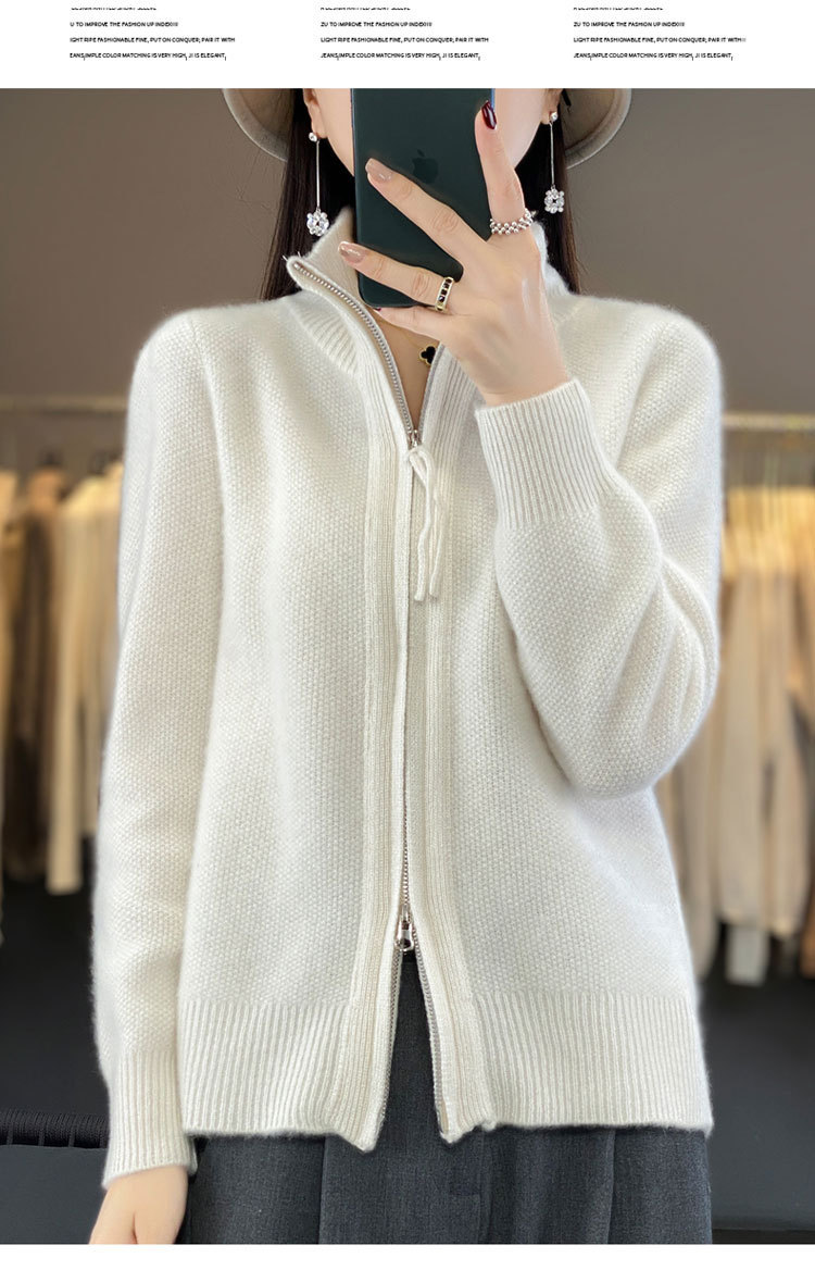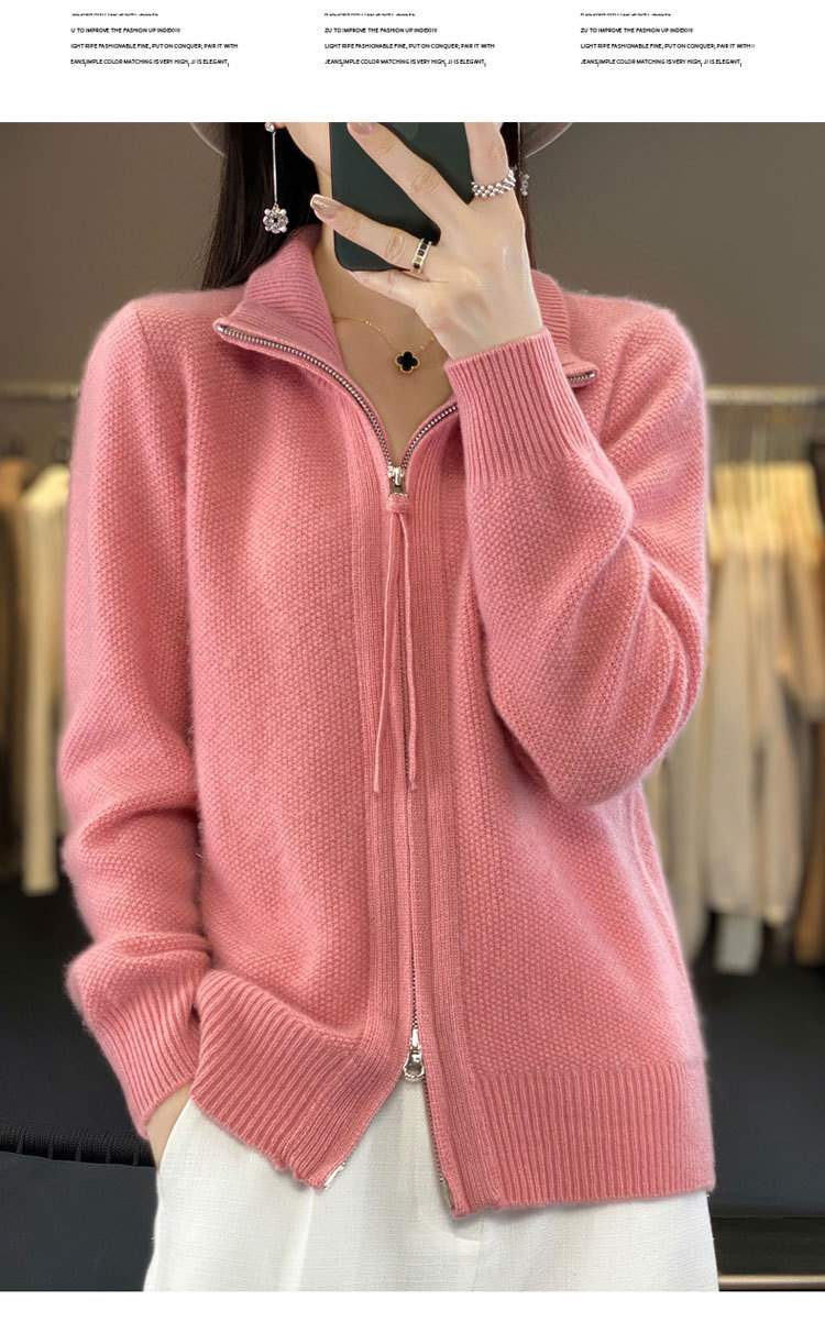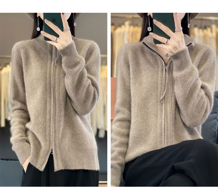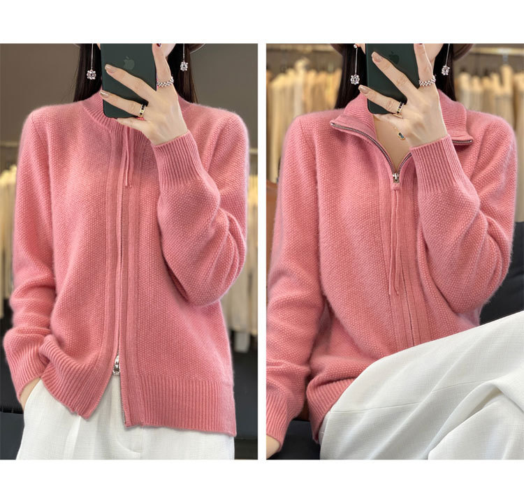 QHJY-NJRG851秋冬新款双拉链高领加厚羊毛开衫女纯色显瘦保暖外套针织上衣