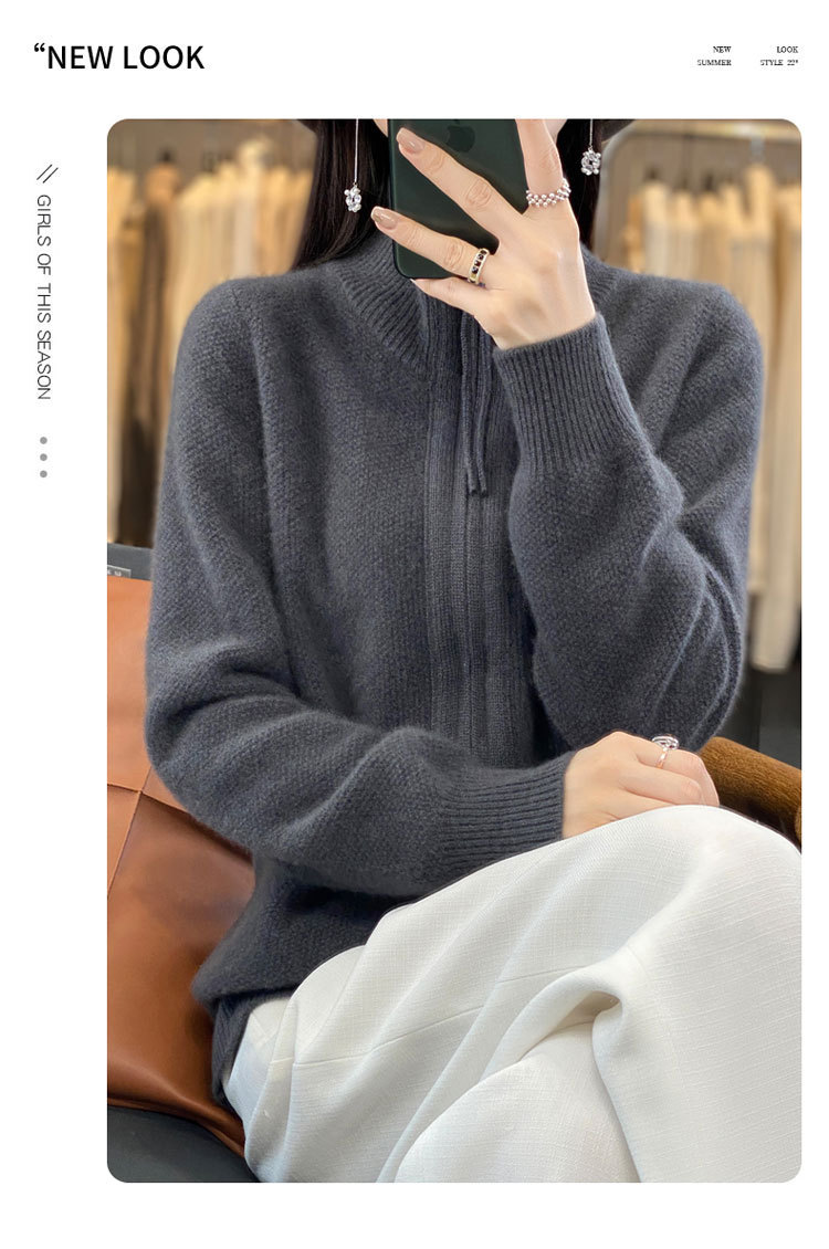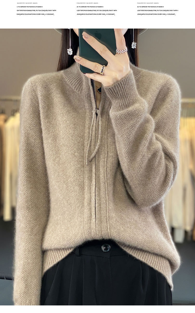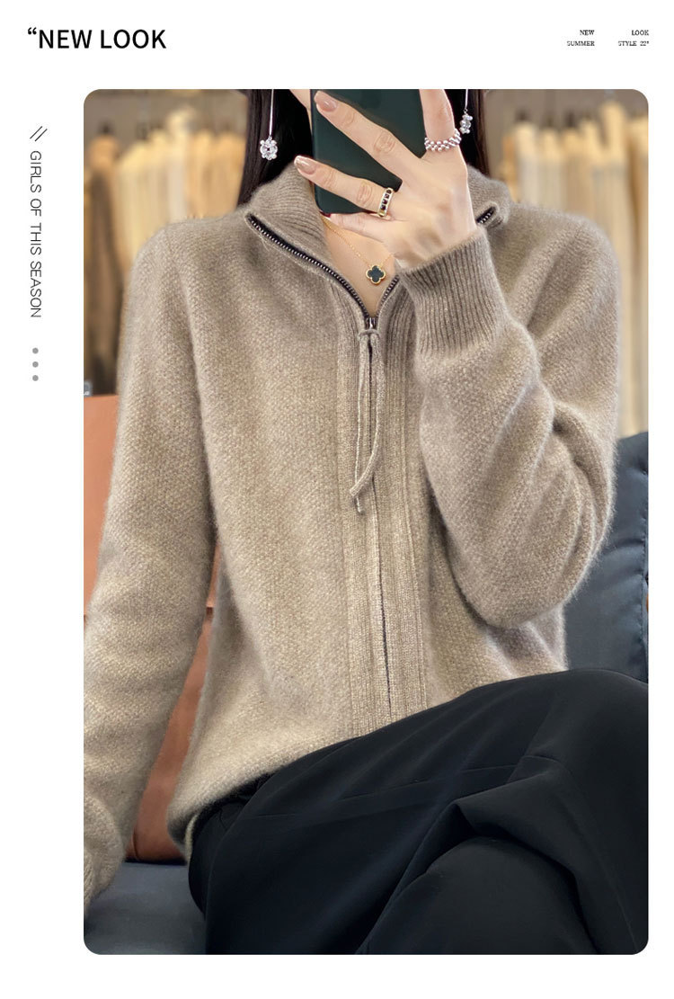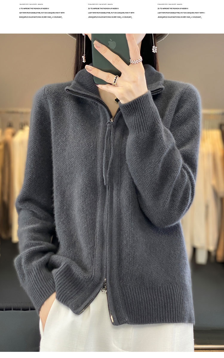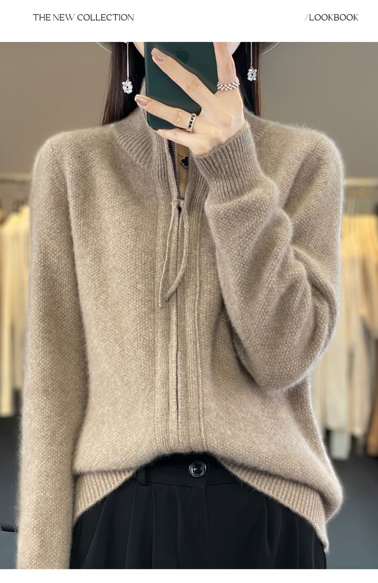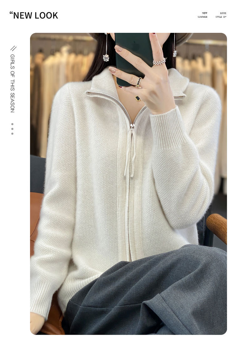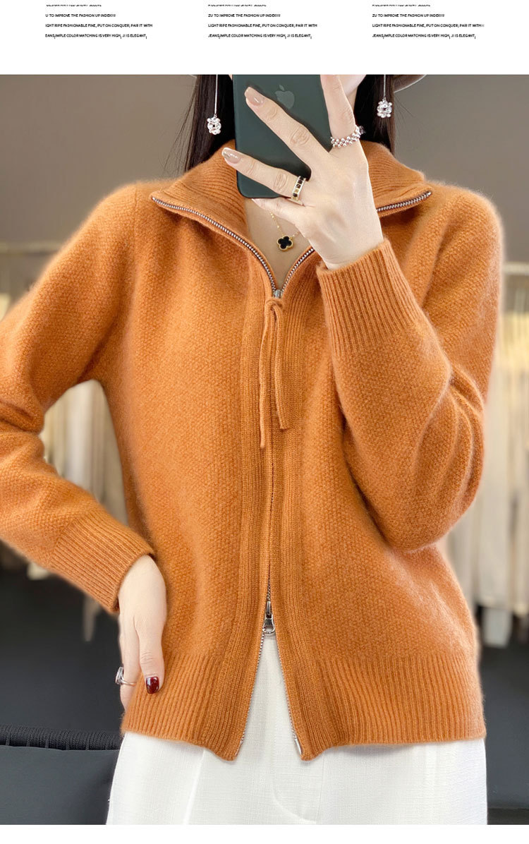 QHJY-NJRG851秋冬新款双拉链高领加厚羊毛开衫女纯色显瘦保暖外套针织上衣