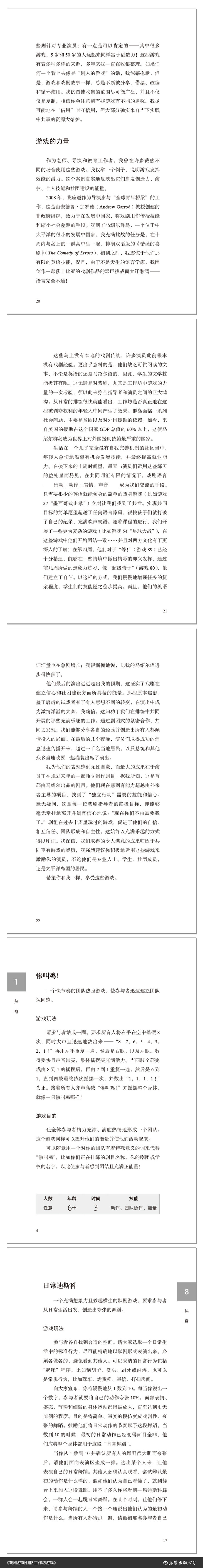 全书游戏按照一个完整的团队工作坊活动顺序排布,指导者也可根据具体情况酌情安排。每个游戏玩法的介绍后,均附有一个提供人数、年龄、培养技能等参考信息的列表,而“拓展与延伸”部分则为游戏提供了更多的玩法,以适应不同的场合。