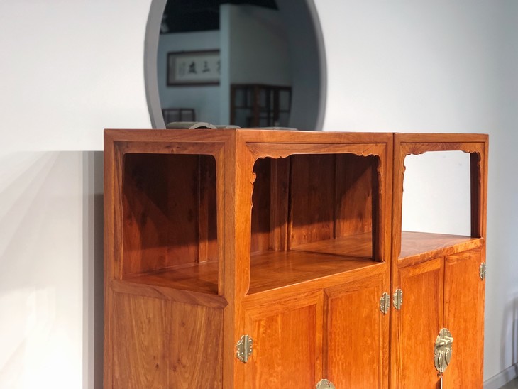 明式家具中,有一个品种是架格和柜子结合在一起的,常见的形式是架格在上,柜子在下。架格齐人肩或稍高,中置器物,便于观赏,柜内贮存物品,重心在下,有利稳定。