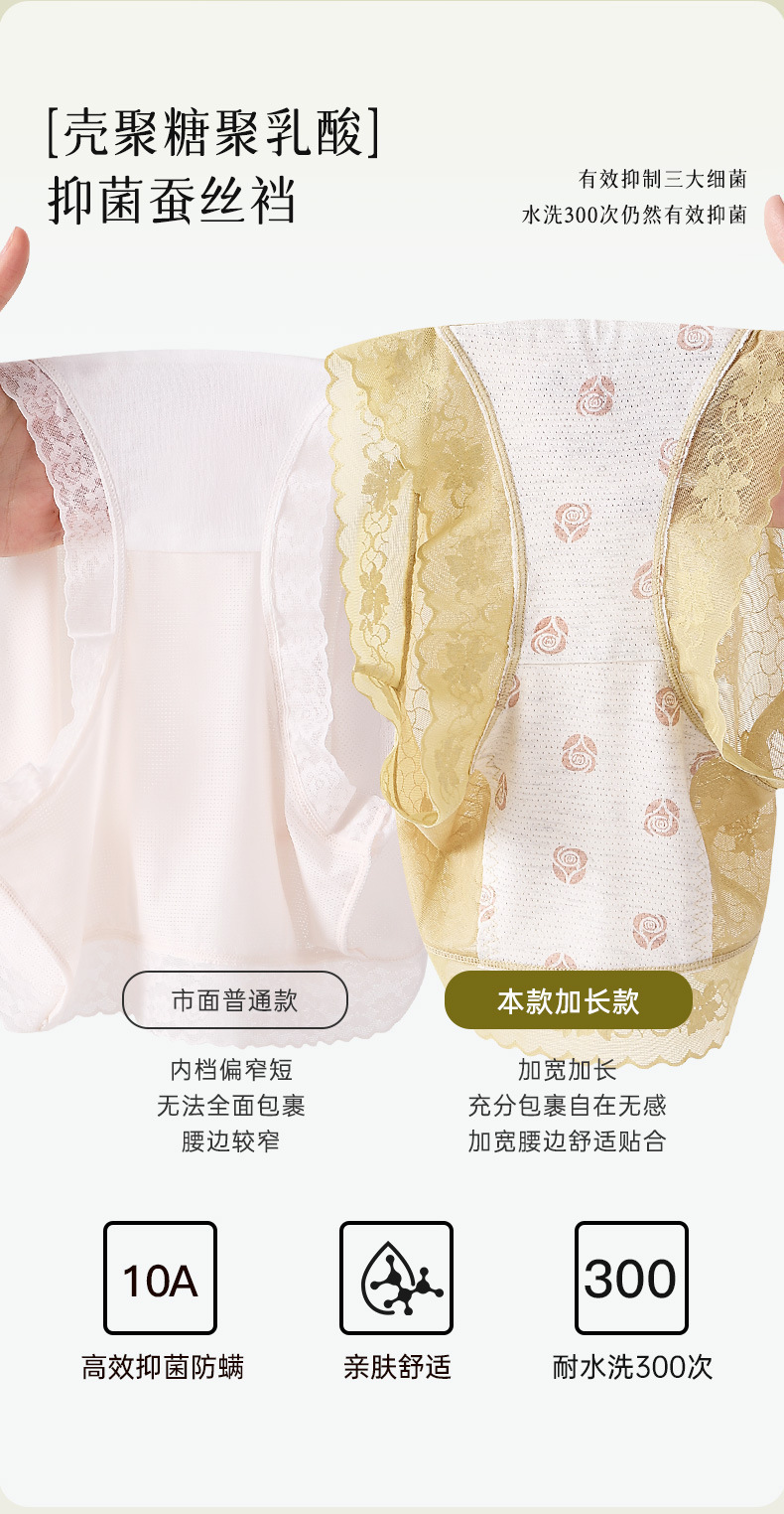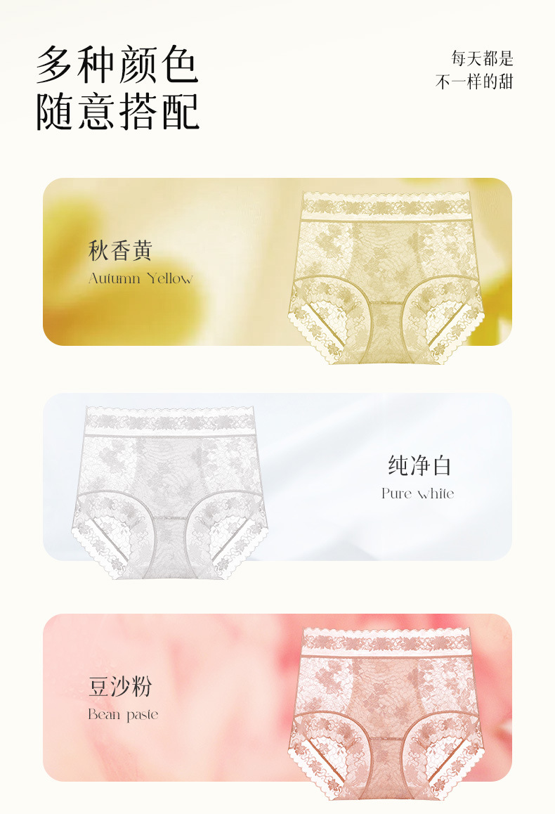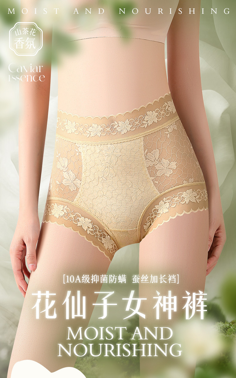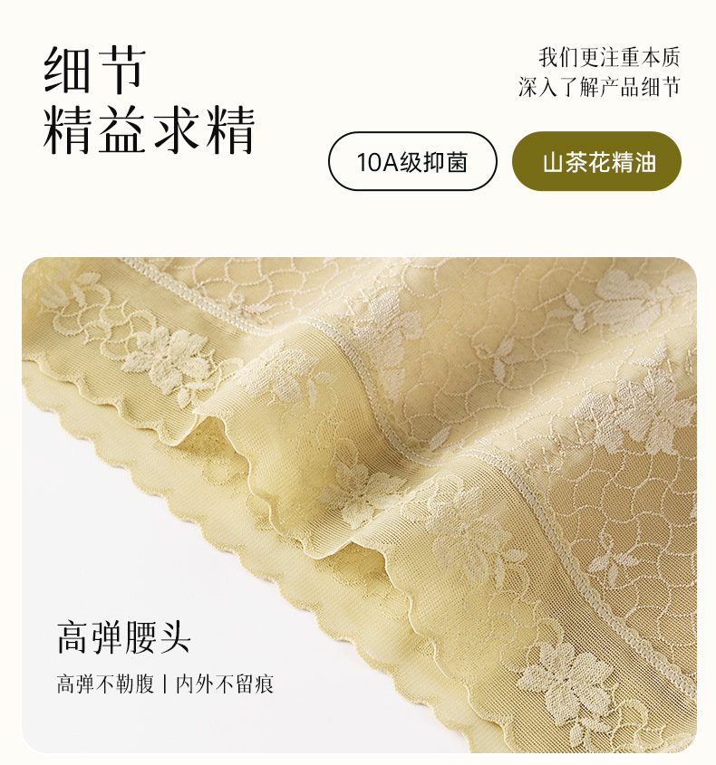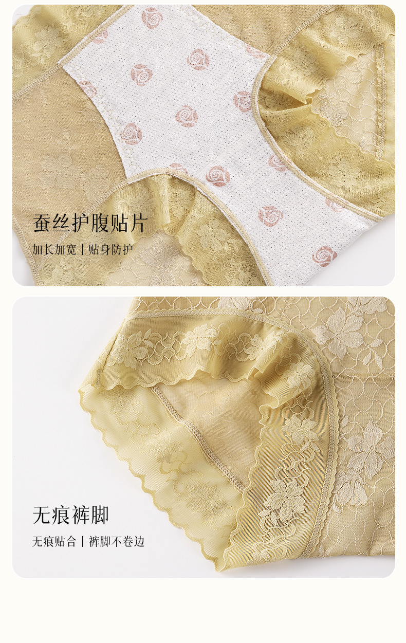 雀说 【4条】内裤女蕾丝中高腰收腹山茶花香氛10A抗菌桑蚕丝加长裆轻薄三角裤MZ8010-9