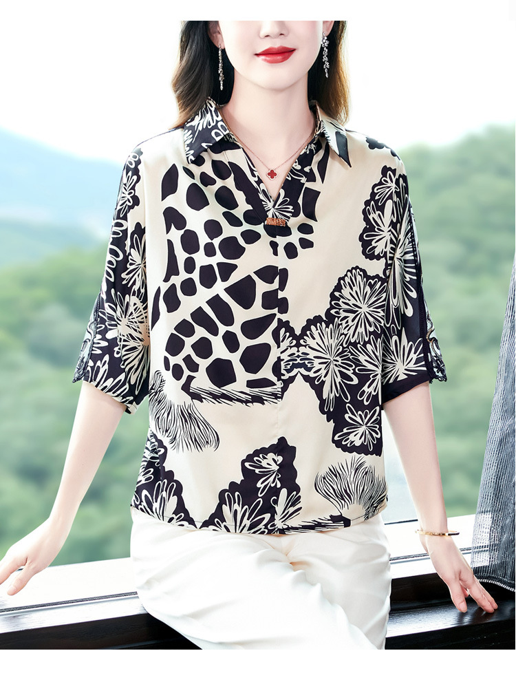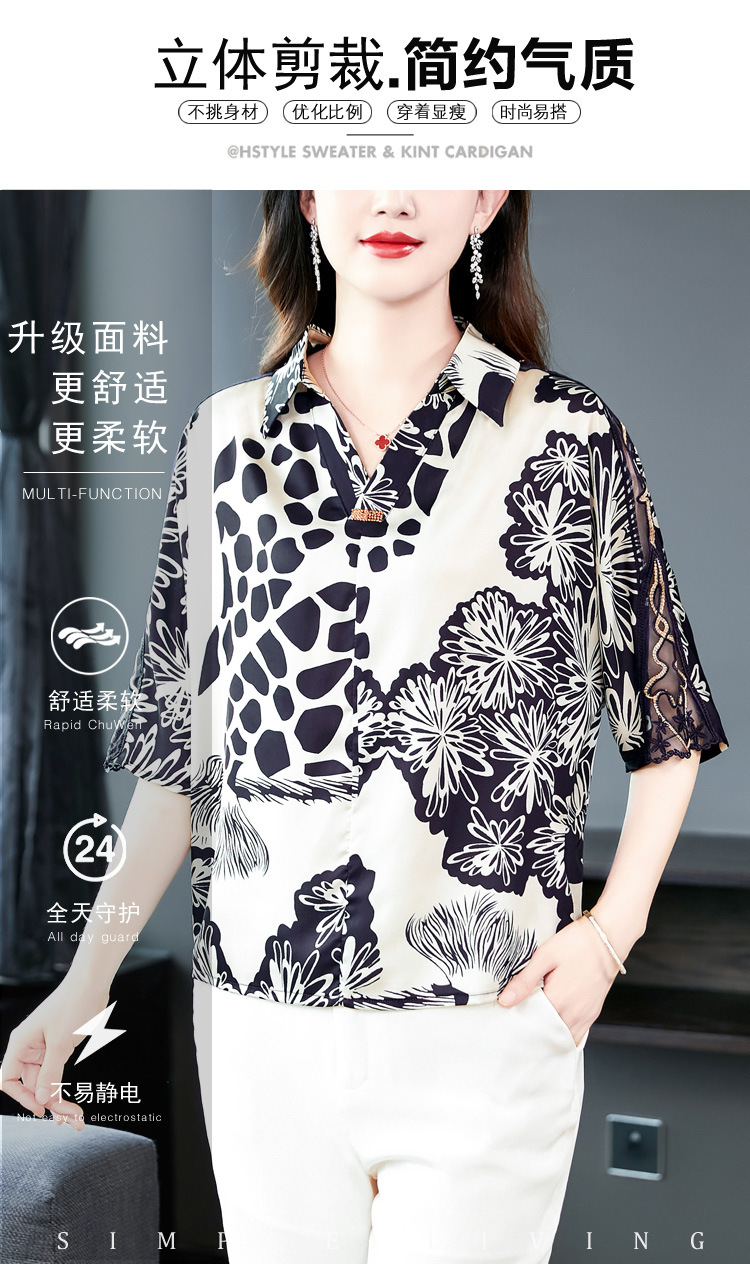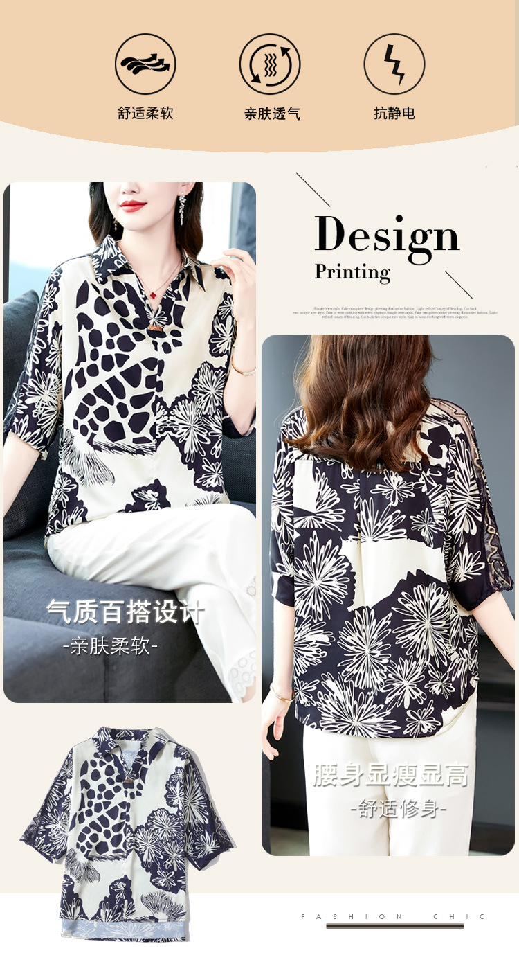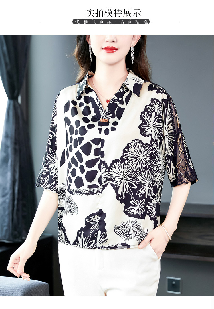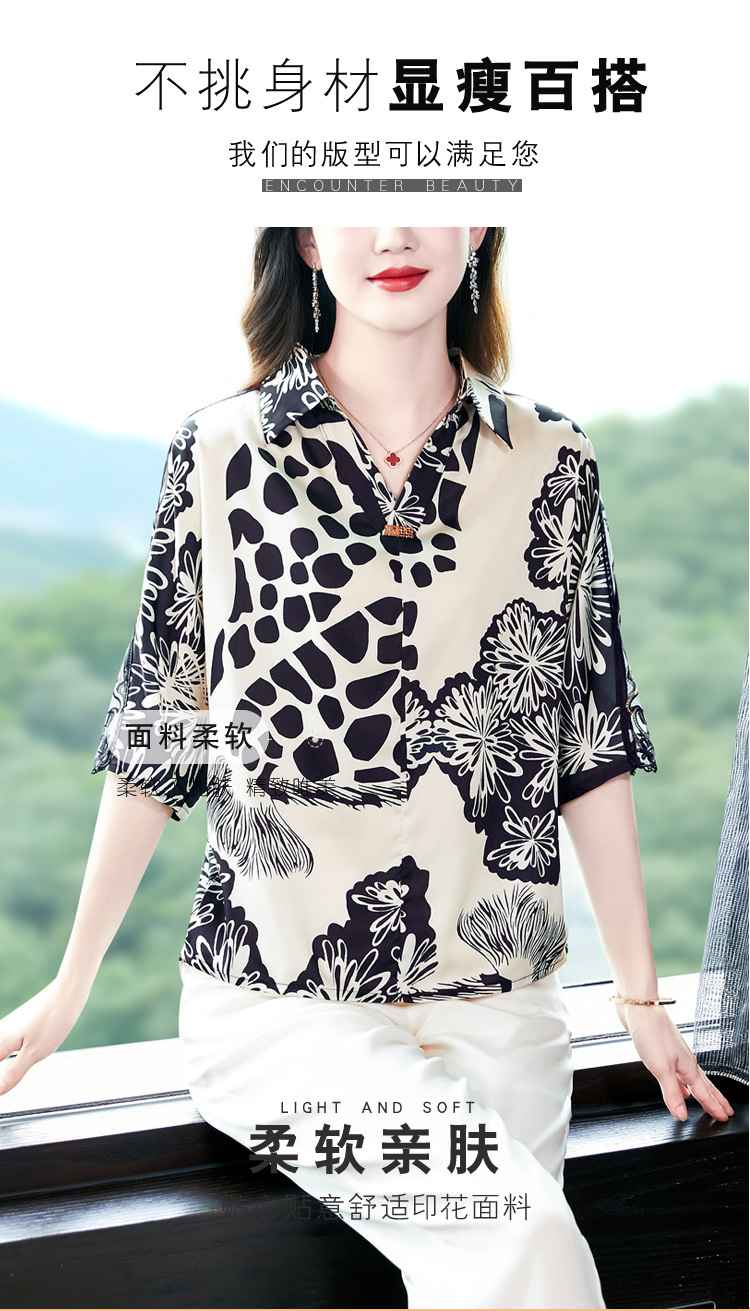 SMZ6011 2023新款夏装洋气百搭印花气质妈妈装雪纺衬衫Polo领短袖套头上衣