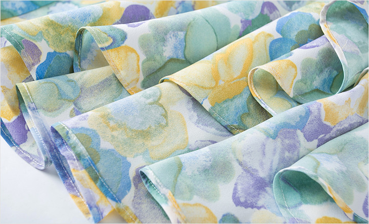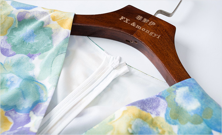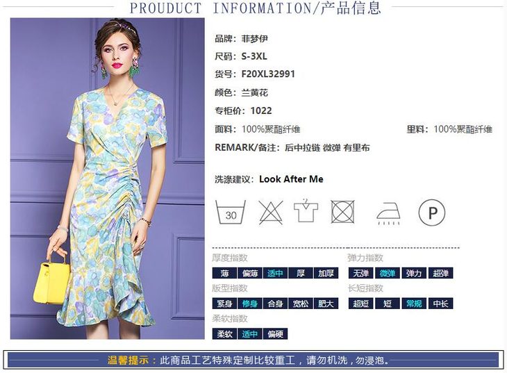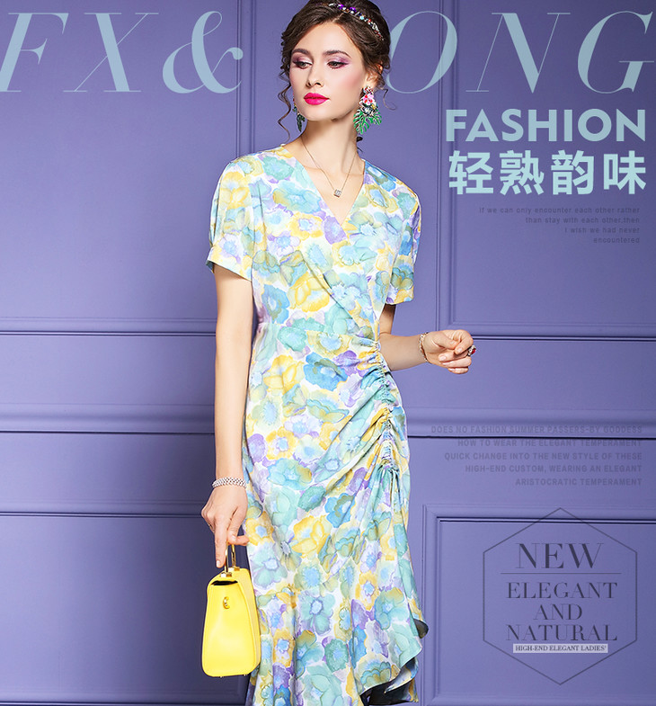 FMY-F20XL32991夏装洋气减龄V领修身褶皱鱼尾印花连衣裙