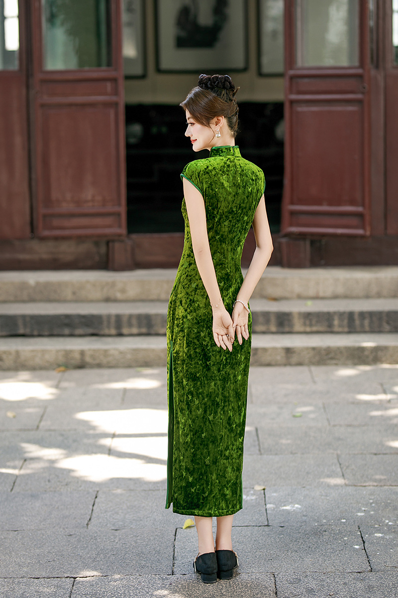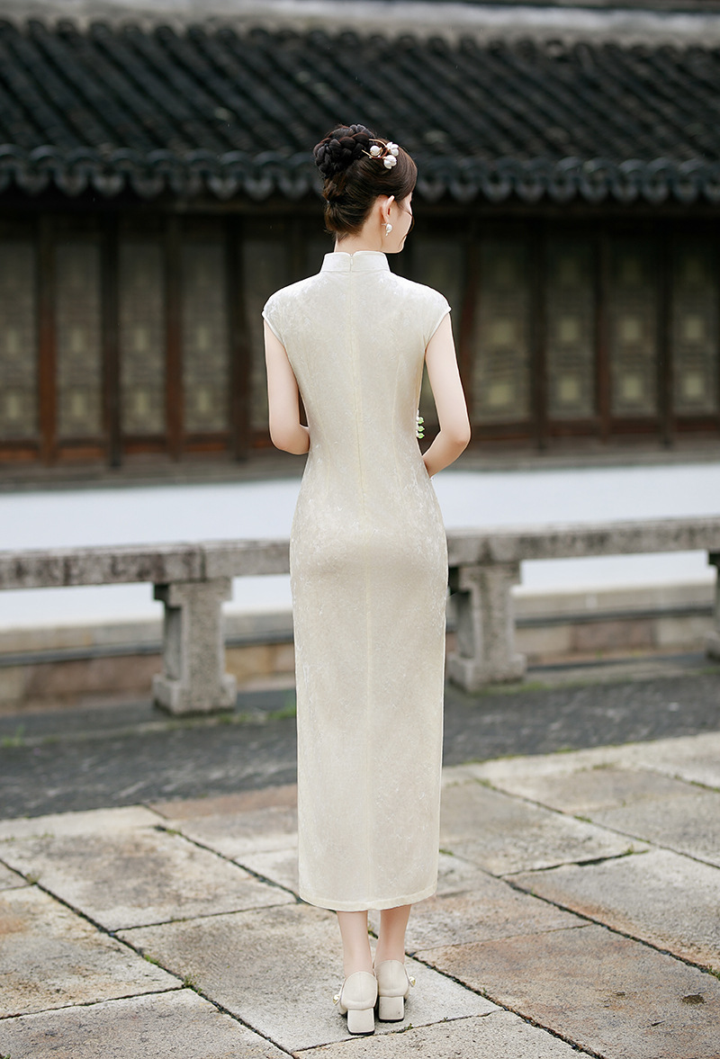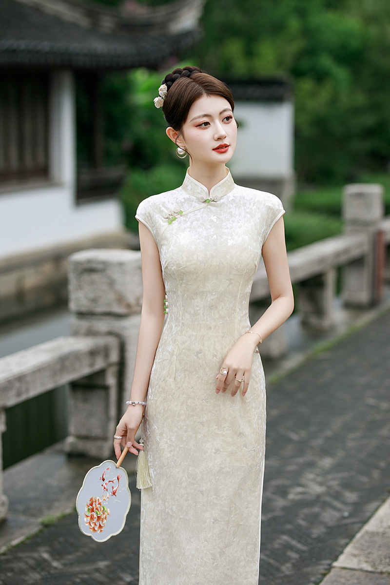2025早秋新款中国风印花醋酸冰花绒长款短袖复古旗袍女装改良显瘦8939