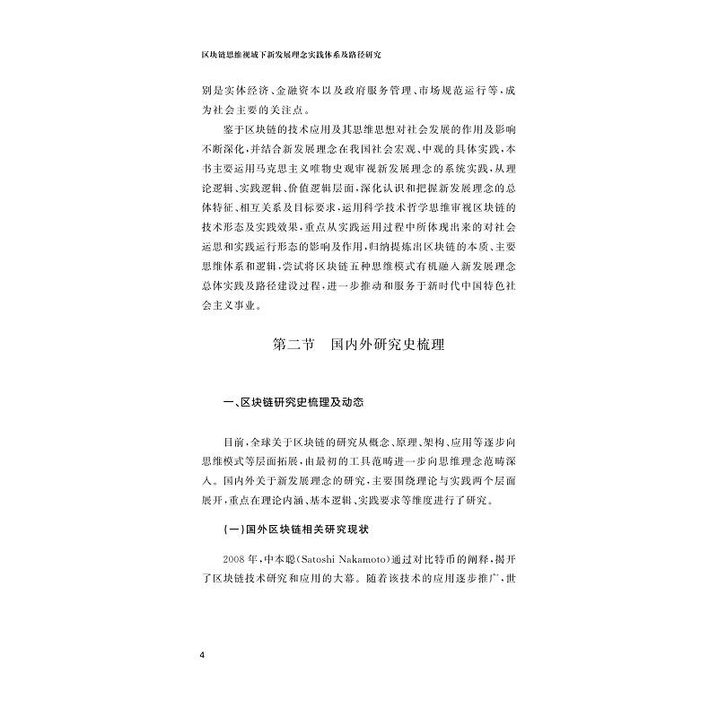 本书运用马克思主义唯物史观审视新发展理念的系统实践,从理论逻辑、实践逻辑、价值逻辑层面,深化认识和把握新发展理念的总体特征、相互关系及目标要求,运用科学技术哲学思维审视区块链的技术形态及实践效果,重点从实践运用过程中所体现出来的对社会运思及实践运行形态影响及改变作用,归纳提炼出区块链本质和主要思维体系及逻辑,尝试将区块链五种思维模式(平行思维、组织思维、系统思维、虚拟思维、混沌思维)有机融入新发展理念总体实践体系及路径建设过程中去,进一步推动和服务于新时代中国特色社会主义事业的建设发展。