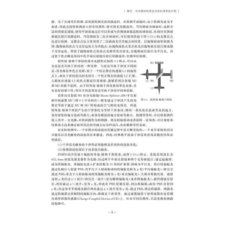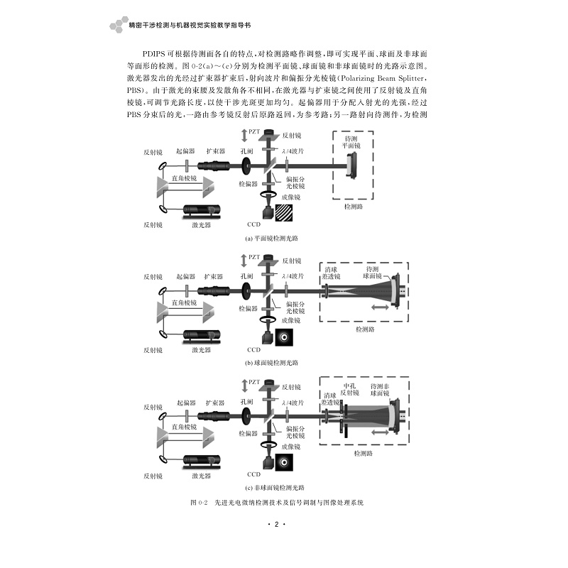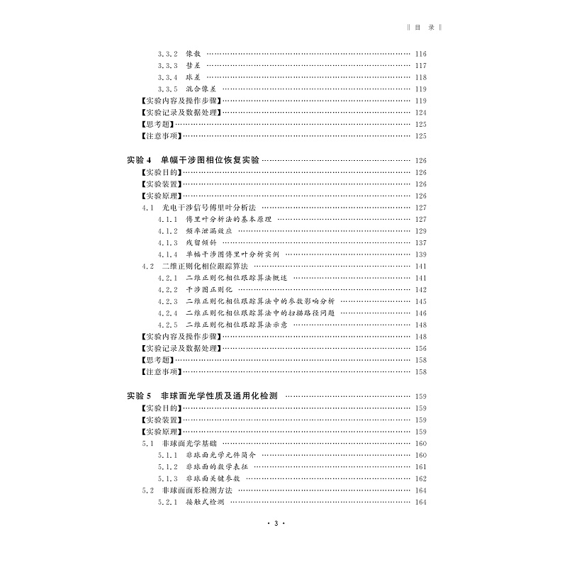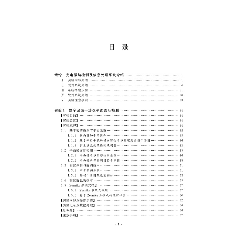 本书以自行研制的先进光电微纳检测技术及信号调制与图像处理系统为基础,开展6个光电微纳检测实验:①数字波面干涉仪检测平面镜面形;②偏振干涉图像调节及处理与系统误差标定;③数字波面干涉仪球面面形检测;④单幅干涉图相位恢复实验;⑤非球面光学性质及通用化检测;⑥非球面高精度零位干涉检测。通过实验,使学生深刻理解光机电算一体化检测系统“以光学原理为核心、电路控制为辅助、计算机及软件技术做提升”的特点,掌握光电干涉检测系统的调整和实验方法。