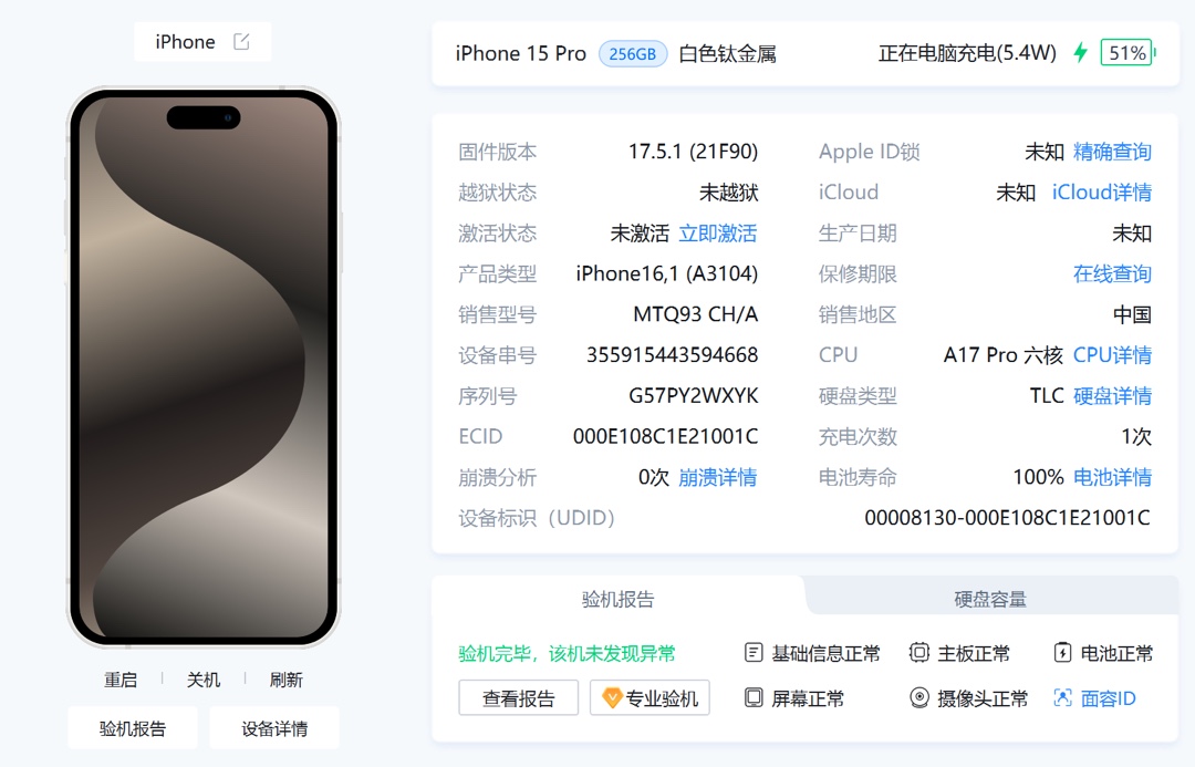编号594668-苹果国行库存机iPhone15Pro/256G/白色,5G手机,全新成色,原机电池100%,店保1年,特价6400元!