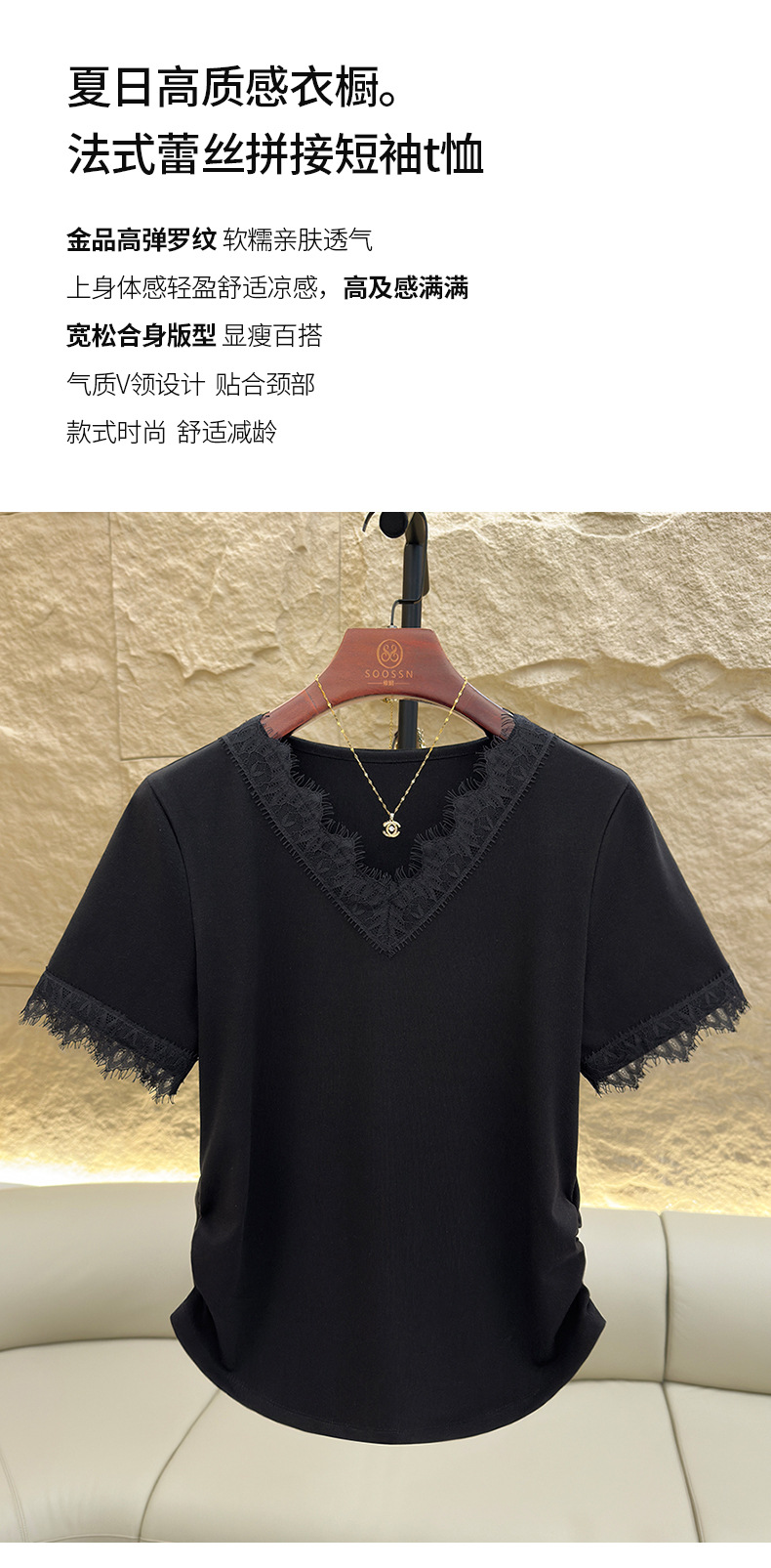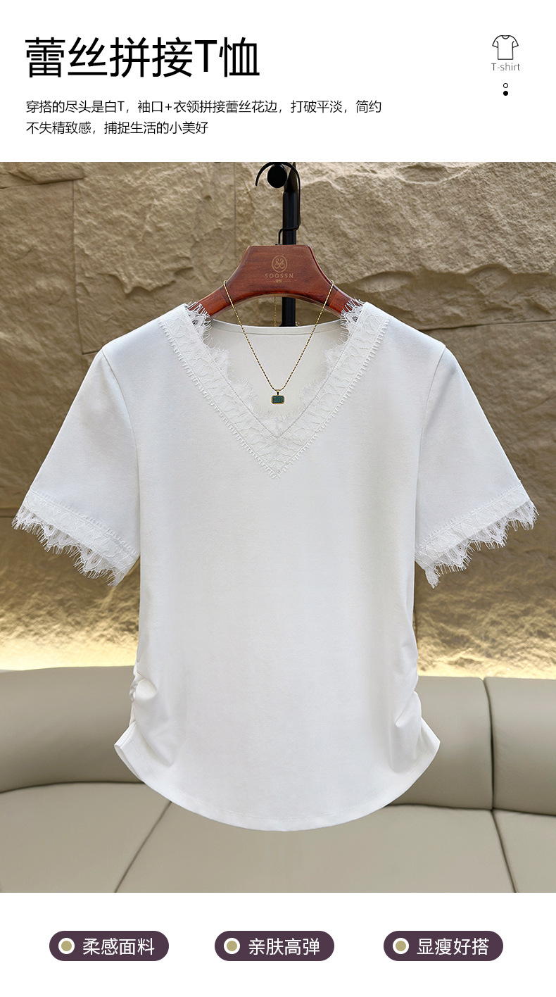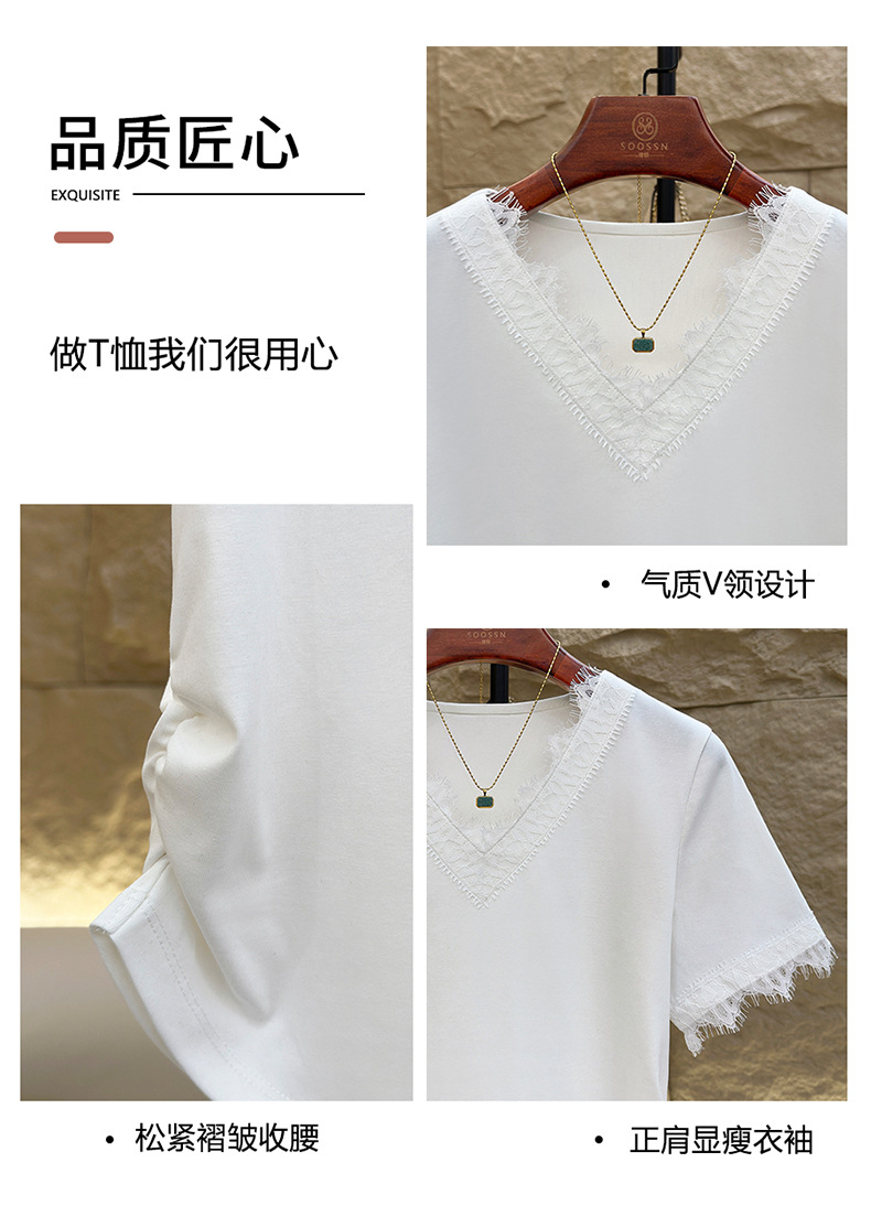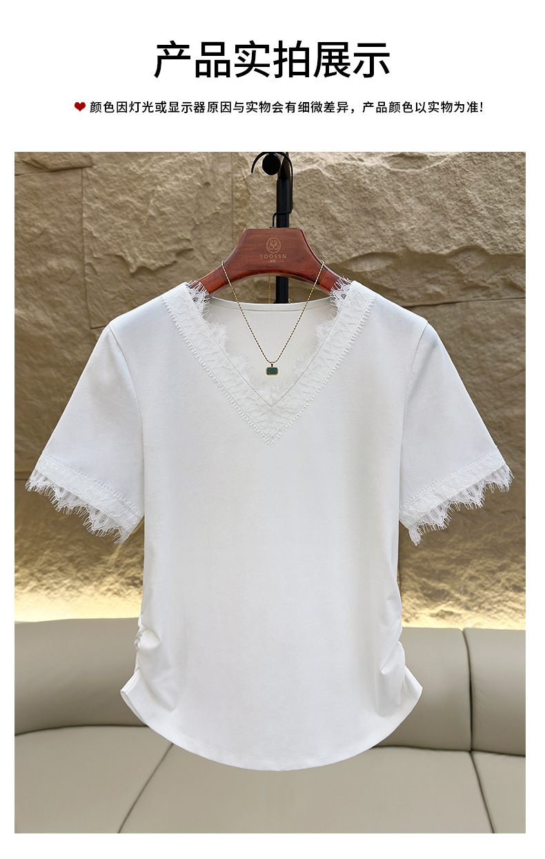 丁摩 法式气质蕾丝花边v领正肩短袖t恤女夏季新款显瘦上衣5ZF-M707