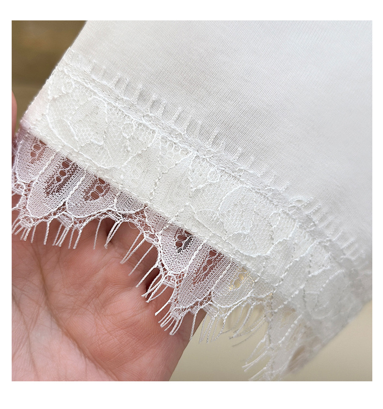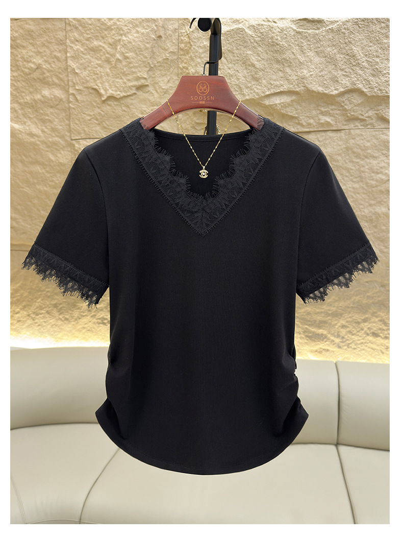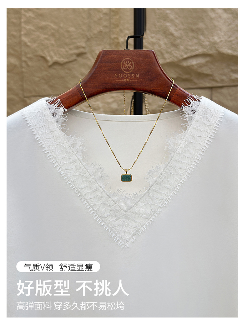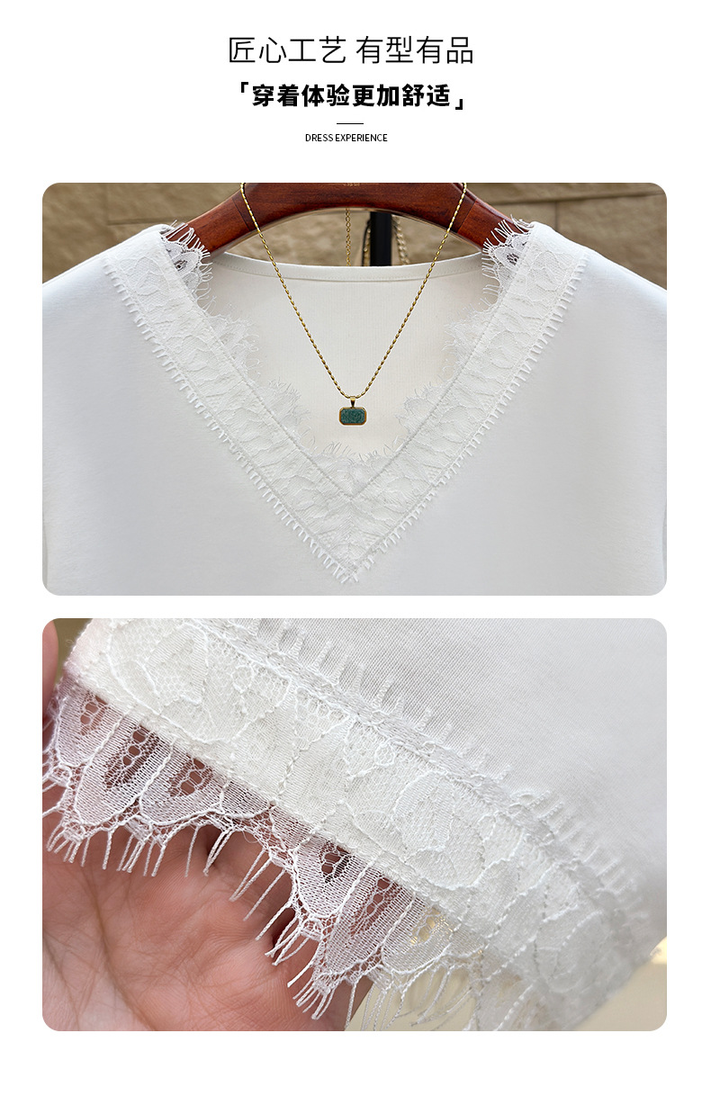 丁摩 法式气质蕾丝花边v领正肩短袖t恤女夏季新款显瘦上衣5ZF-M707
