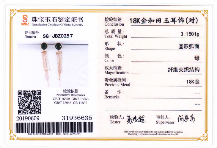 18K玫瑰金和田玉(碧玉)流苏耳环