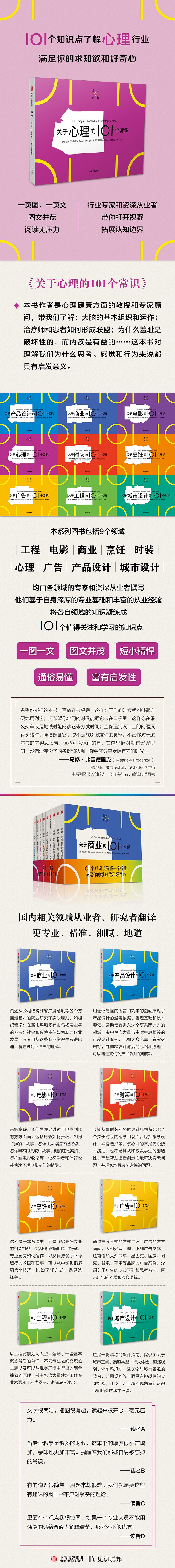 通识学院系列包括工程、电影、商业、烹饪、时装、心理、广告、产品设计、城市设计9个领域,由各领域的专家和资深从业者撰写。他们基于自身深厚的专业基础和丰富的从业经验,将各自领域的知识凝练成101个值得关注和学习的知识点。每个知识点以一页图一页文的形式呈现,图文并茂、短小精悍、通俗易懂,富有启发性。心理学为许多职业提供了方向,包括国际关系、公共卫生、社会工作、临床咨询、大脑研究、组织行为学、商业和广告。在这本书中,作者带我们了解:大脑的基本组织和运作;治疗师和患者如何形成联盟;为什么羞耻感是无益的,而罪恶感是有益的……这本书对于理解我们为什么思考、感觉和行为来说都具有启发意义。