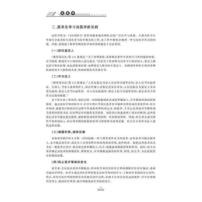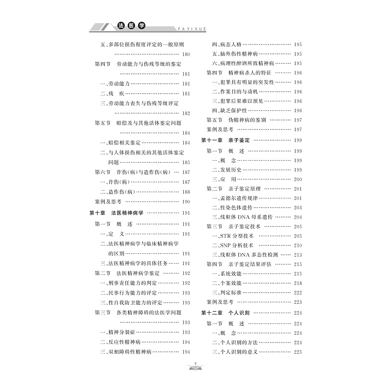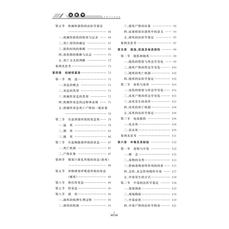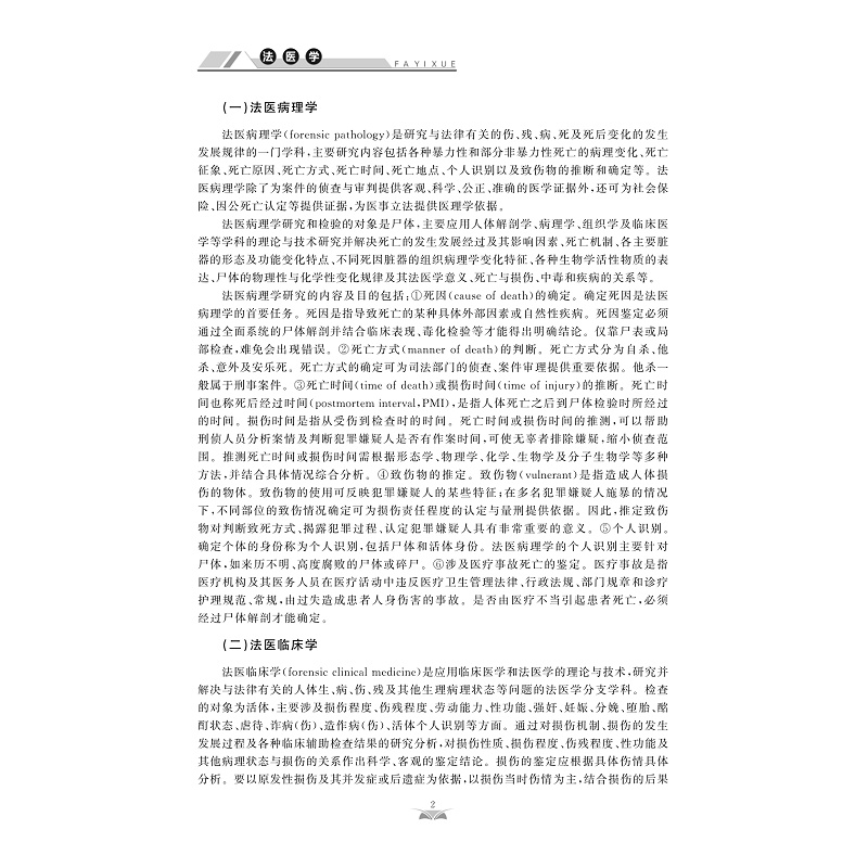 法医学是应用医学与其他自然科学理论与技术,研究并解决法律实践中有关医学问题的一门医学学科。法医学属于应用性科学,它能为司法部门提供科学依据,及时揭露犯罪,增强医生责任心,减少医疗事故的发生,协助有关部门解决司法实践中医学鉴定的有关问题。包括绪论、死亡及死后变化、法医病理学、法医临床学、法医物证学、法医毒理学、猝死、法医精神病学、医疗纠纷及法医学鉴定等章节内容。本书属于再版教材,初次出版是在2003年由人民军医出版社出版,面向普通高等医学院校非法医学专业师生、社会鉴定机构工作人员、爱好法医学的其他人员等。本教材内容涵盖面广,趣味性强,有较强的教学及实用价值。