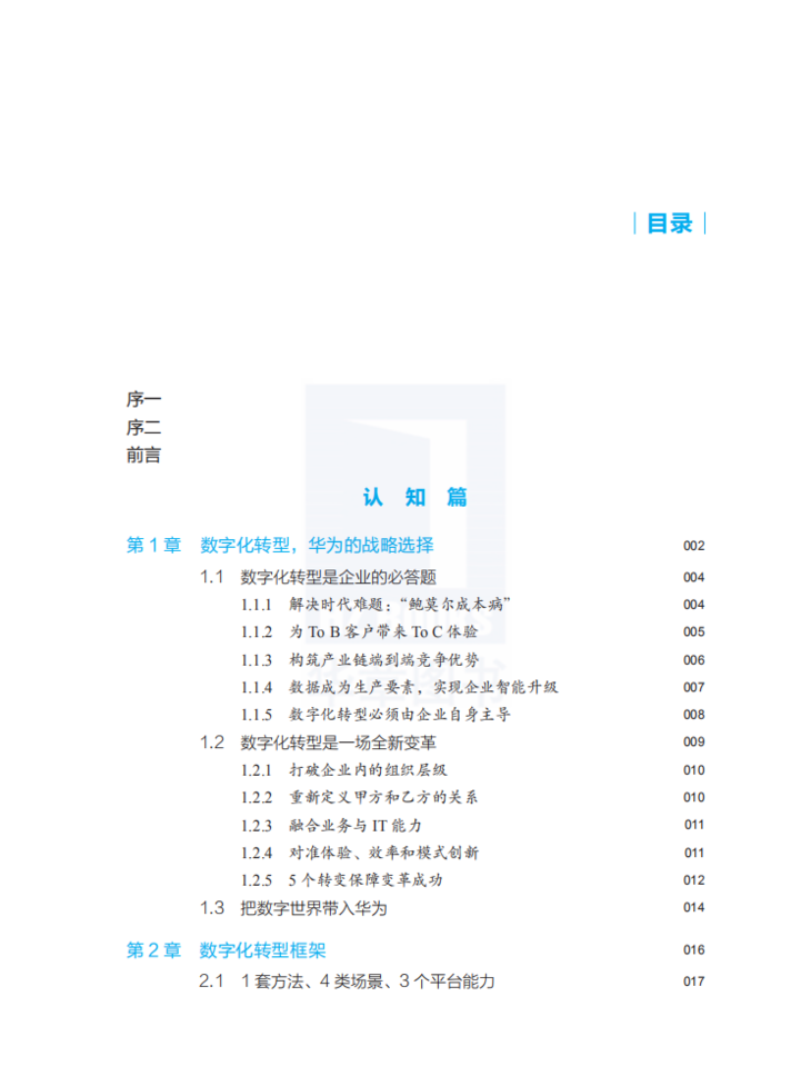 第1章从华为的视角明确了数字时代的一些共识,即数字化转型已成为企业的战略选择,同时也是企业的一场全新变革,为此企业需要主导自身的数字化转型并实现5个转变。