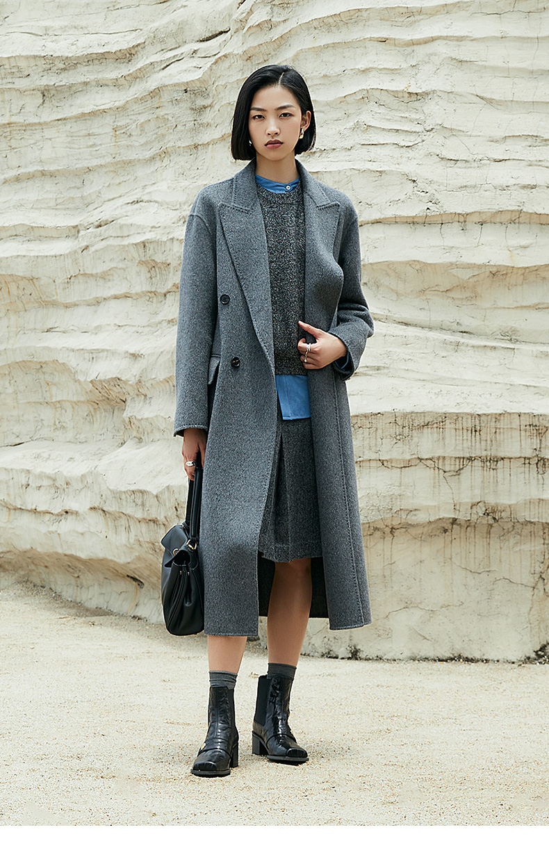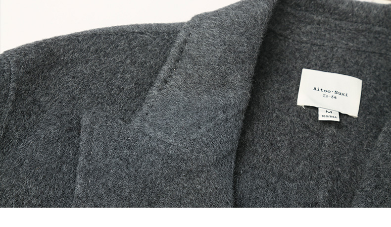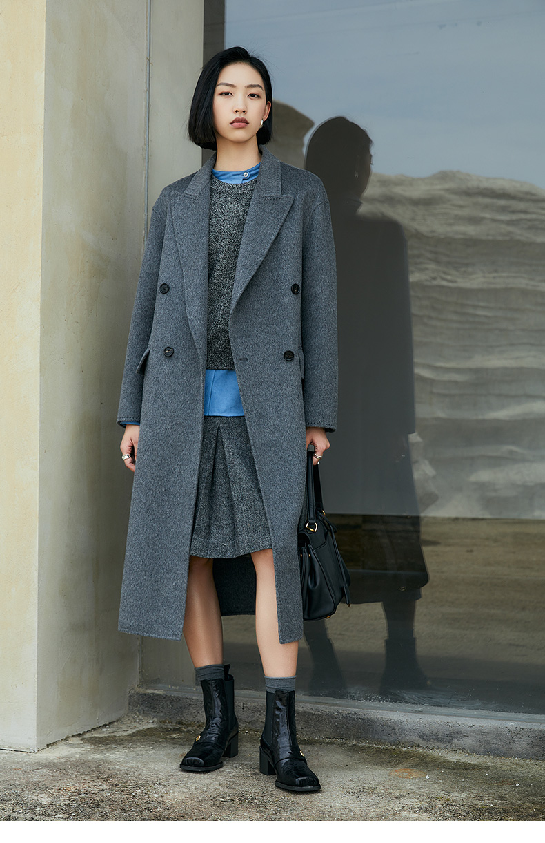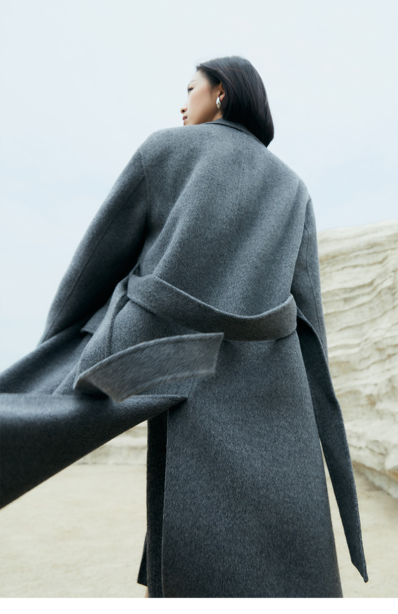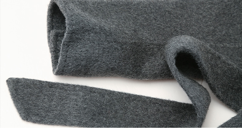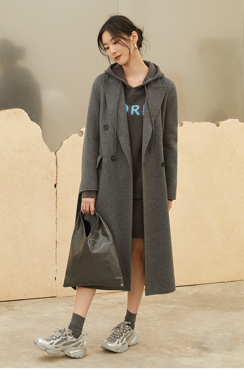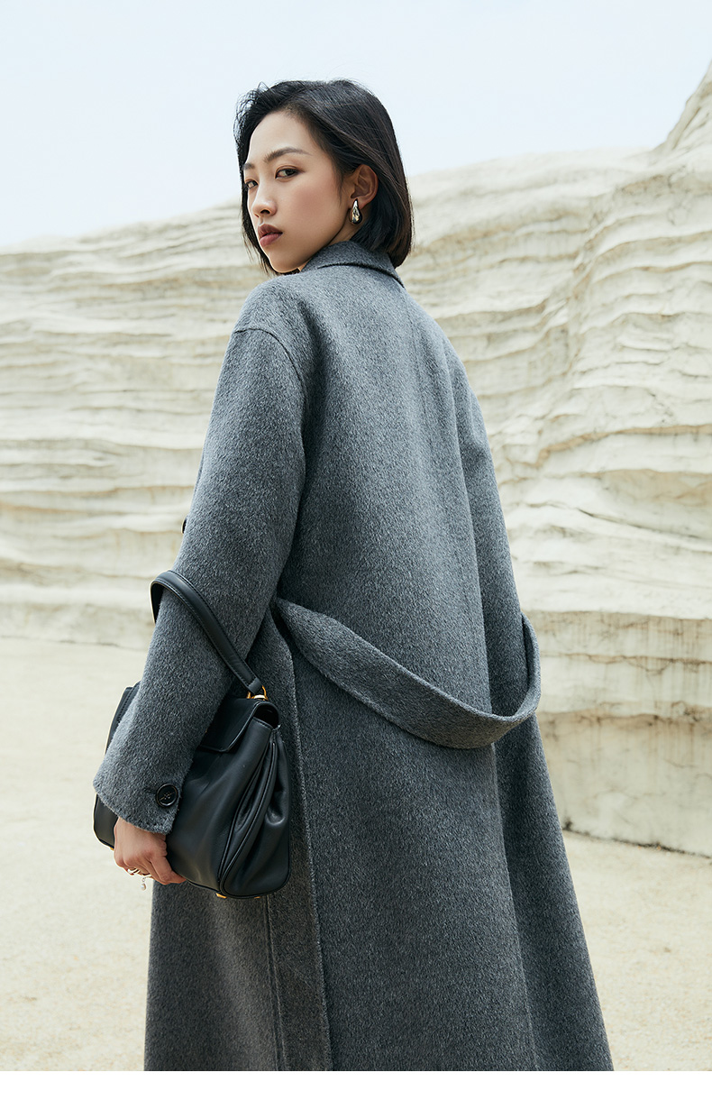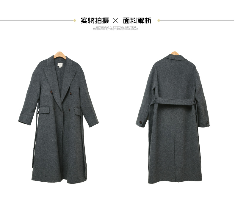 秋冬新款灰色双面呢大衣女中长款气质西装领双排扣收腰系带毛呢外套