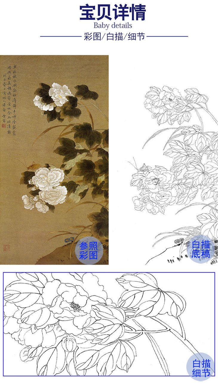 竖幅工笔四尺六尺花鸟白描底稿-牡丹-王庆升《御花园白牡丹》-RT07
