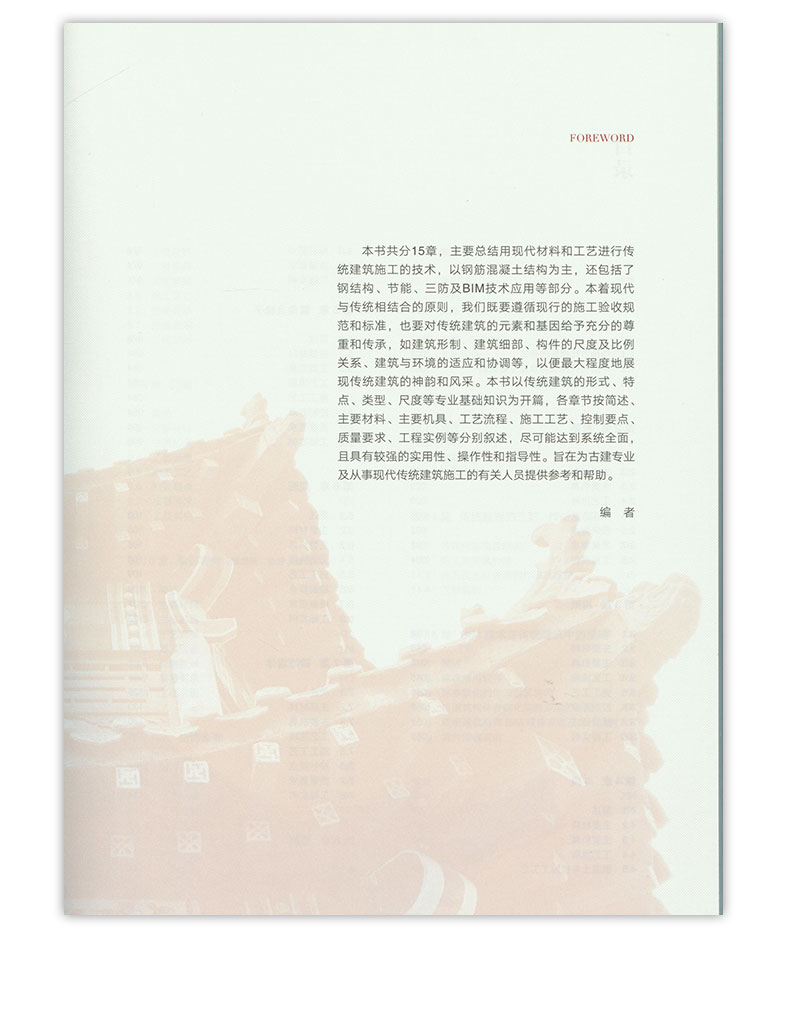 本书共分十五章,主要总结用现代材料和工艺进行传统建筑施工的技术,以钢筋混凝土结构为主,还包括了钢构、节能、三防及BIM技术应用等部分。本着现代与传统相结合的原则,我们既要遵循现行的施工验收规范和标准,也要对传统建筑的元素和基因给予充分的尊重和传承,如建筑形制、建筑细部、构件的尺度及比例关系、建筑与环境的适应和协调等,以便最大限度地展现传统建筑的神韵和风,采本书以传统建筑的形式、特点、类型、尺度等专业基础知识为开篇,各章节按简述、材料、机具、工艺流程、施工工艺、控制要点、质量要求等分别叙述,具有系统性、操作性和指导性,选用的实例代表性强。