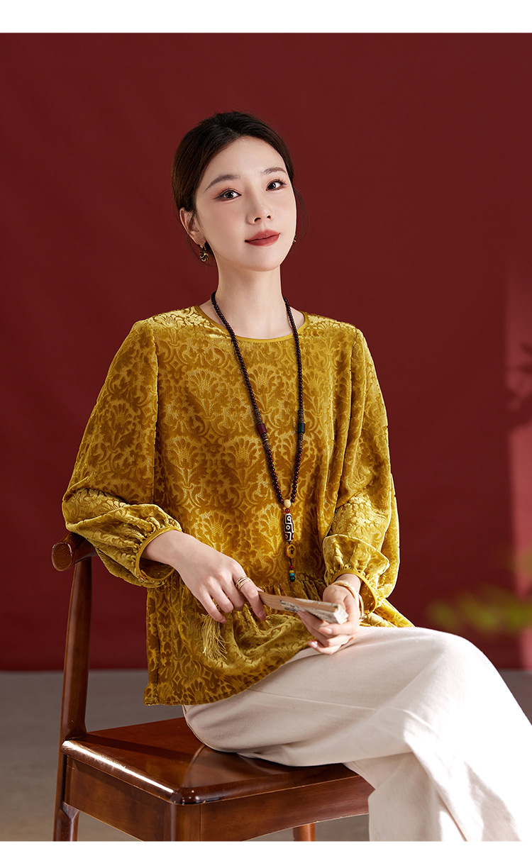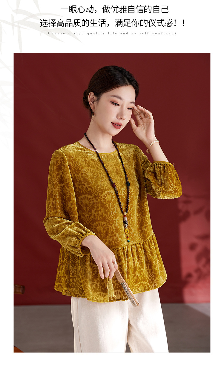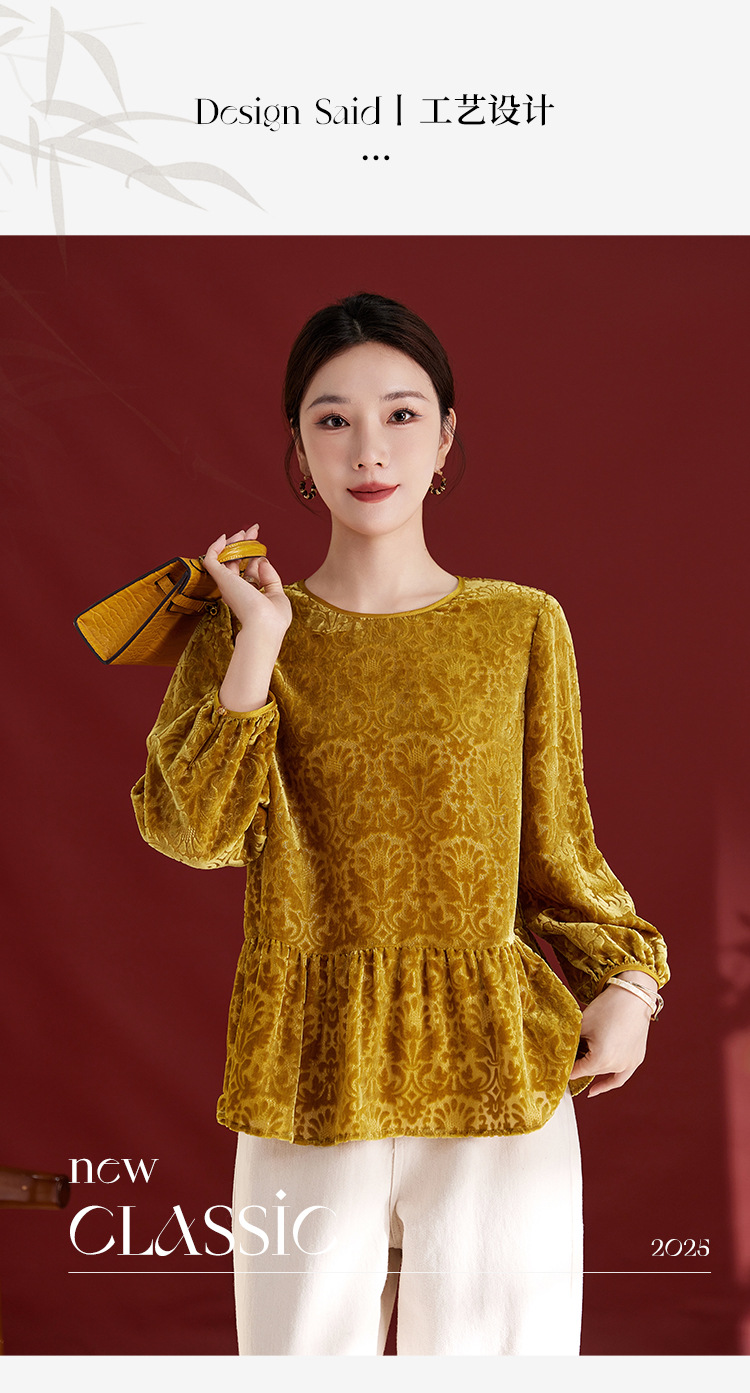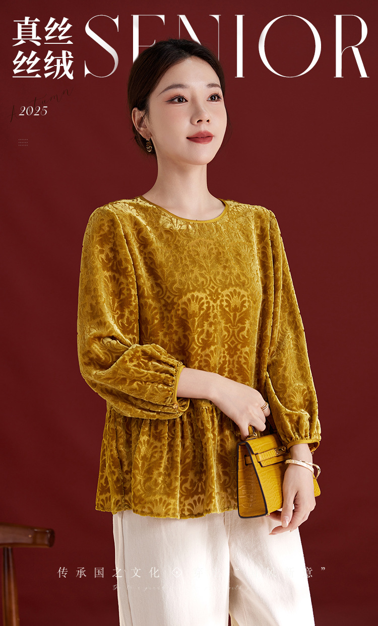 QS真丝丝绒女上衣年轻减龄款国风拼接印花长袖圆领款女上衣T恤1307
