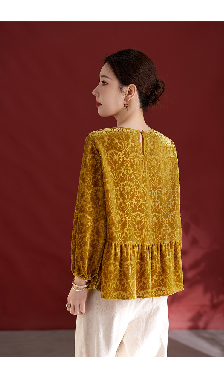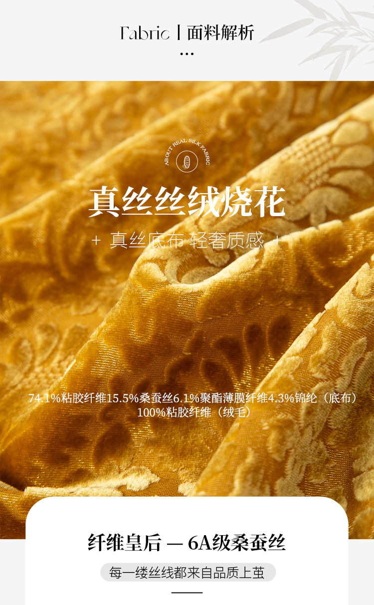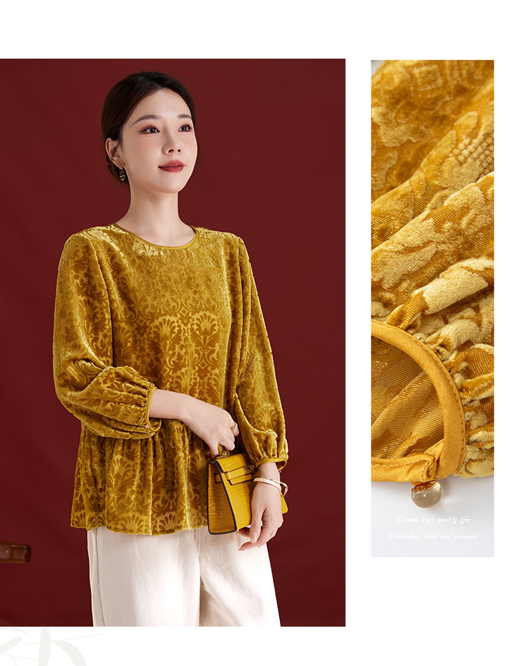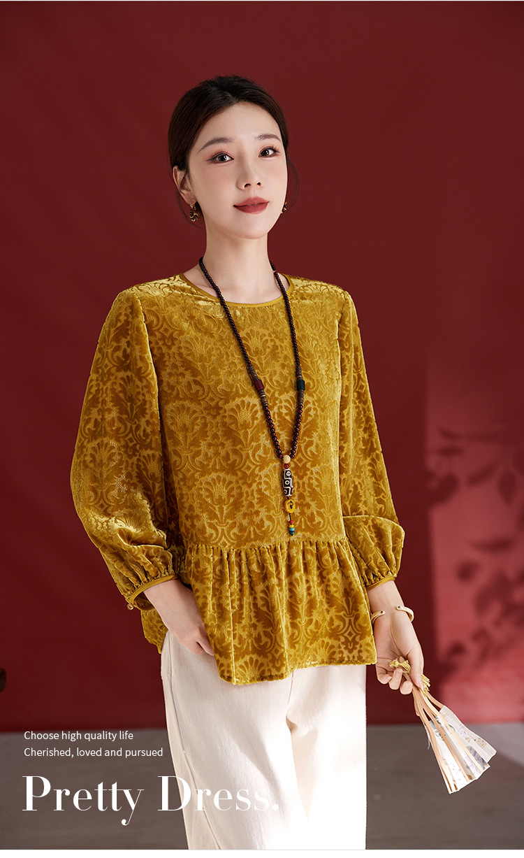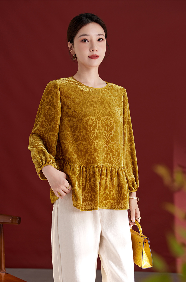 QS真丝丝绒女上衣年轻减龄款国风拼接印花长袖圆领款女上衣T恤1307