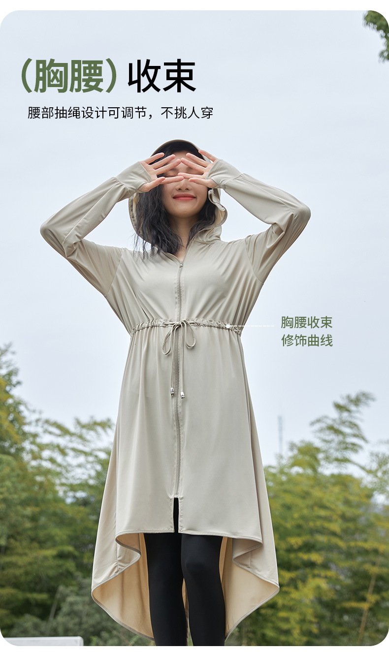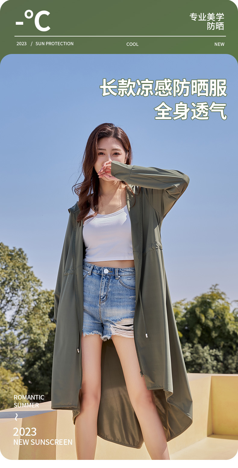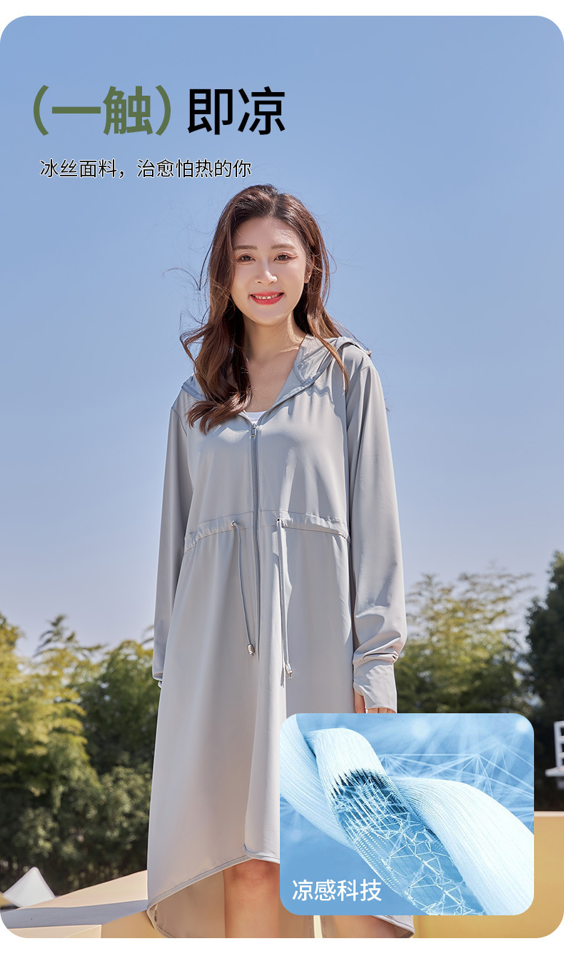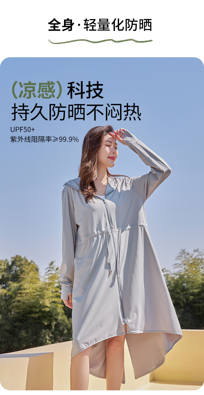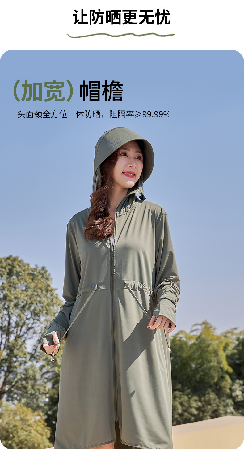 【长款凉感防晒服,全身透气~】夏季长款连帽防晒衣女 长袖遮阳宽松收腰显瘦 舒适出行休闲外套防晒-QQ