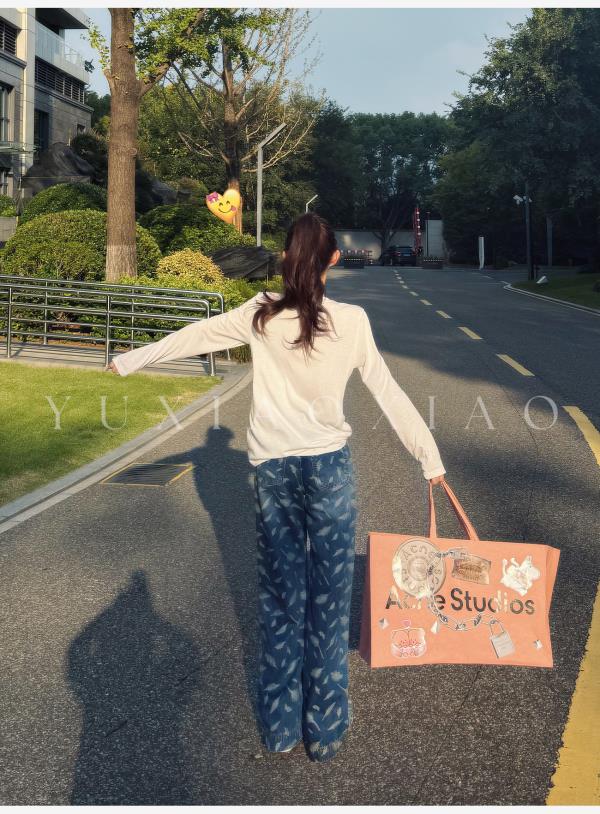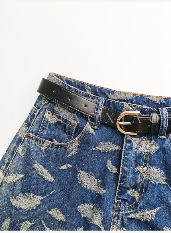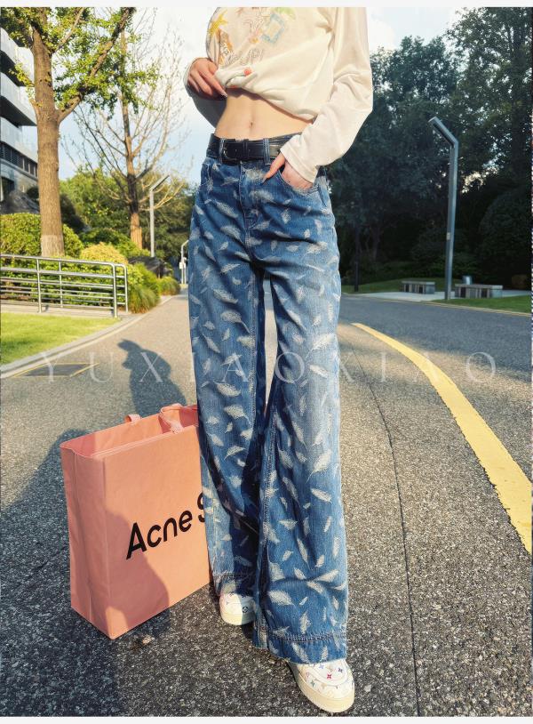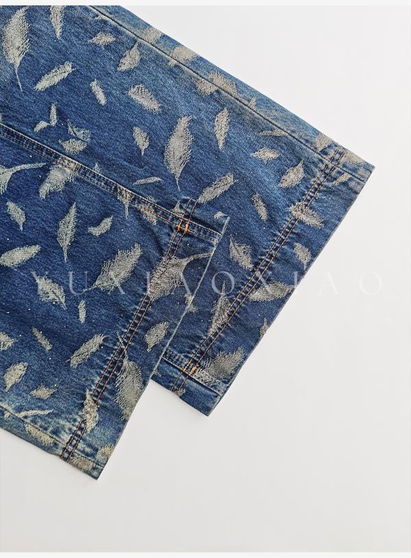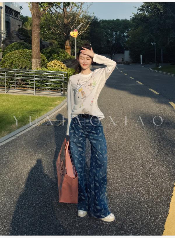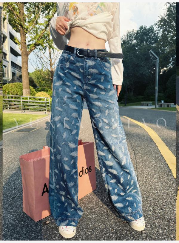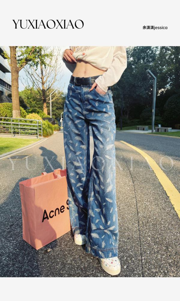余潇潇【飞羽情书】棉感精美羽毛印花挺括显瘦百搭显腿长直筒牛仔裤
