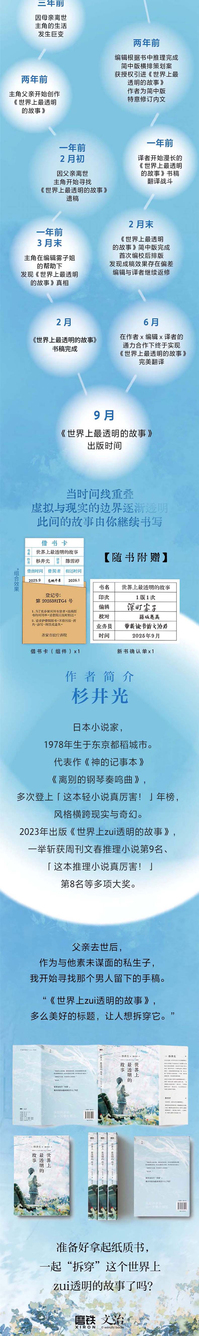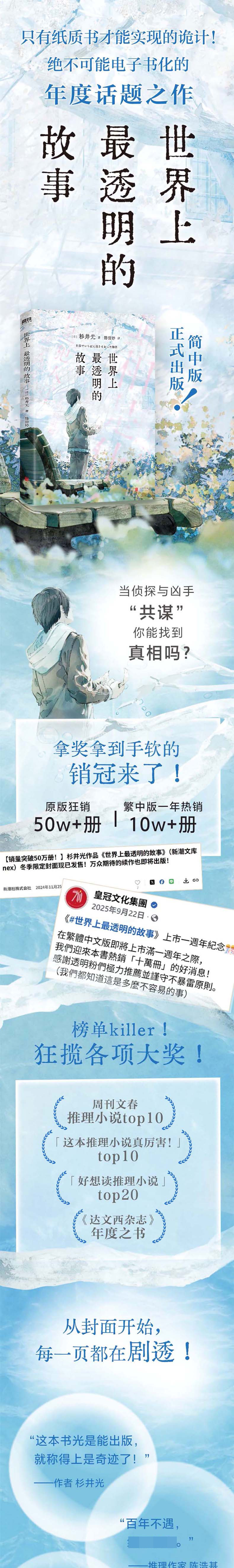 享誉文坛的知名推理作家宫内彰吾罹癌过世,他的长子主动联络上我——宫内彰吾的私生子。他说宫内死前,好像还持续在撰写一本名为《世界上最透明的故事》的小说。我那同父异母的哥哥看上高额的版税,想将之作为遗作出版,无奈一直找不到手稿。身为书店员工,我知道知名作家过世,正是拓展销量的机会,生前的作品将炙手可热。起初我站在如此功利主义的角度思考,但在得知宫内写作途中曾遭遇难以解释的瓶颈后,对小说本身产生了好奇。在欲望与业报尽头病倒的作家,临死之际最后的依托——世界上最透明的故事。我和编辑雾子姐展开调查,寻找未曾谋面的生父的遗作。我们询问了他的家人、编辑、情妇,然而随着拼凑出来的父亲形象逐渐清晰,我周遭的一切却开始变得透明……