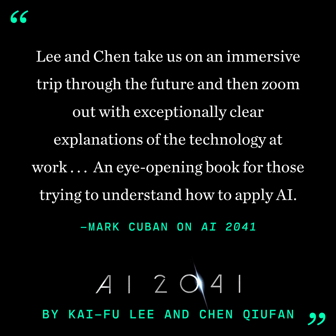 "Applying AI to business usually means learning the technology first and then figuring out how to apply it. AI 2041 allows readers to take the exact opposite approach. Through amazingly entertaining stories, Lee and Chen take us on an immersive trip through the future and then zoom out with exceptionally clear explanations of the technology at work. The result is an enjoyable and eye-opening book for those trying to understand how to apply AI." — Mark Cuban, businessman, entrepreneur and Owner of the NBA’s Dallas Mavericks, Shark on ABC’s “Shark Tank”, bestselling author of “How to Win at the Sport of Business”