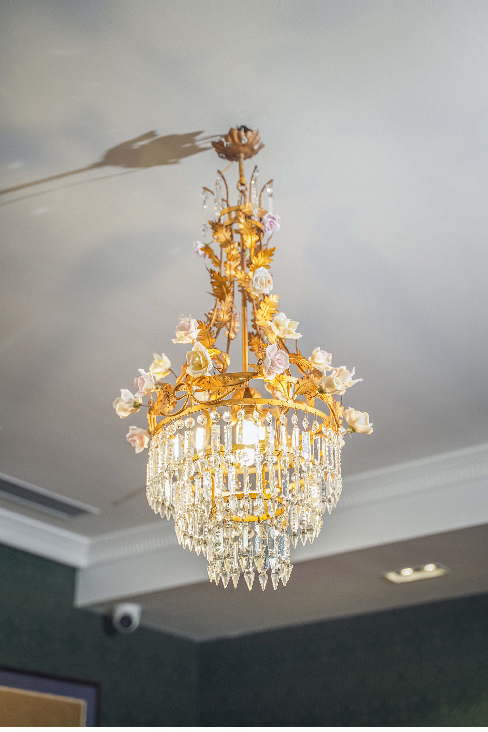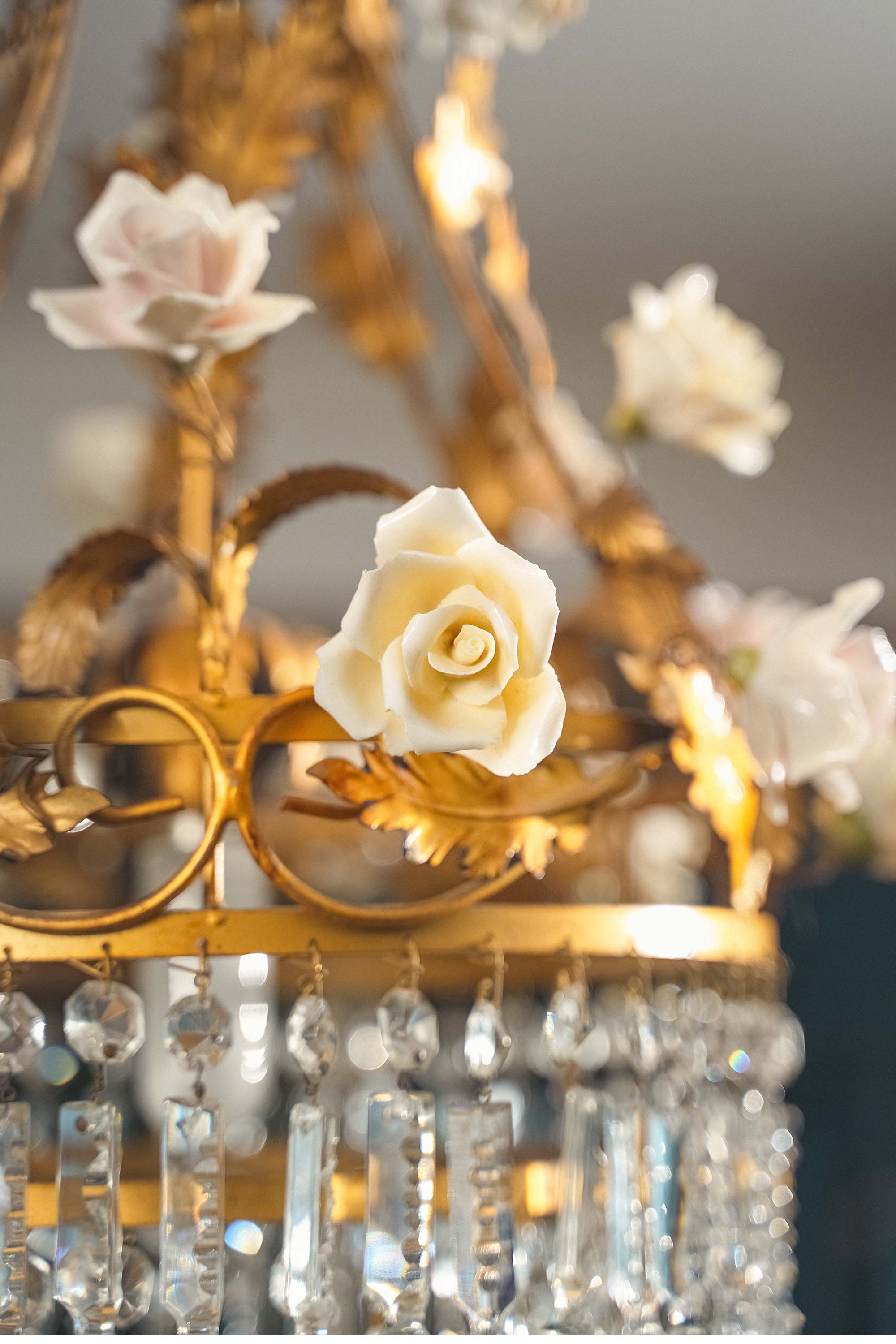 1880年代法国出品花卉造型瓷雕装饰繁枝卷叶主题铜鎏金精雕水晶吊灯