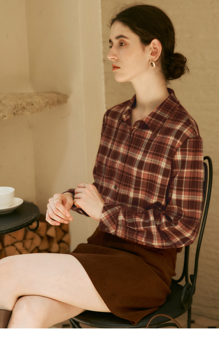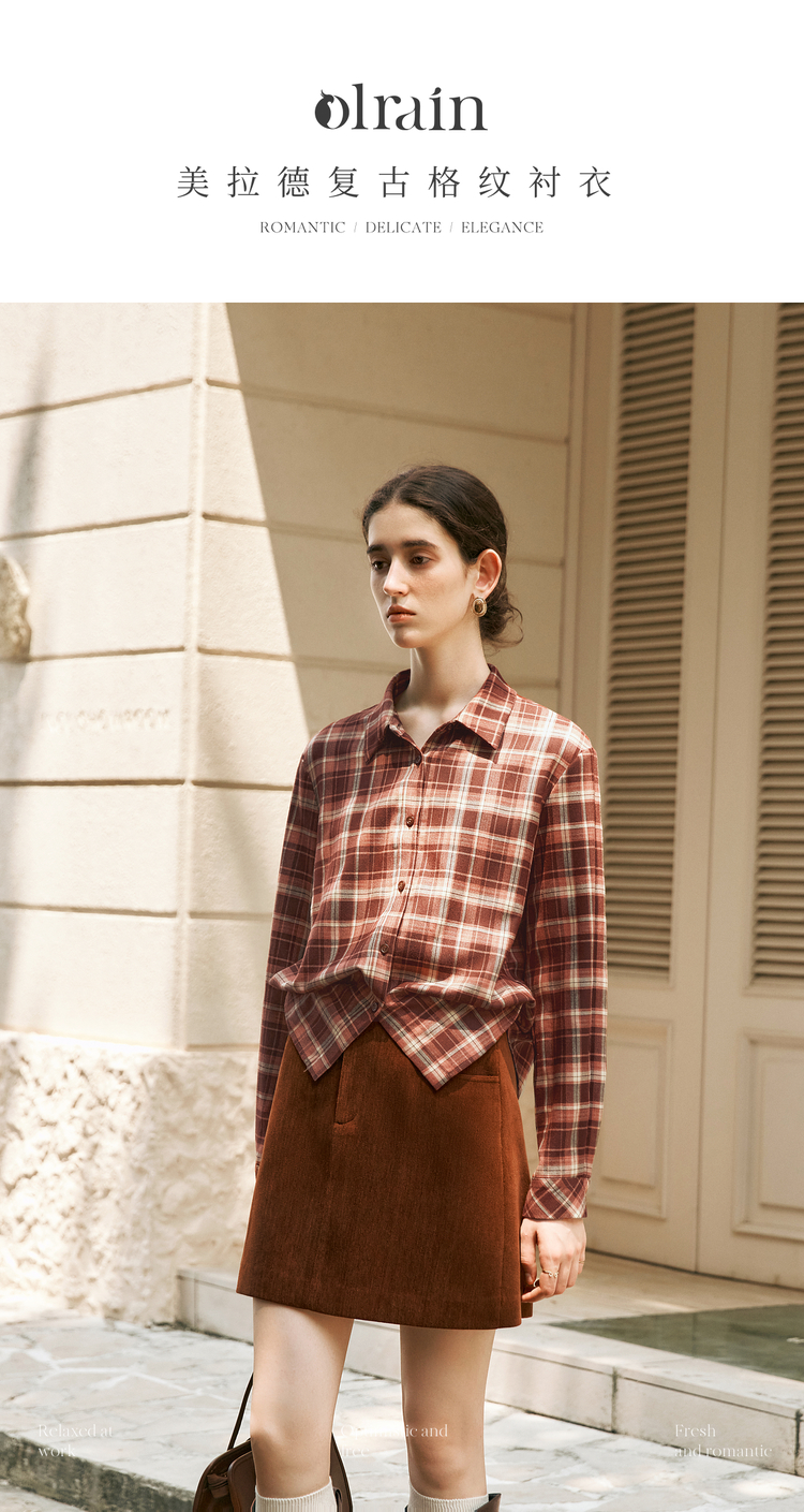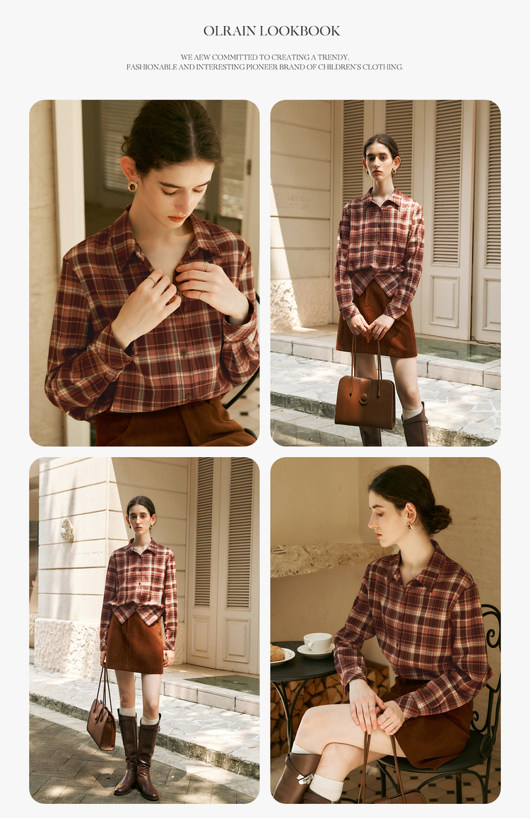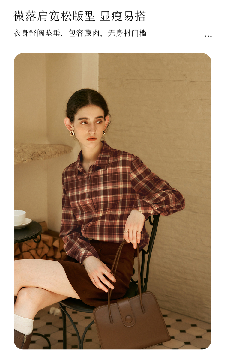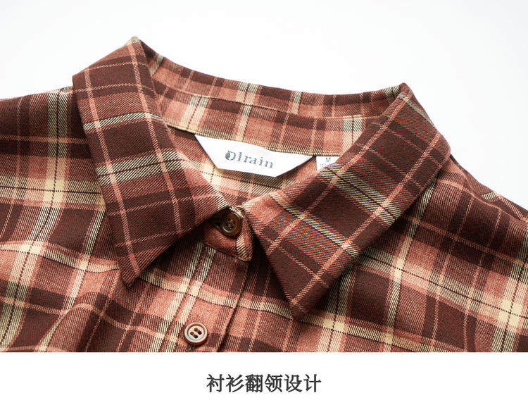 OLrain欧芮儿复古格纹衬衫女冬季2024年新款翻领宽松落肩长袖上衣