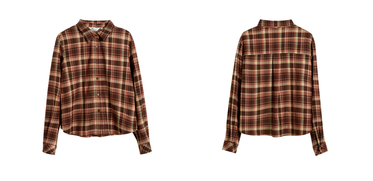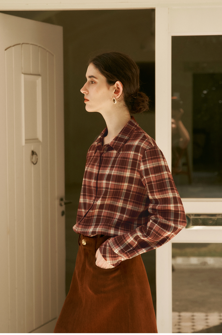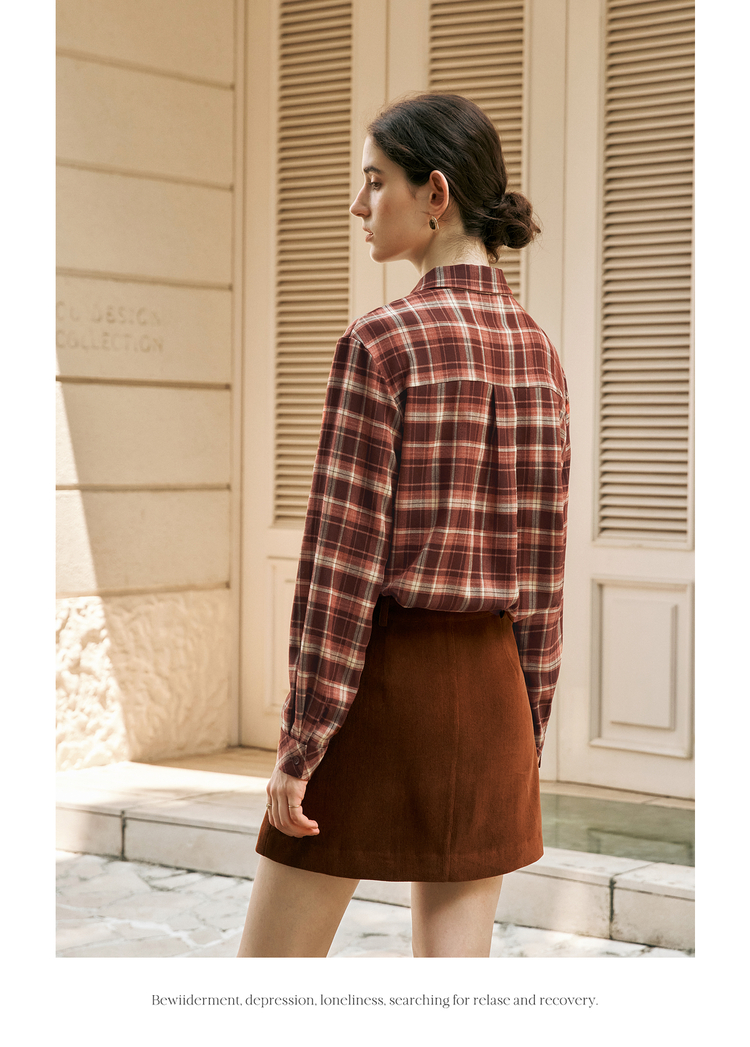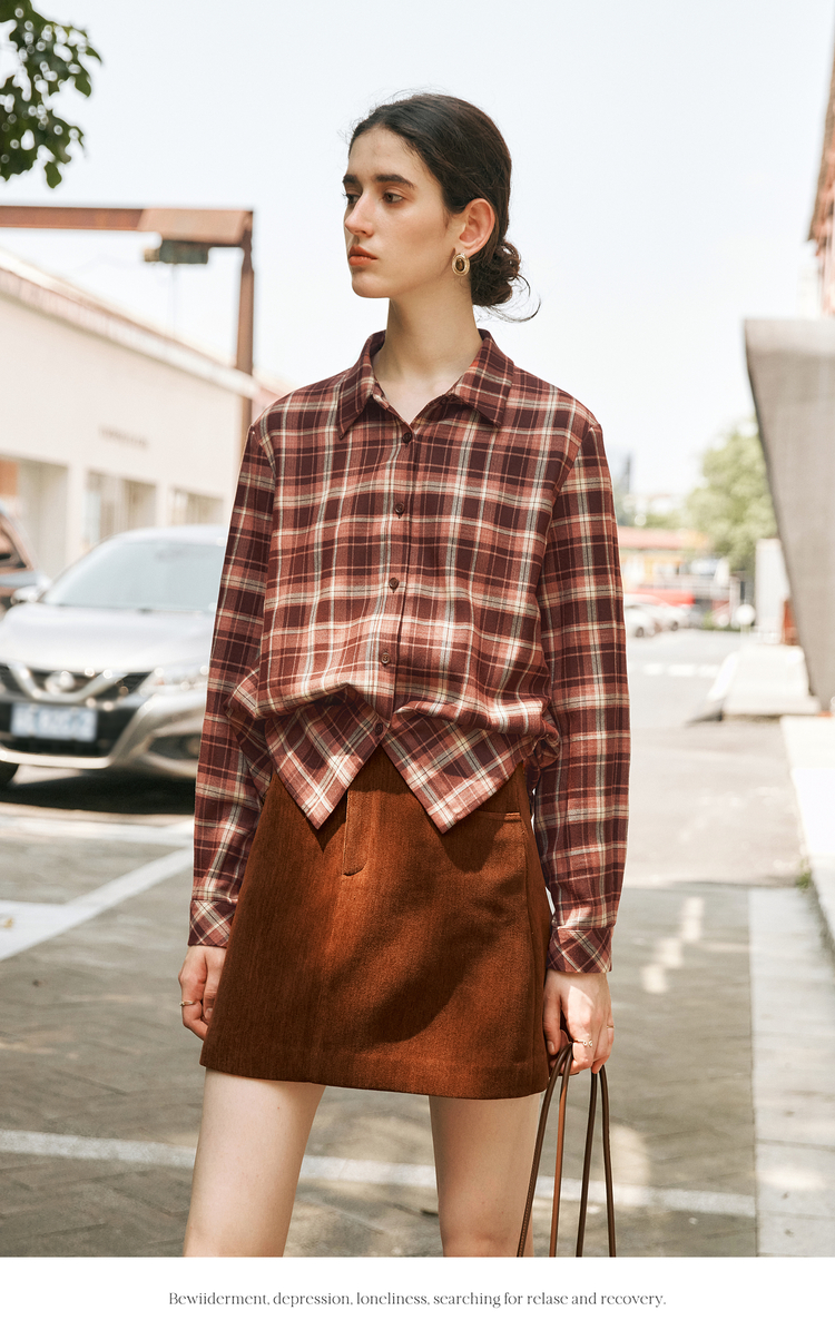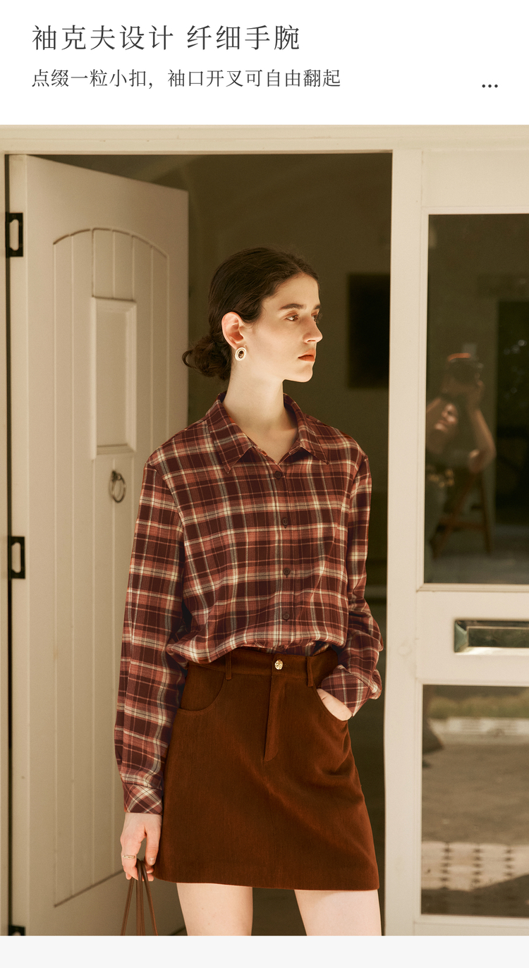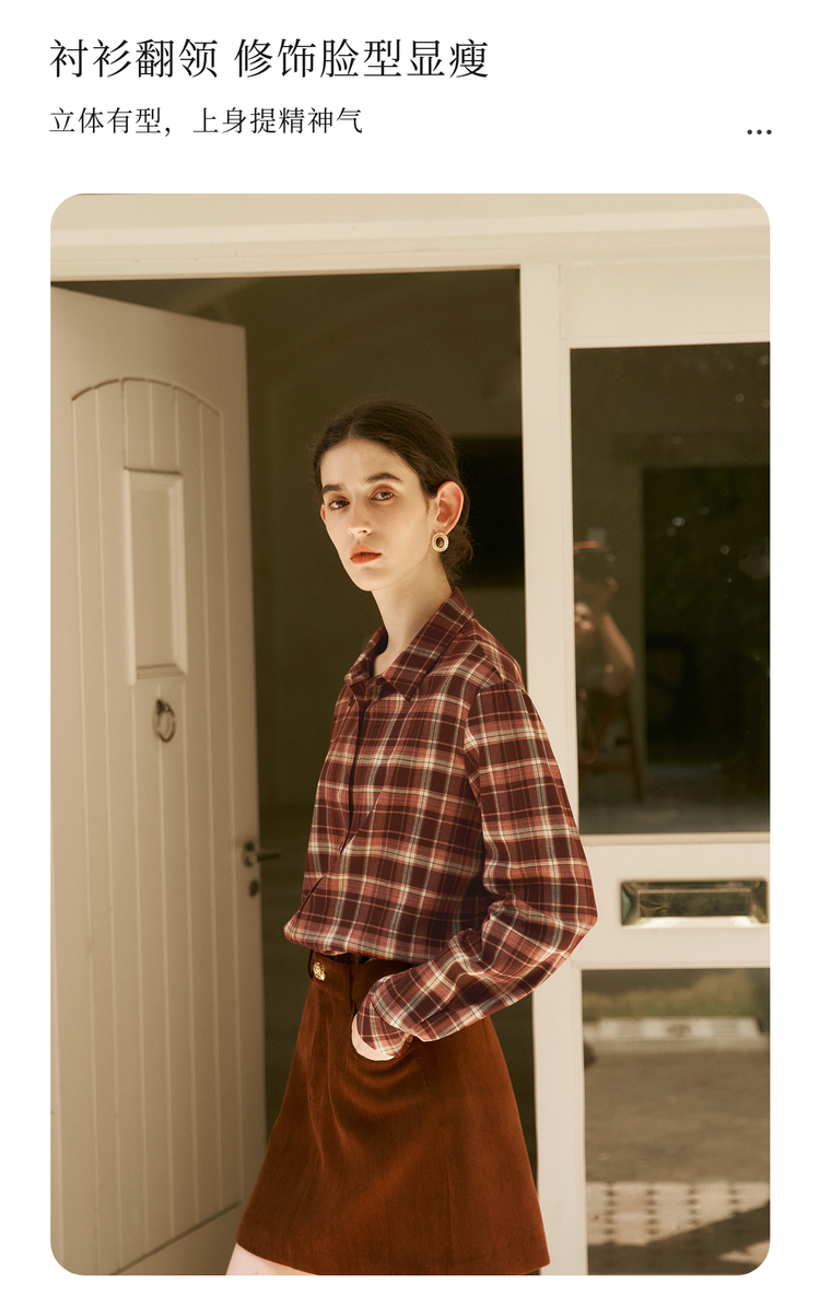 OLrain欧芮儿复古格纹衬衫女冬季2024年新款翻领宽松落肩长袖上衣