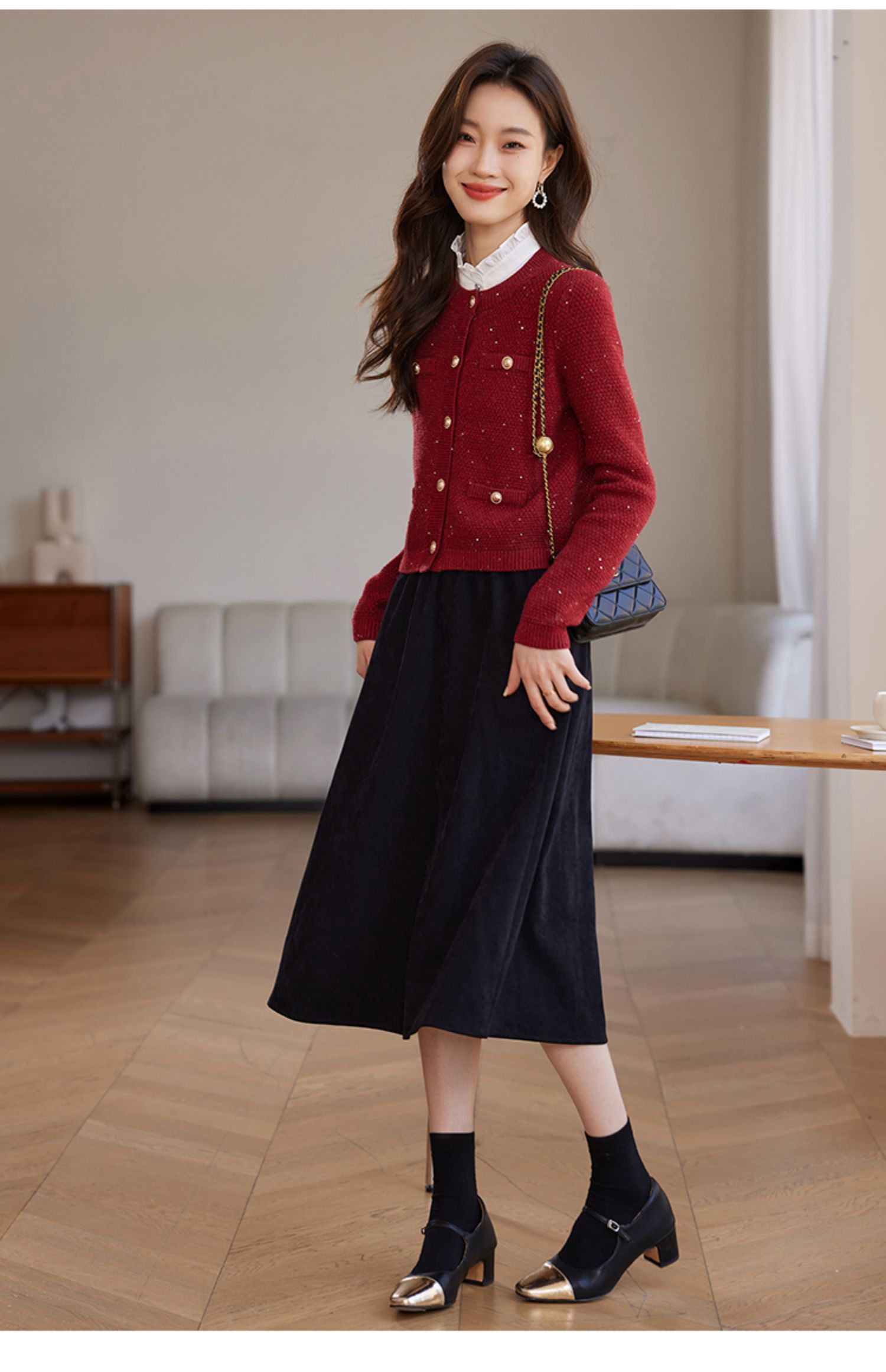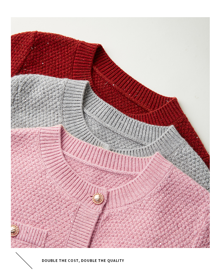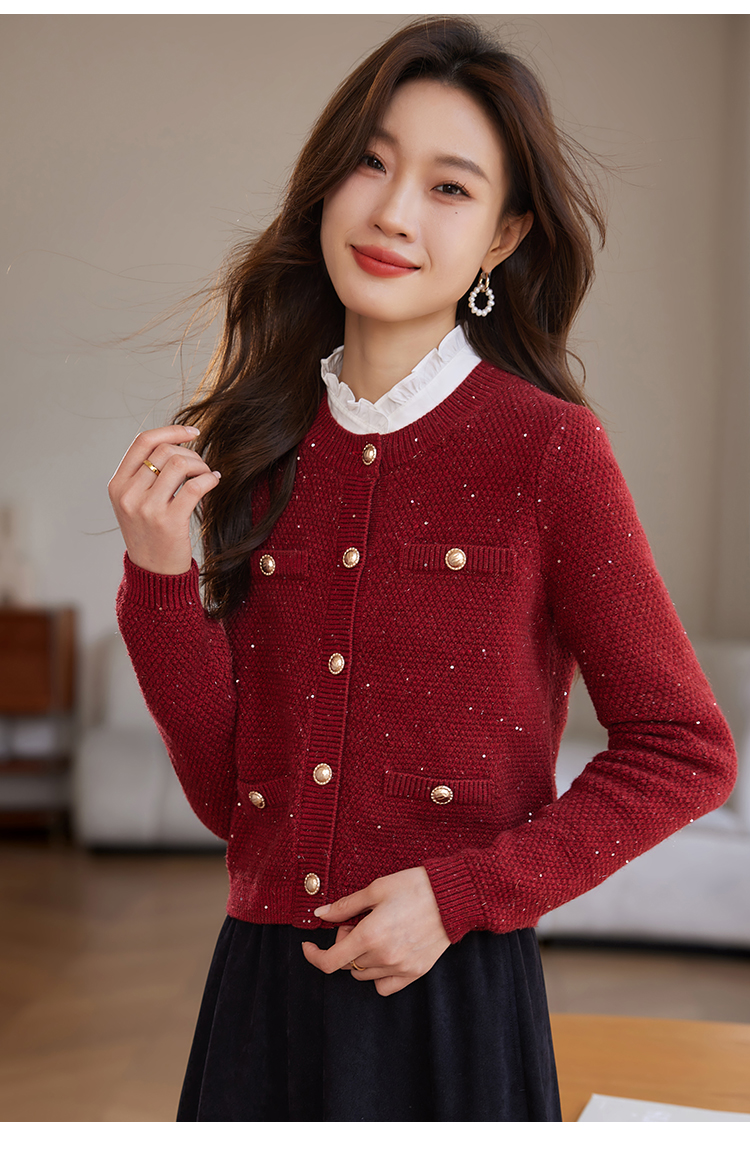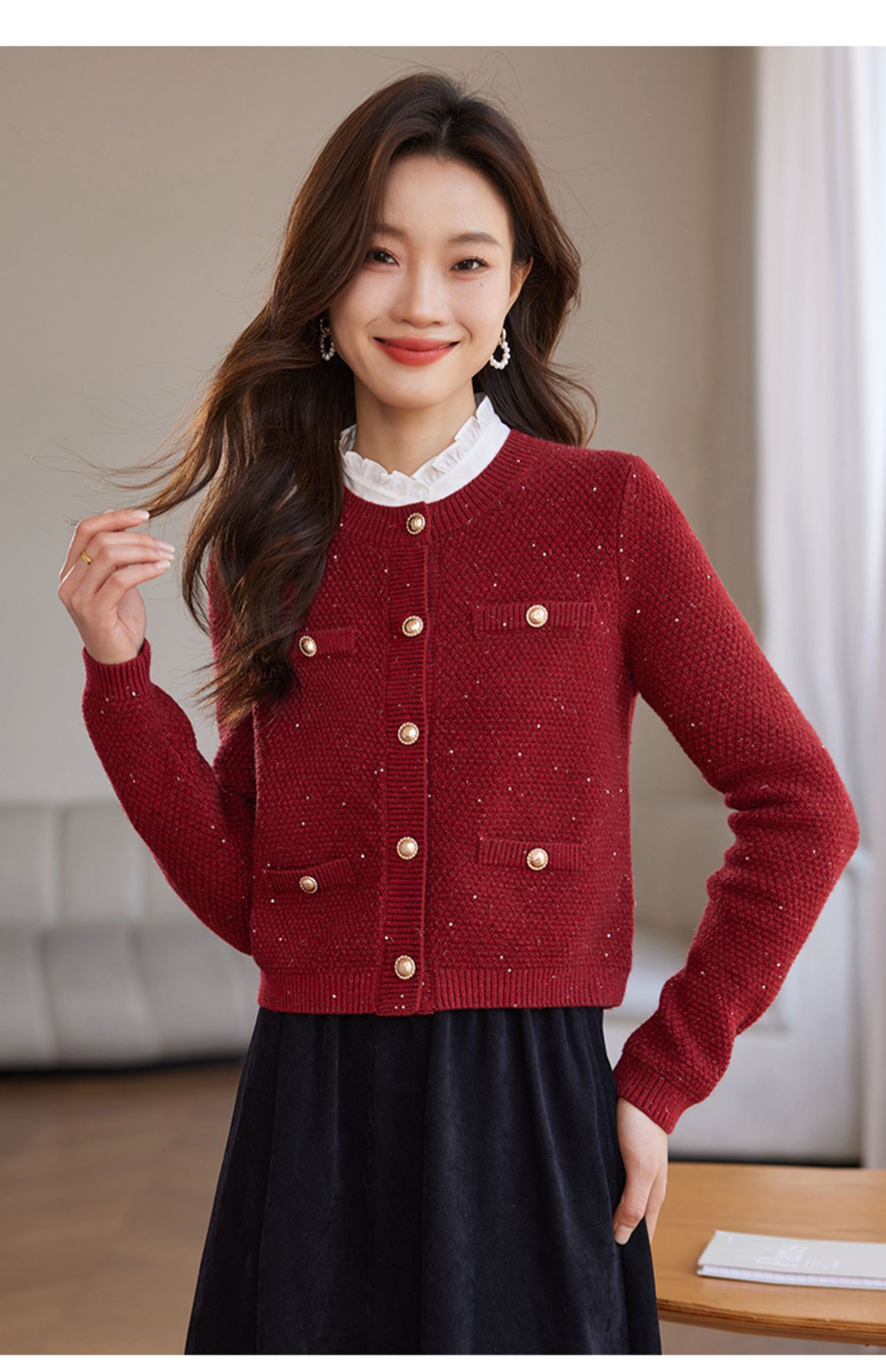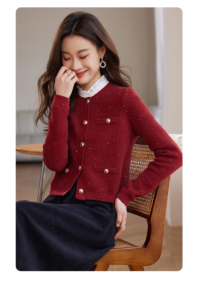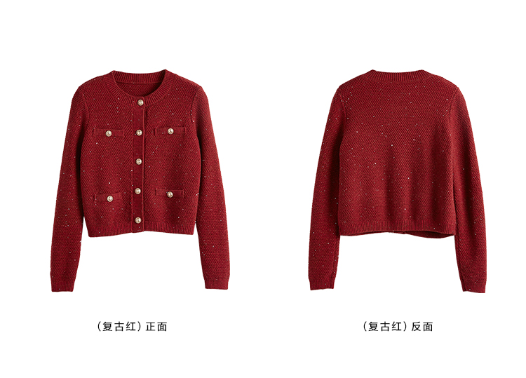 【年终特卖】熙世界小香风复古红色毛衣开衫秋冬圆领银丝针织外套