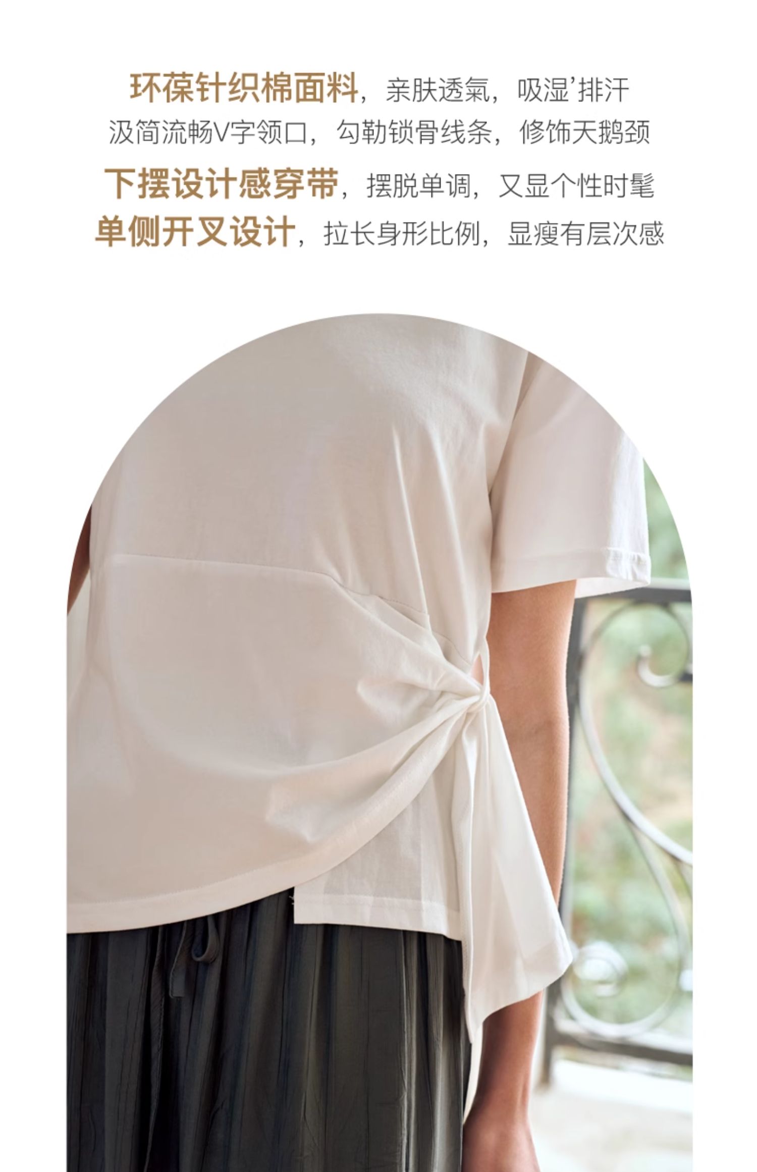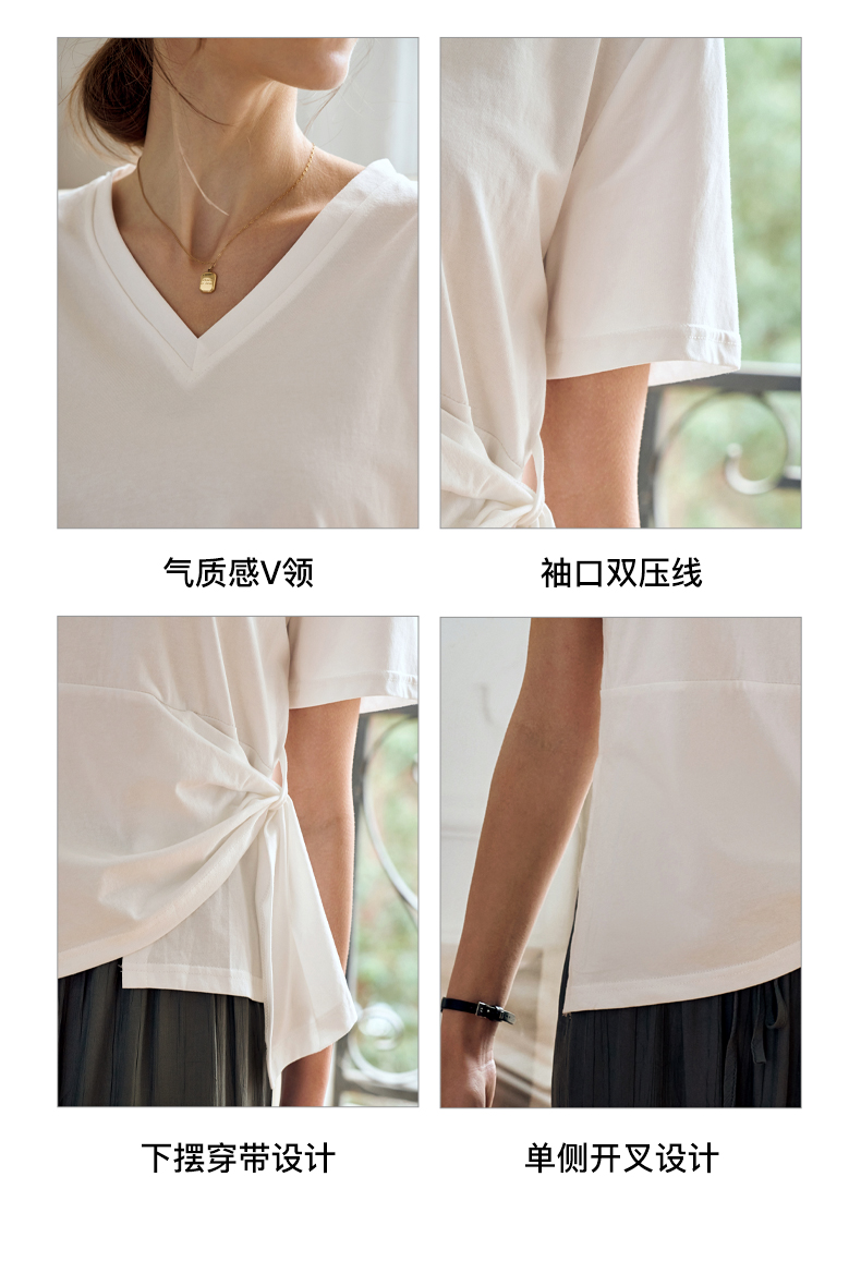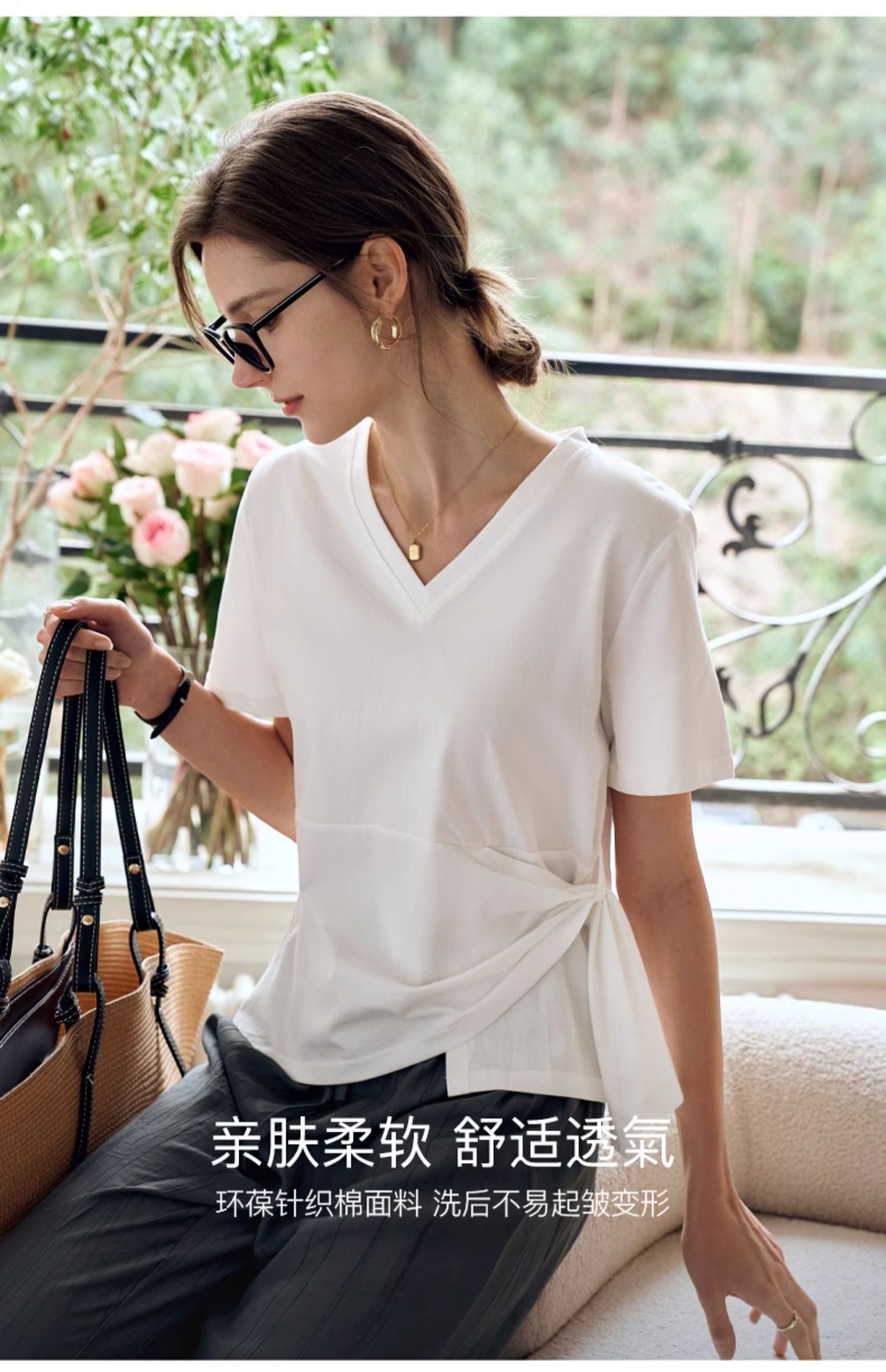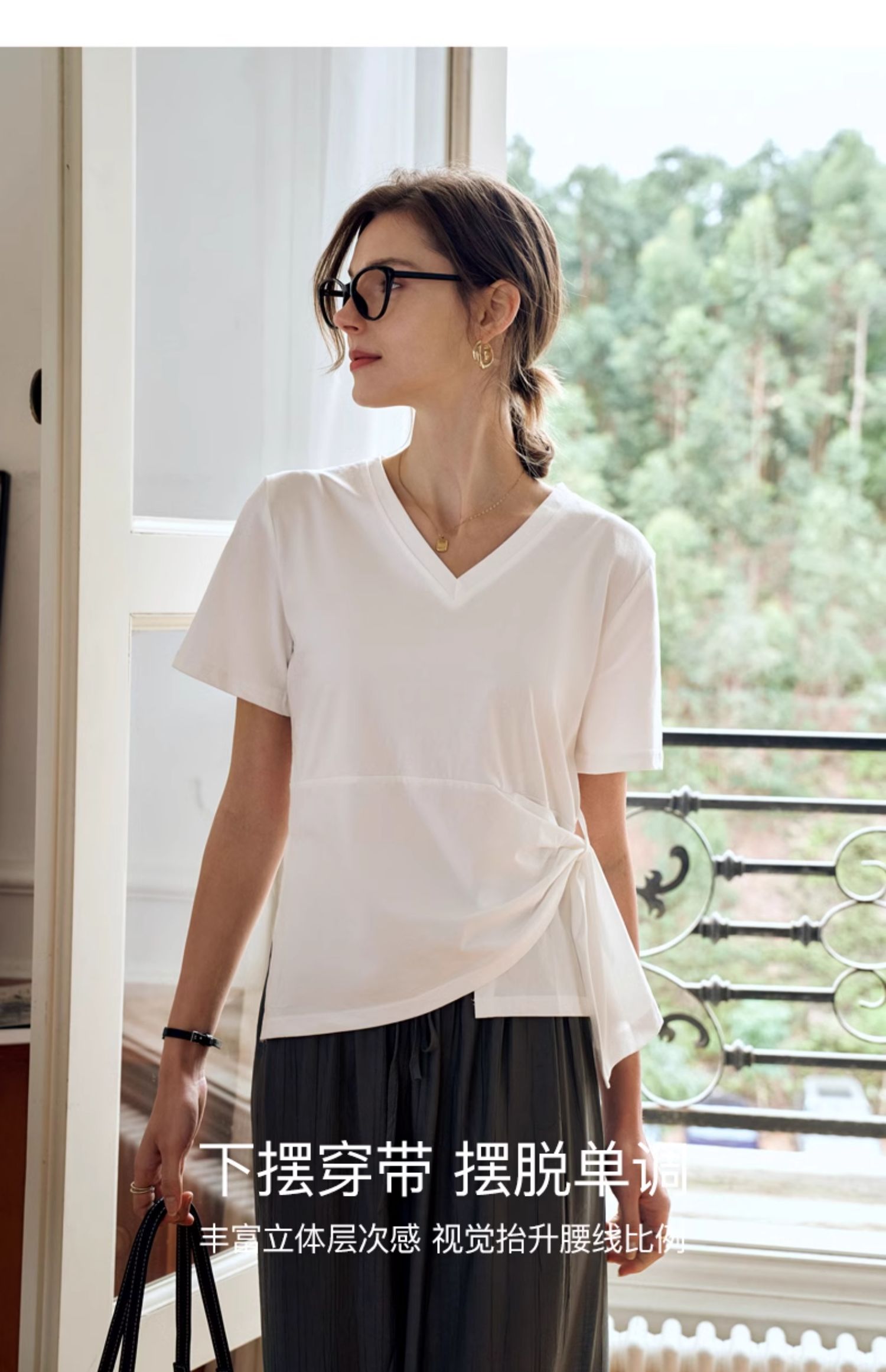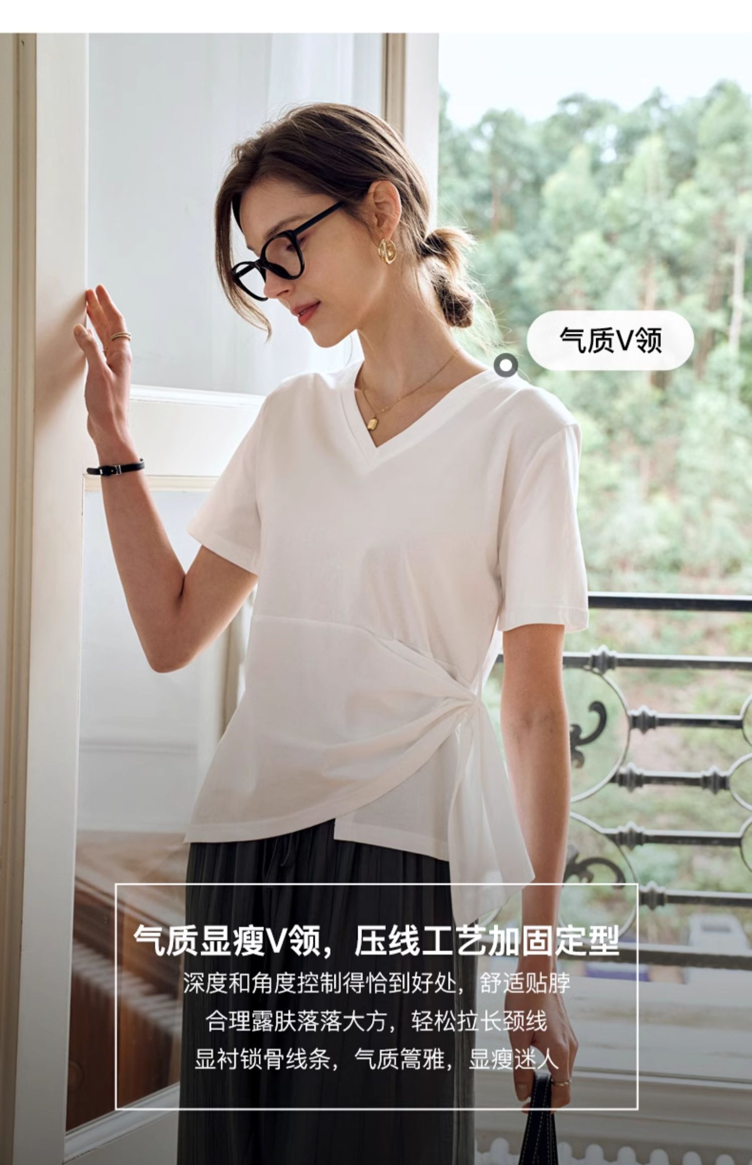 OLrain欧芮儿米白色T恤女夏季2024年新款百搭V领设计感短袖上衣