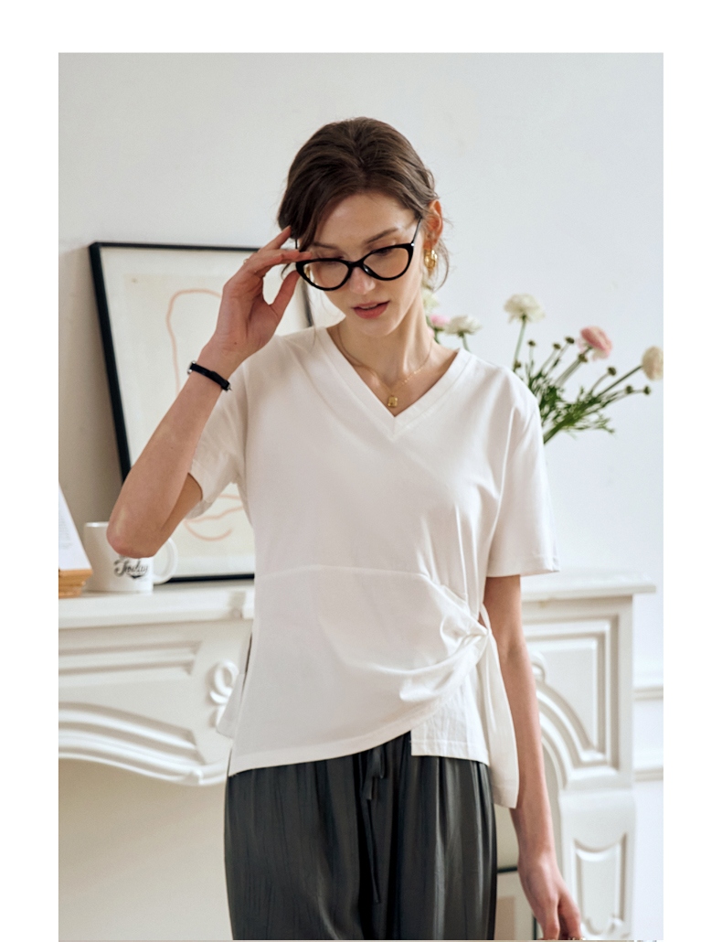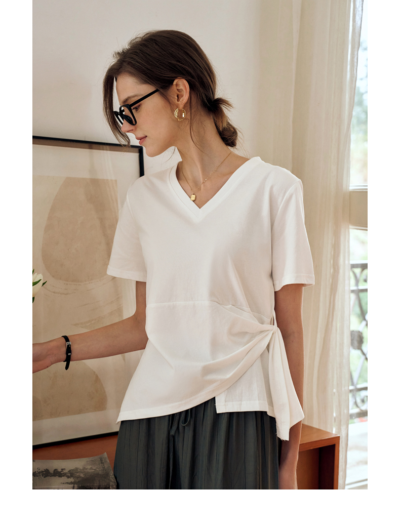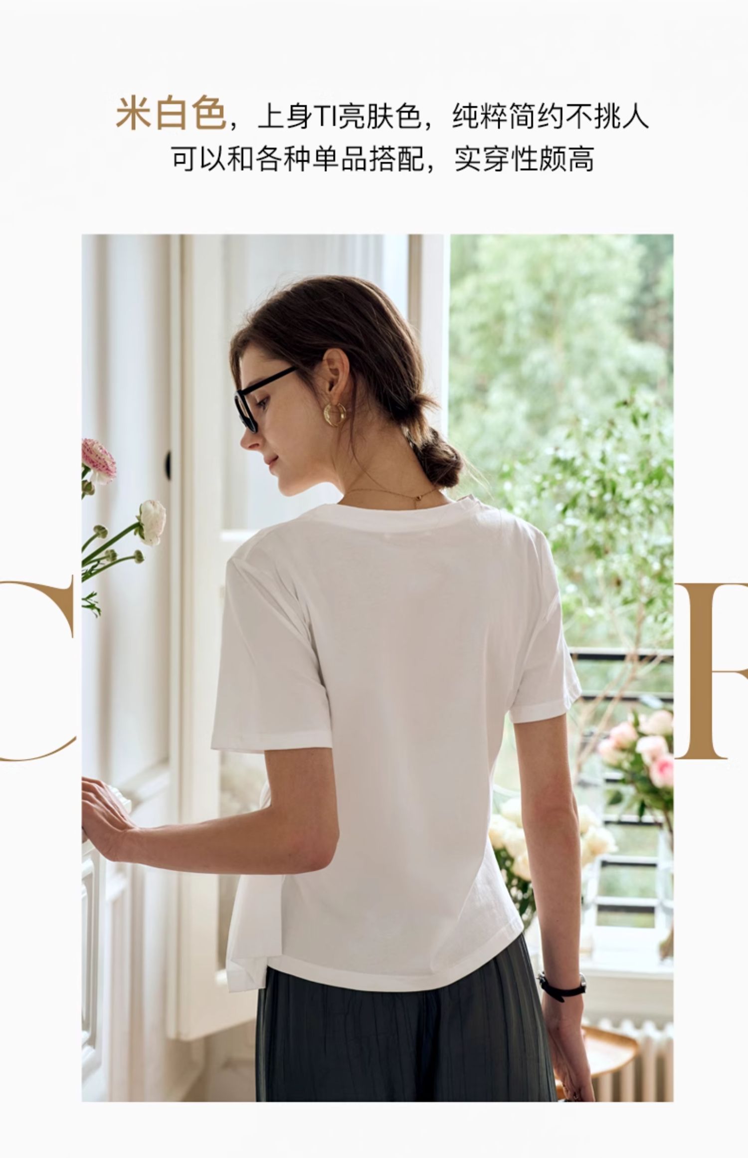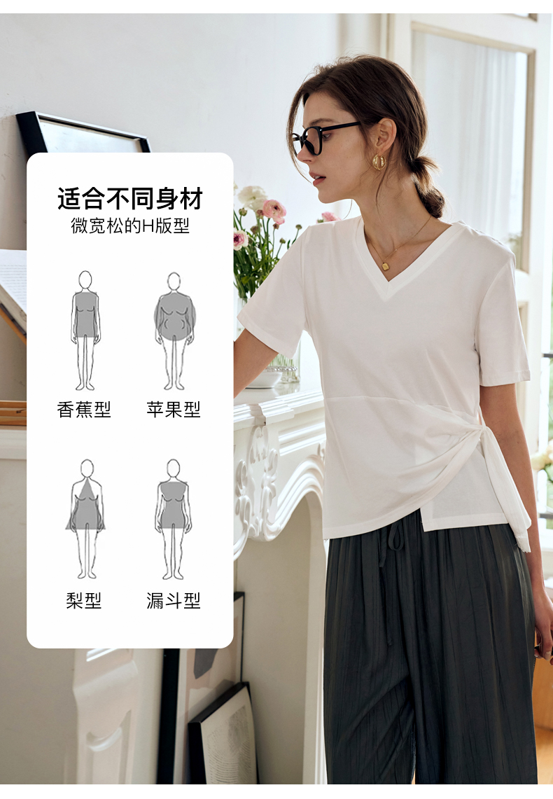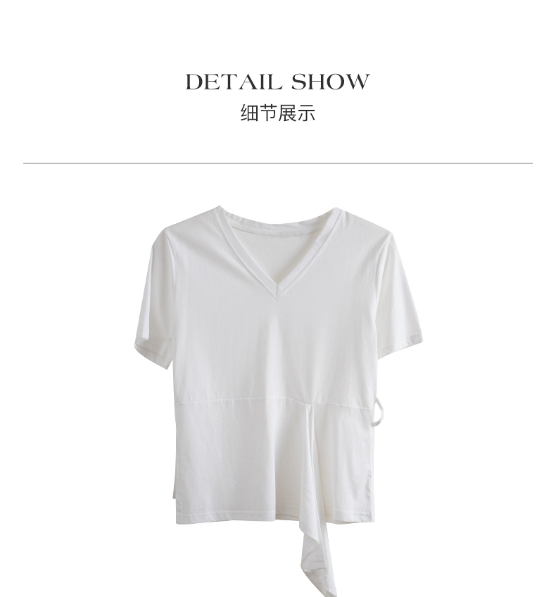 OLrain欧芮儿米白色T恤女夏季2024年新款百搭V领设计感短袖上衣