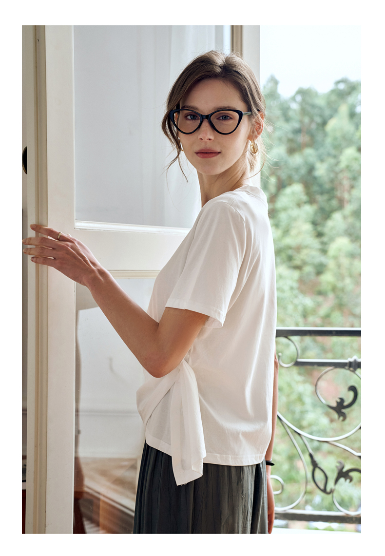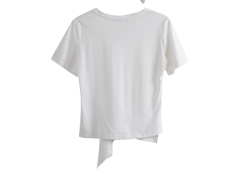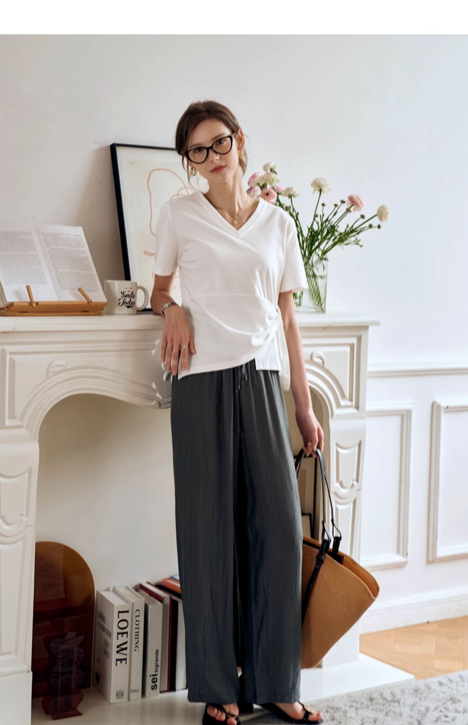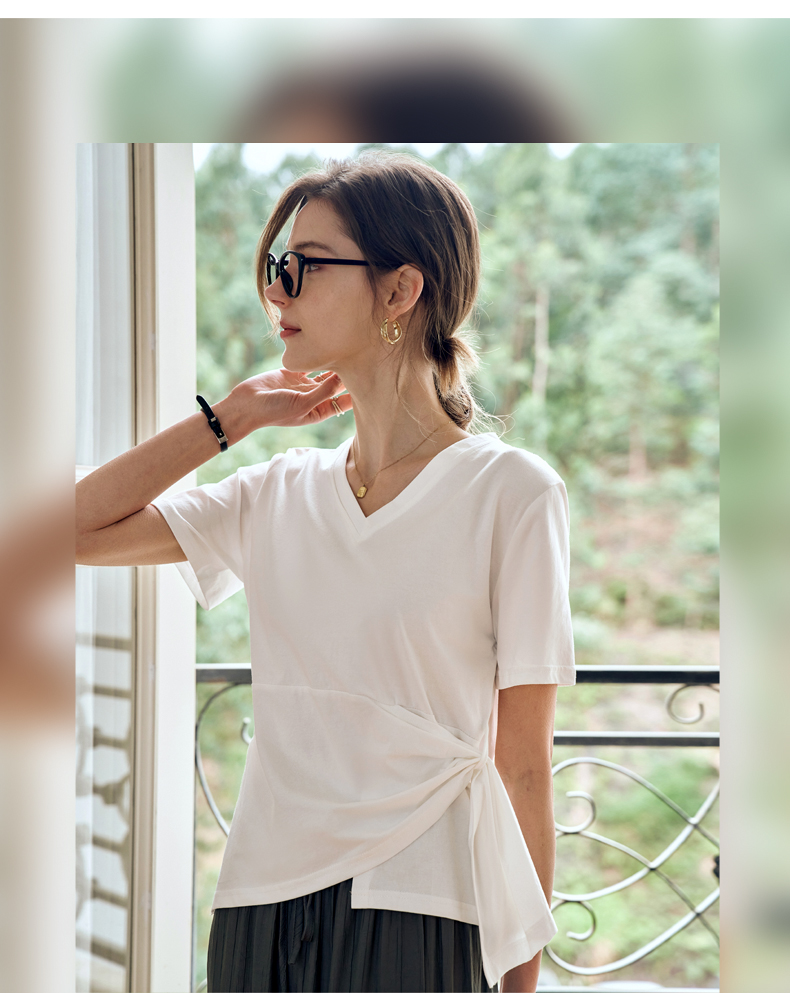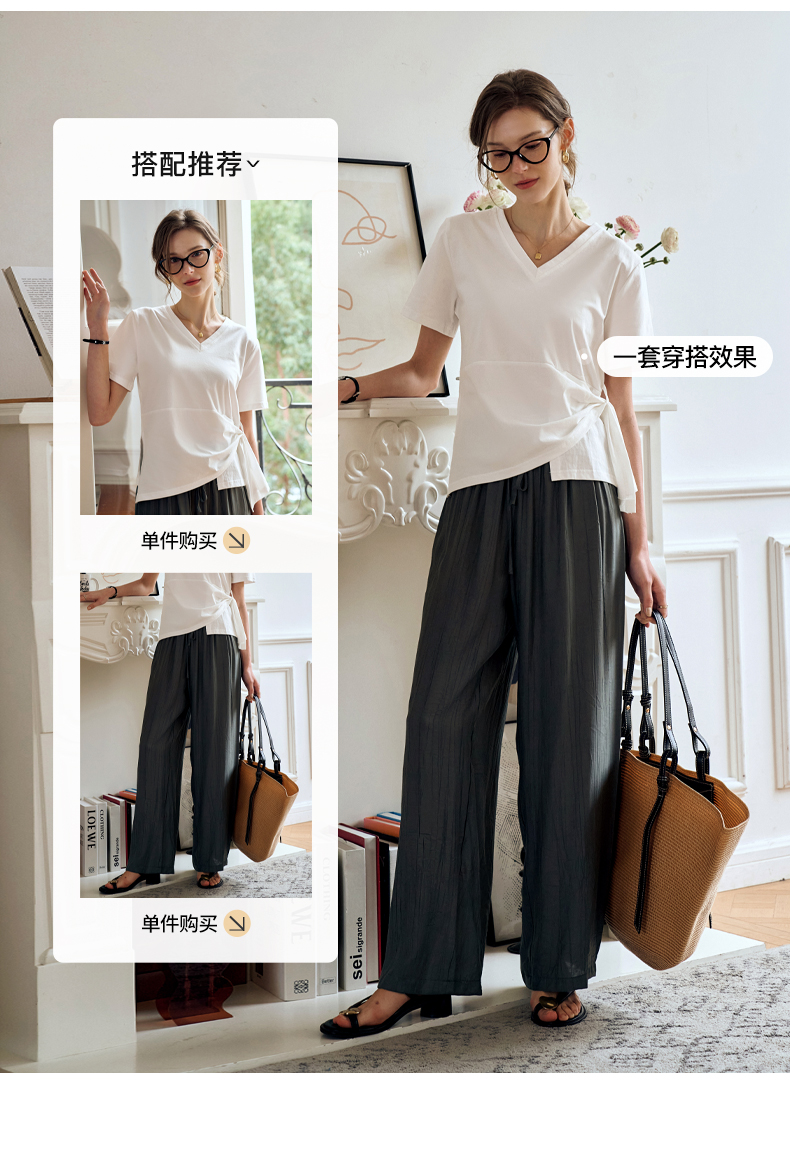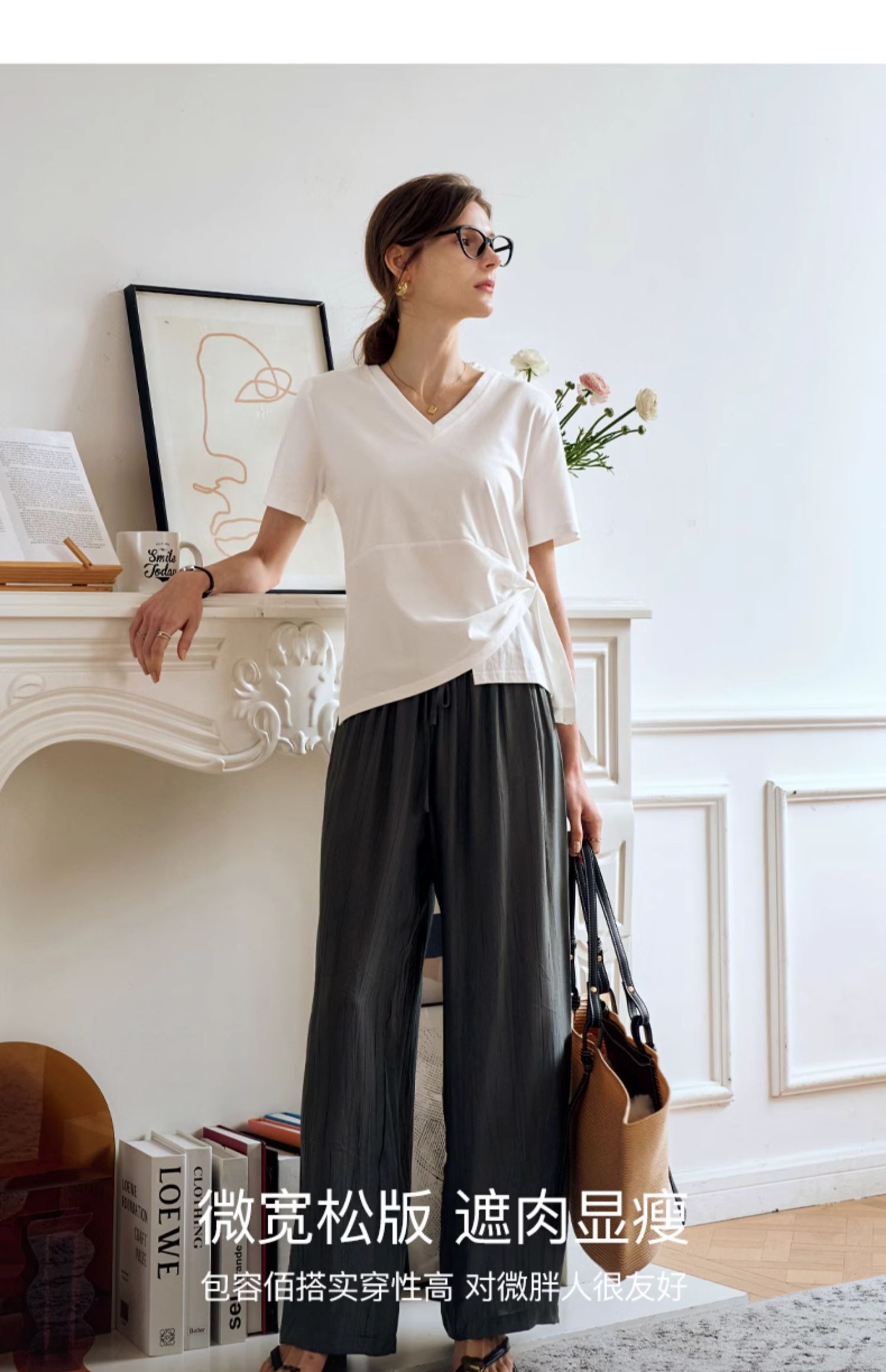 OLrain欧芮儿米白色T恤女夏季2024年新款百搭V领设计感短袖上衣