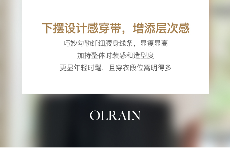 - “精致”是欧芮儿olrain品牌文化的核心,欧芮儿认为,精致的女人,不但要外在动人,更要内在迷人,内外兼修,有魅力、有气质、有内涵,自信而不自傲,优雅而不矫揉,自有万种风情而不轻浮,更不故作矜持。