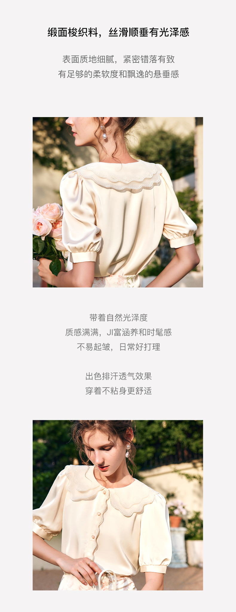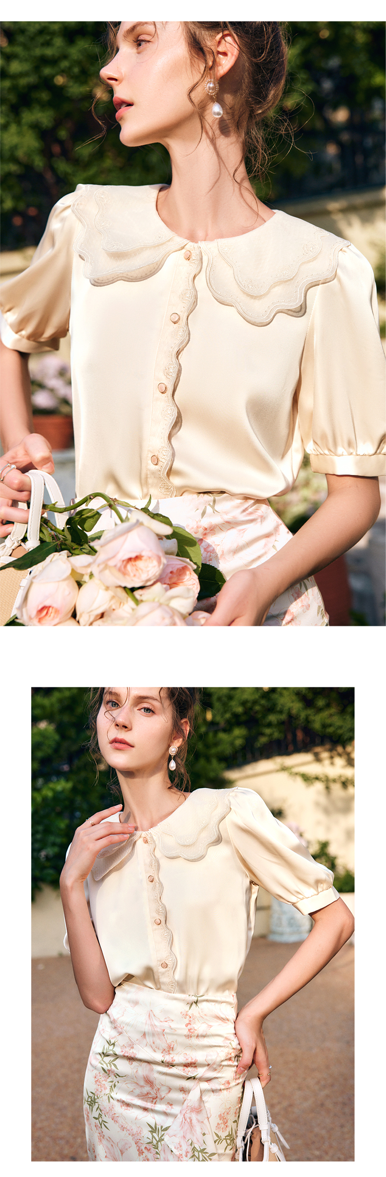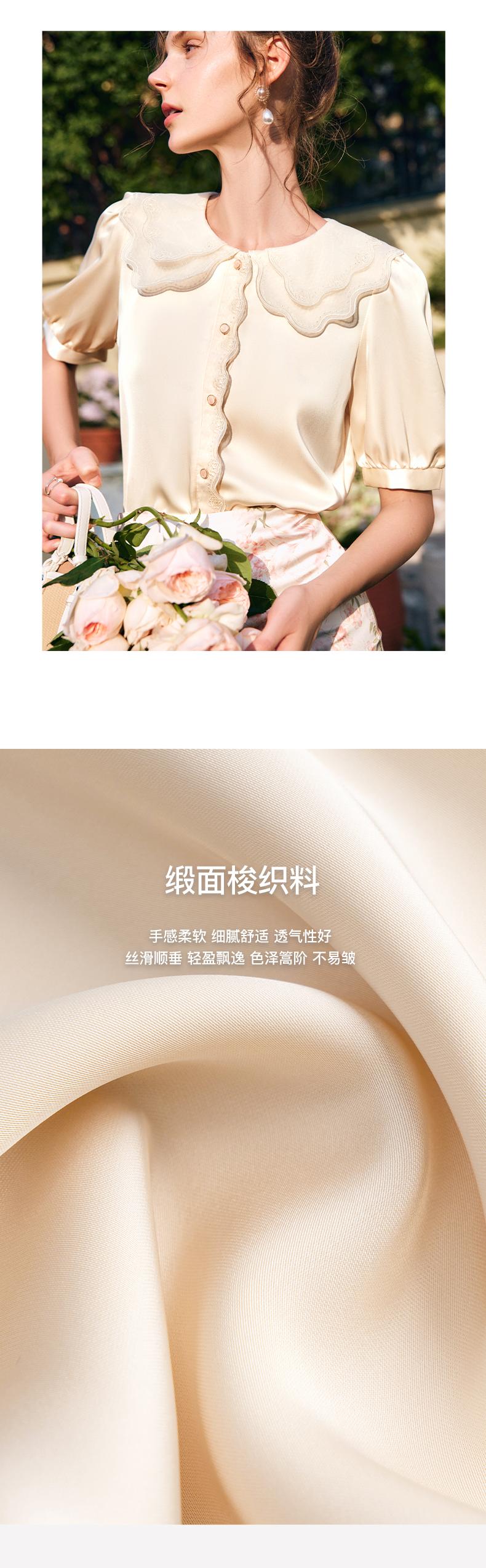 欧芮儿OLrain法式娃娃领缎面衬衫女夏季2022新款泡泡袖减龄小衫