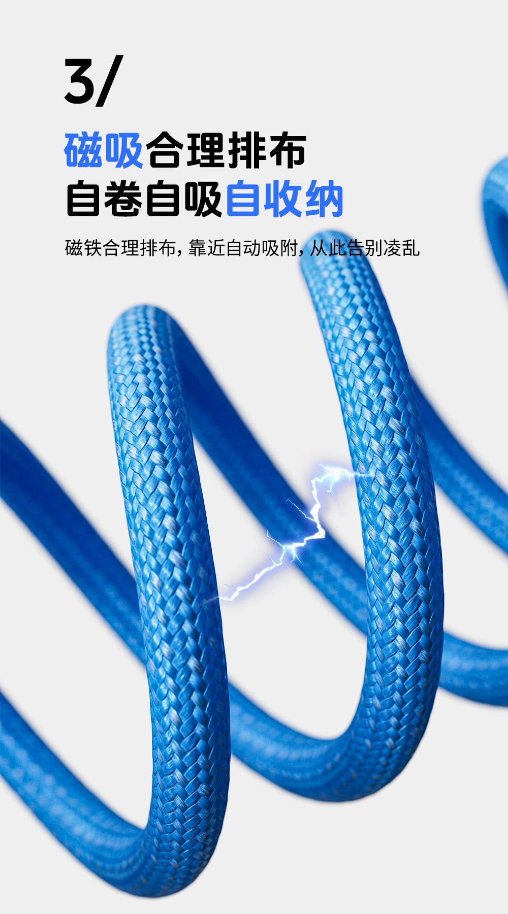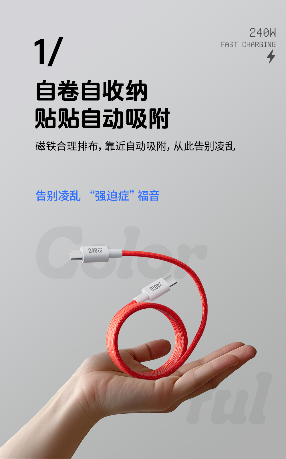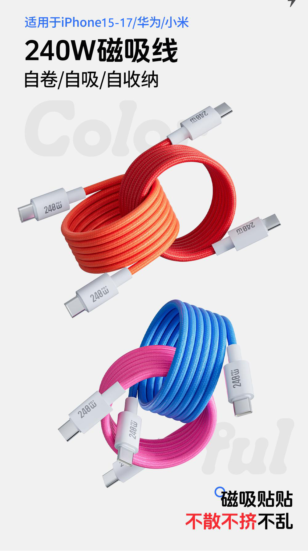 240W快充磁吸贴贴线 自卷/自吸/自收纳 适用于iphone15-17/安卓
