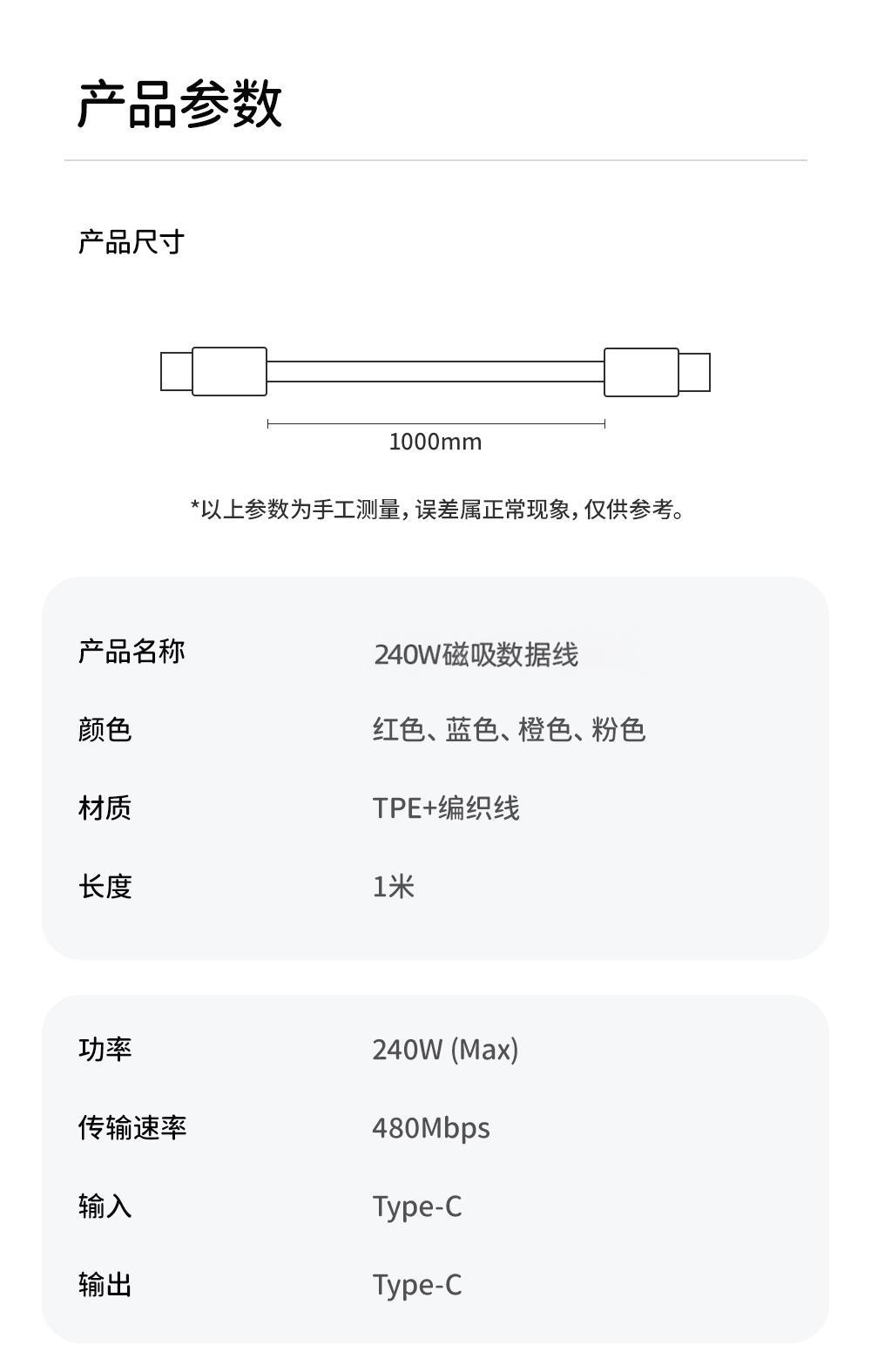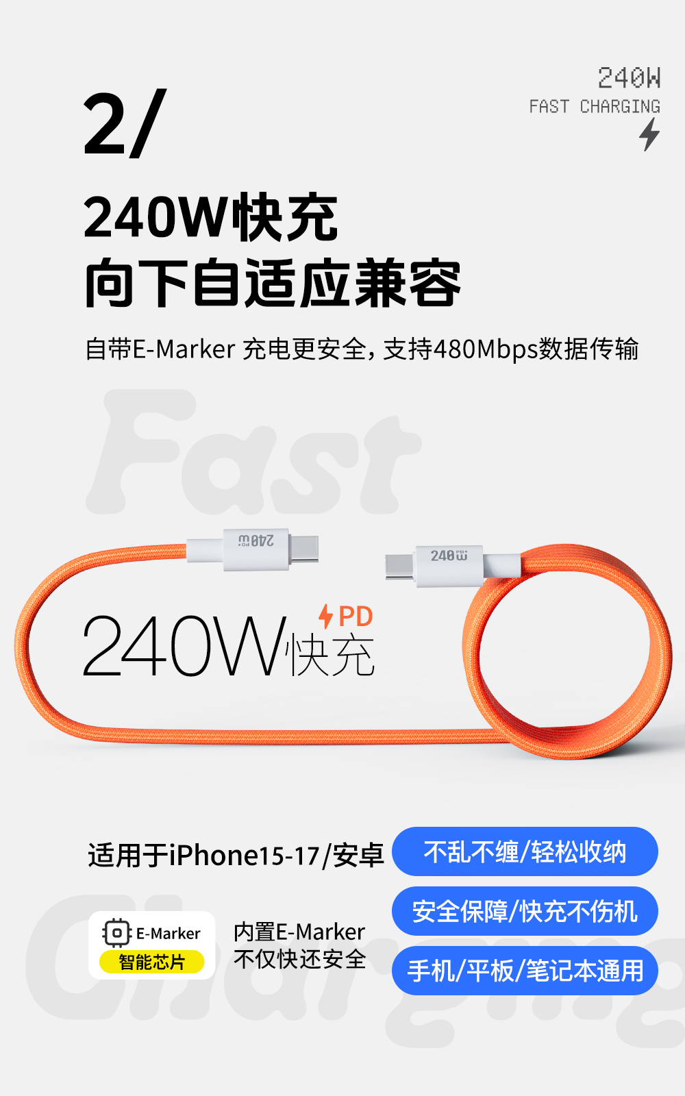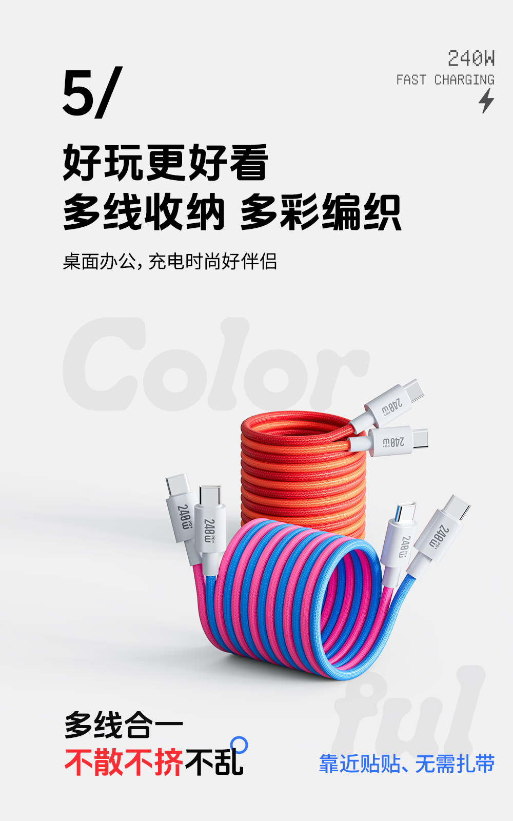 240W快充磁吸贴贴线 自卷/自吸/自收纳 适用于iphone15-17/安卓