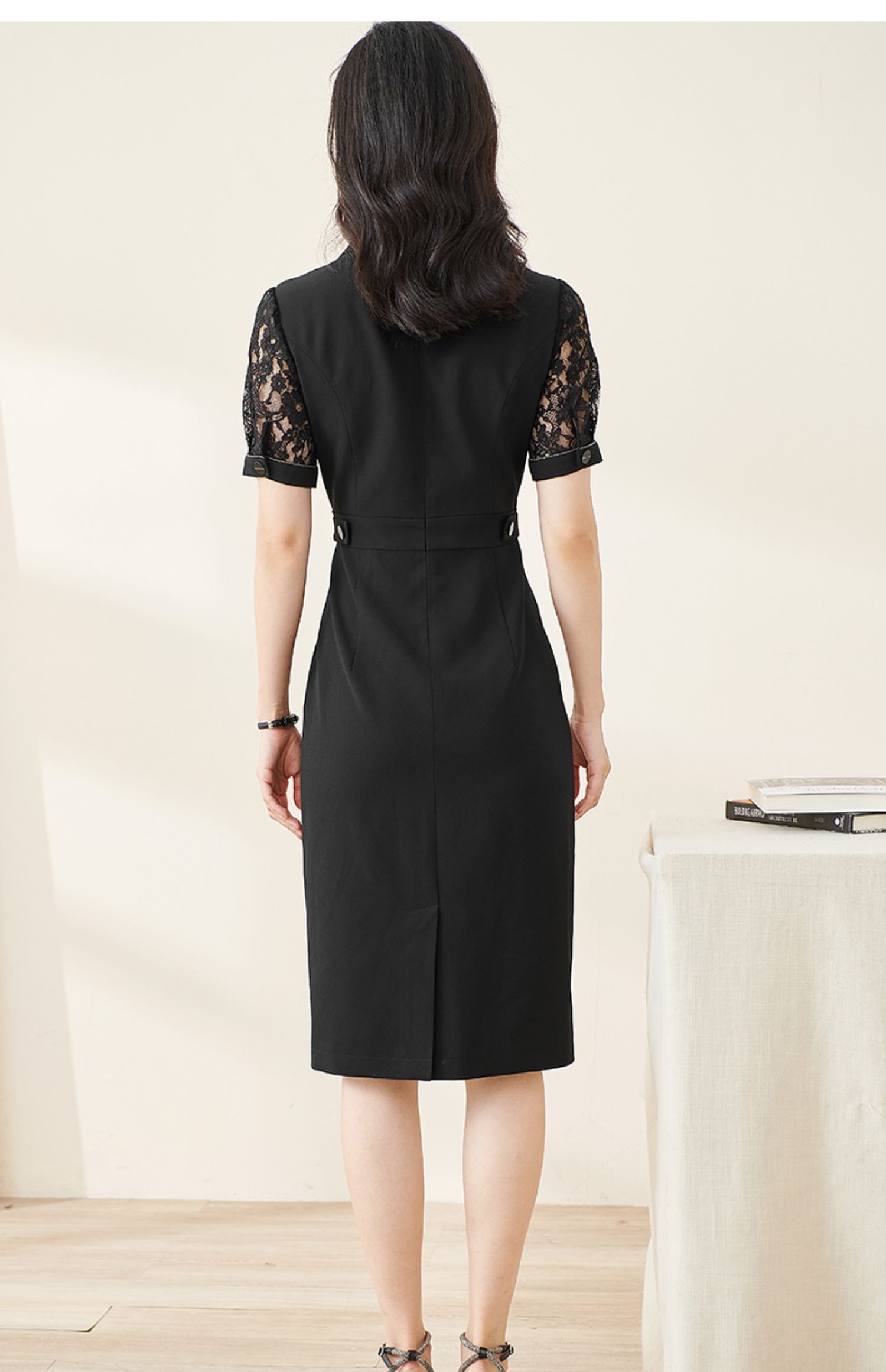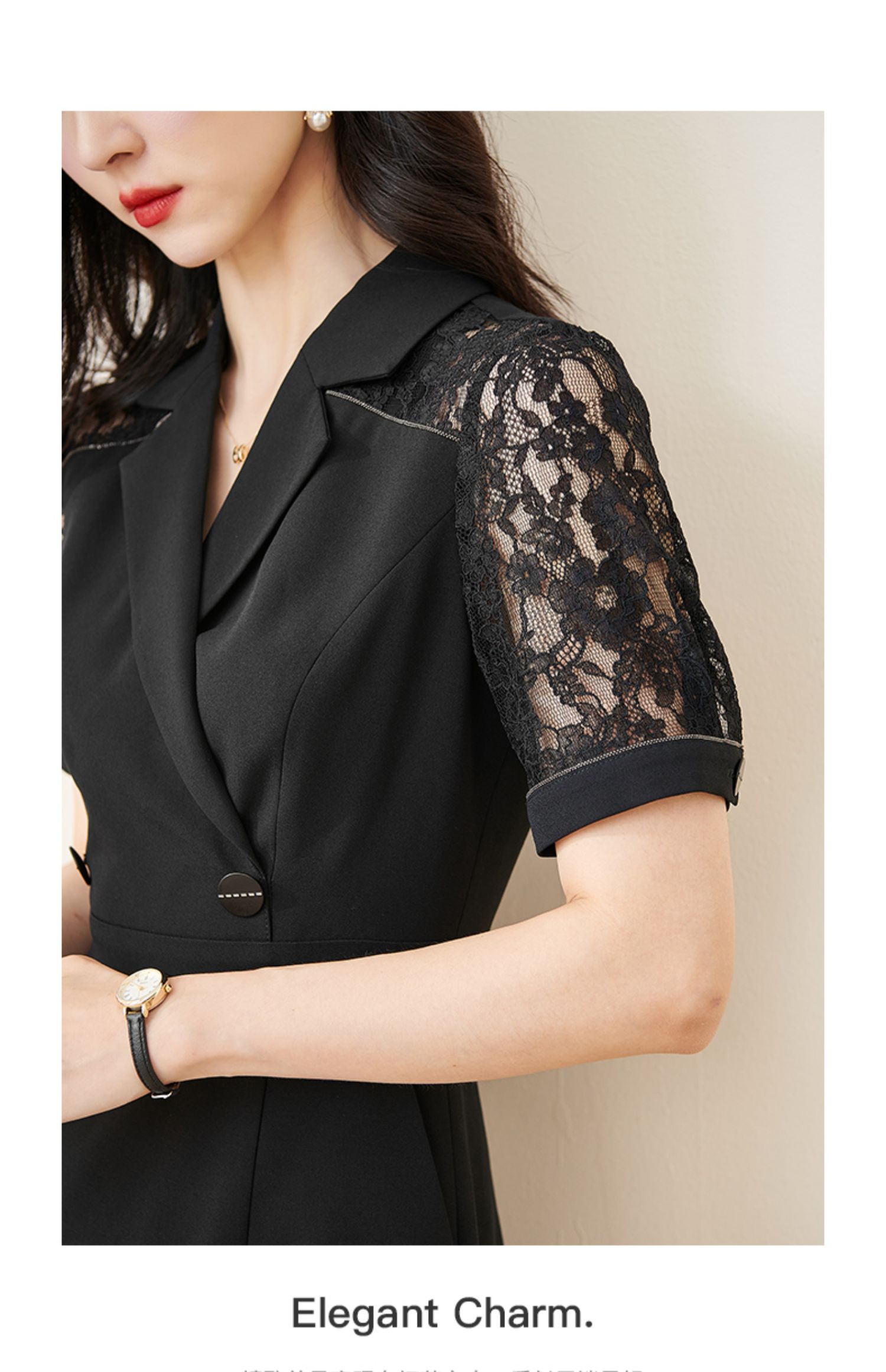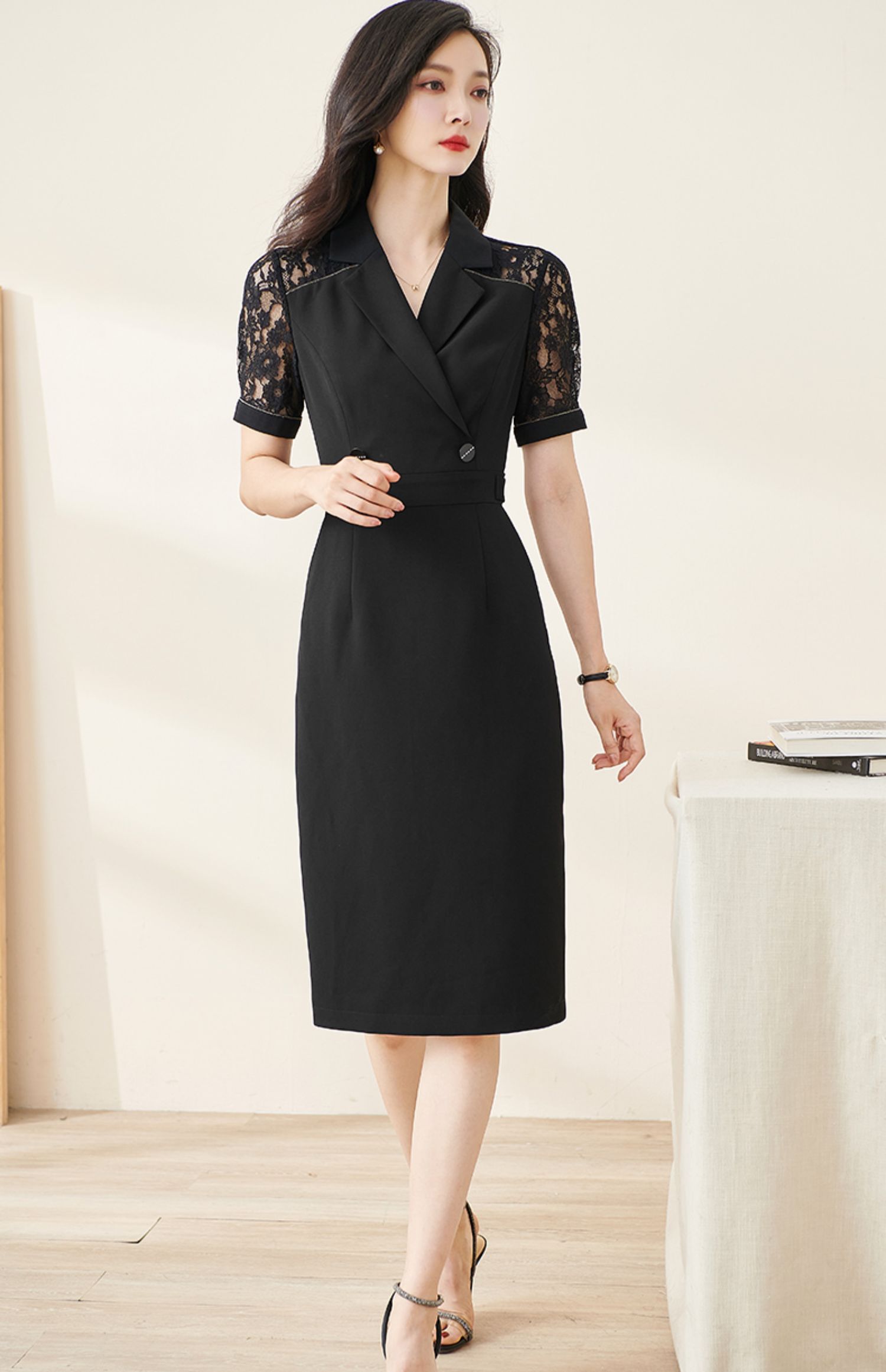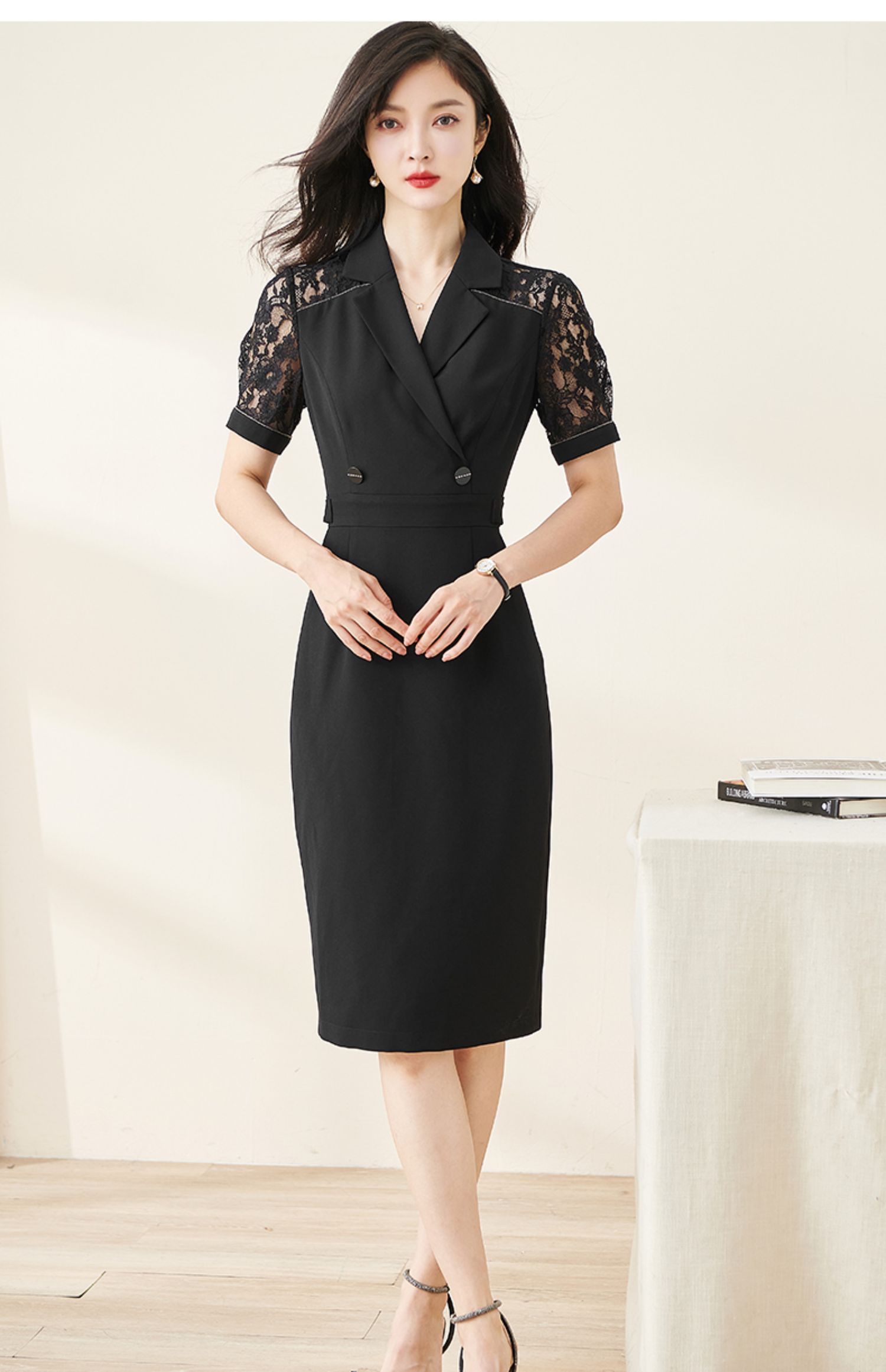 剩S/M/L 米思阳2024夏季新款时尚OL西装式连衣裙拼接蕾丝袖修身中长裙裙子