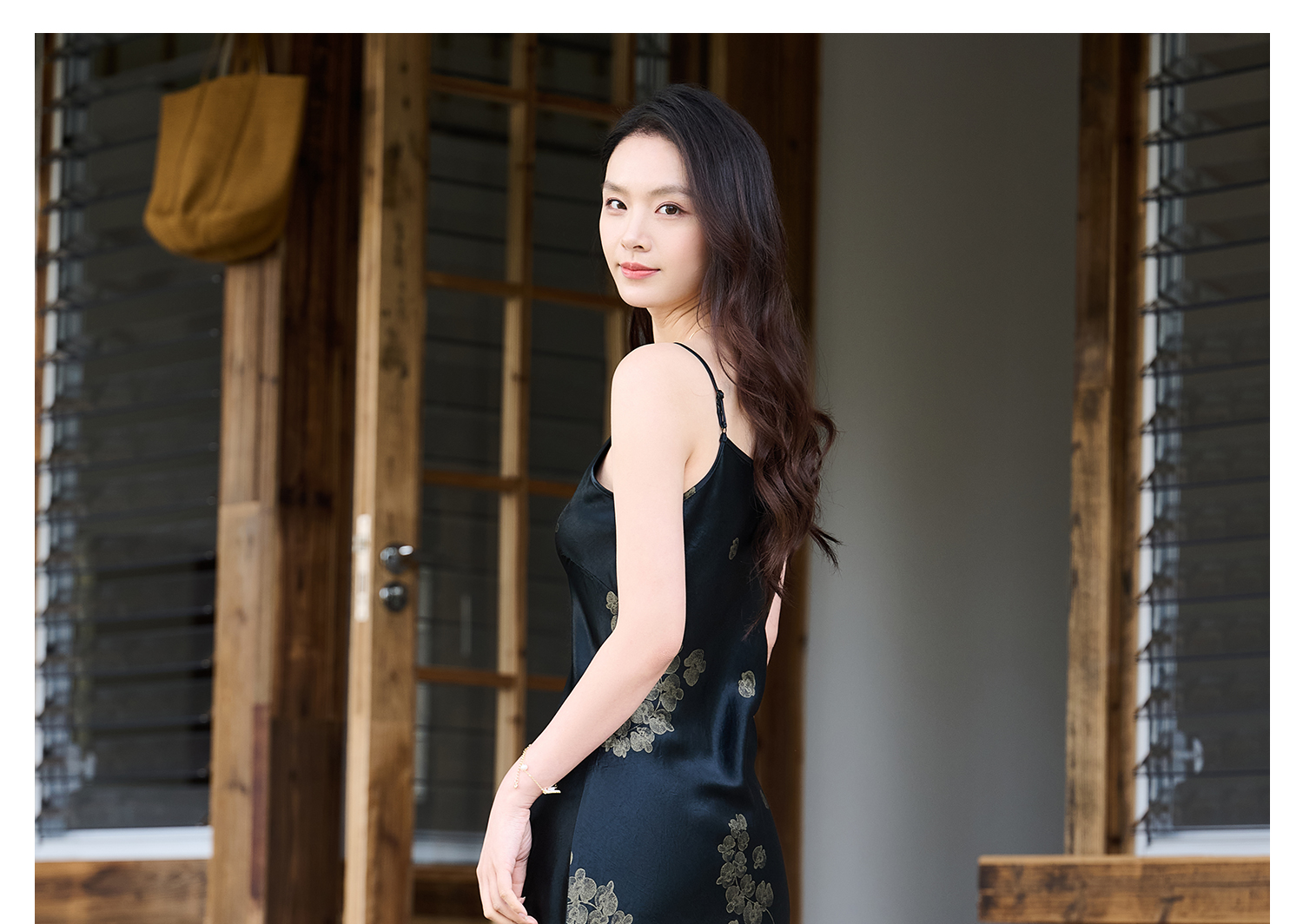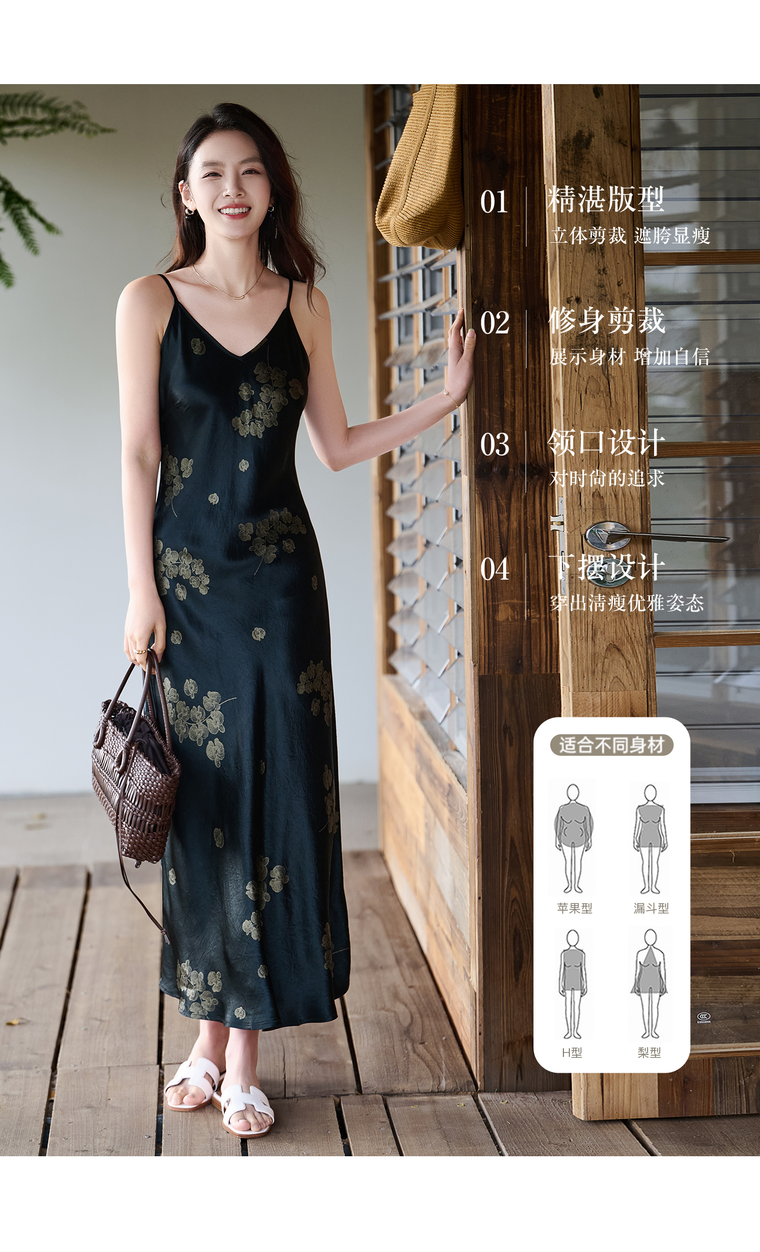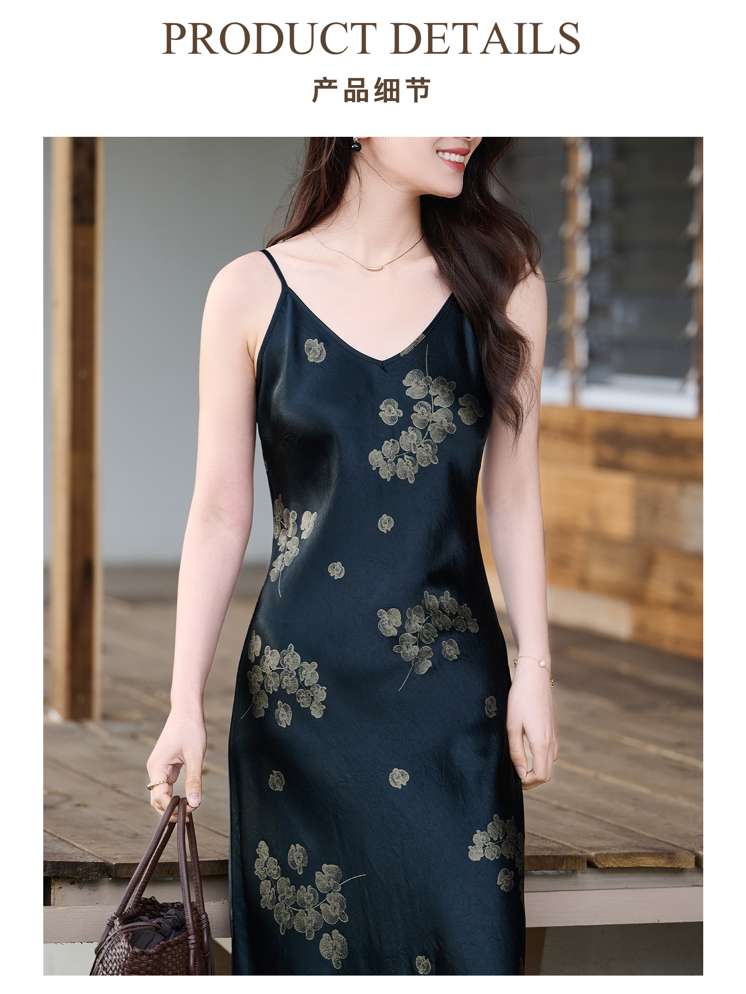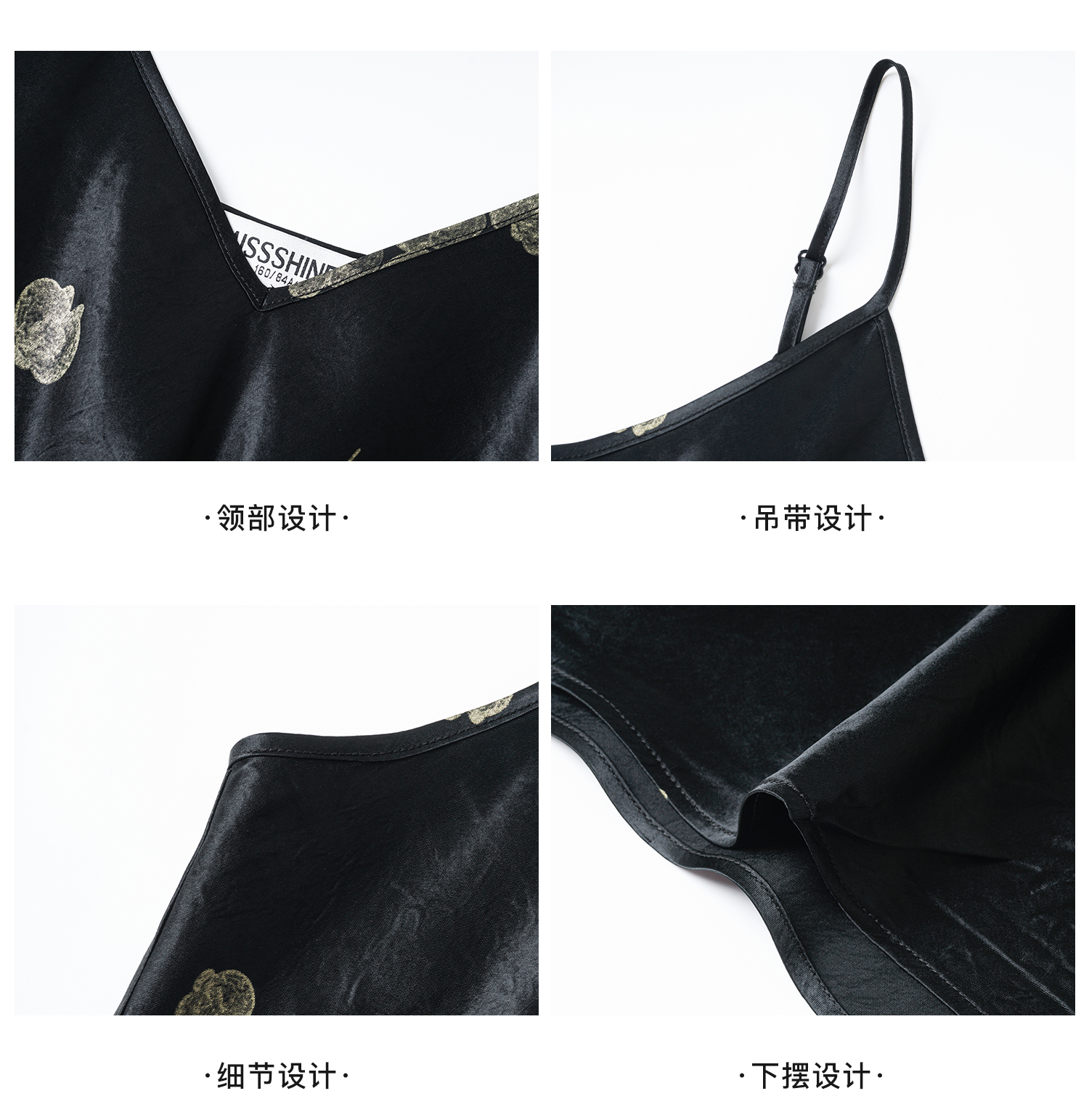 黑金梅花醋酸连衣裙 抓绉烫金提花压皱 米思阳2026春夏新款收腰显瘦醋纤内搭吊带裙女2933