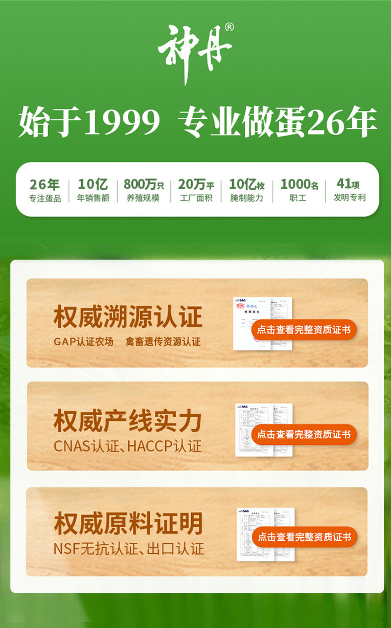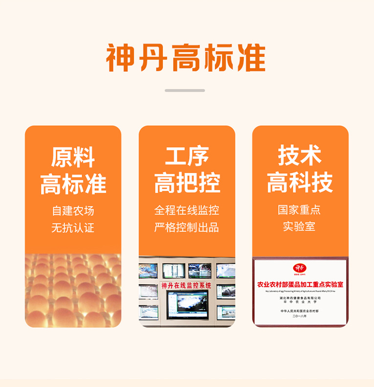 湖北神丹健康食品有限公司,中国实力雄厚的蛋产品加工企业,年生产、销售各类蛋品数亿枚,是中国目前品种全、销售广的禽蛋研发加工基地。神丹公司以“服务农民,健康人民”为宗旨,以推动中国健康食品发展为己任。
