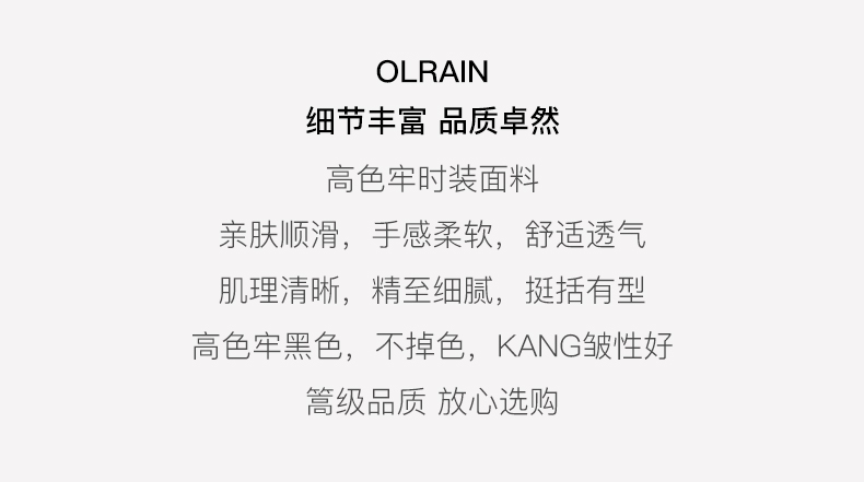 “精致”是欧芮儿olrain品牌文化的核心,欧芮儿认为,精致的女人,不但要外在动人,更要内在迷人,内外兼修,有魅力、有气质、有内涵,自信而不自傲,优雅而不矫揉,自有万种风情而不轻浮,更不故作矜持。