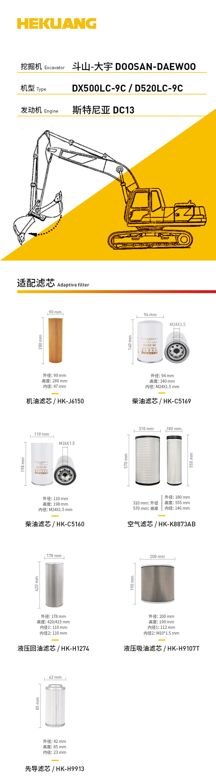 斗山大宇DX500LC-9C/D520LC-9C挖掘机滤芯 机油柴油空气滤芯 液压油先导滤芯 工厂直销
