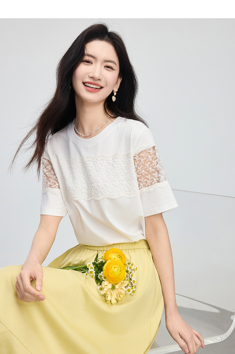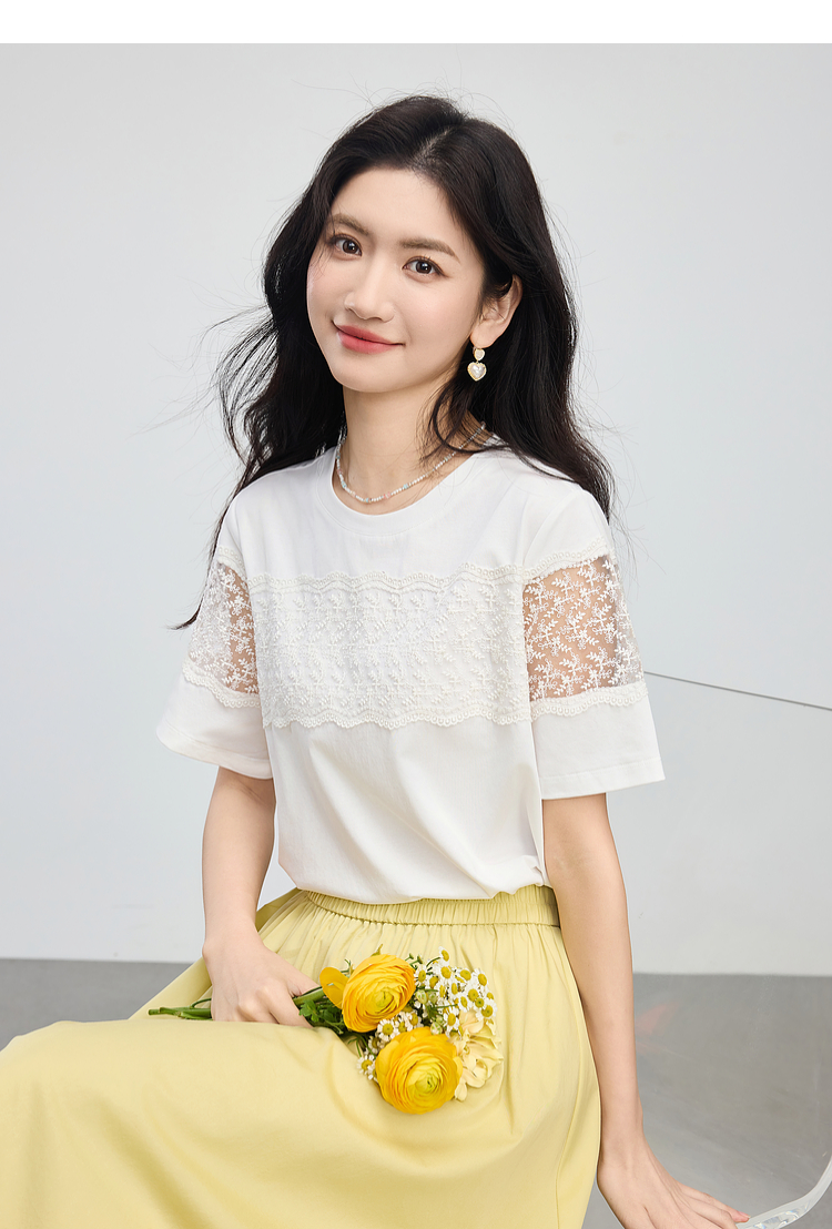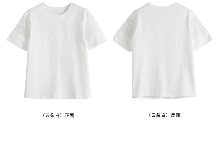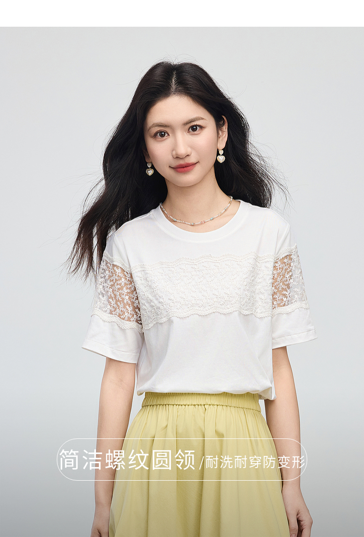 熙世界白色蕾丝拼接T恤女夏2025新款圆领短袖体恤独特超好看上衣