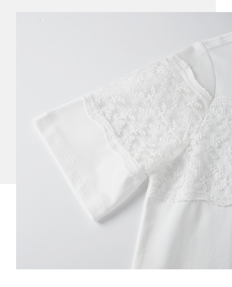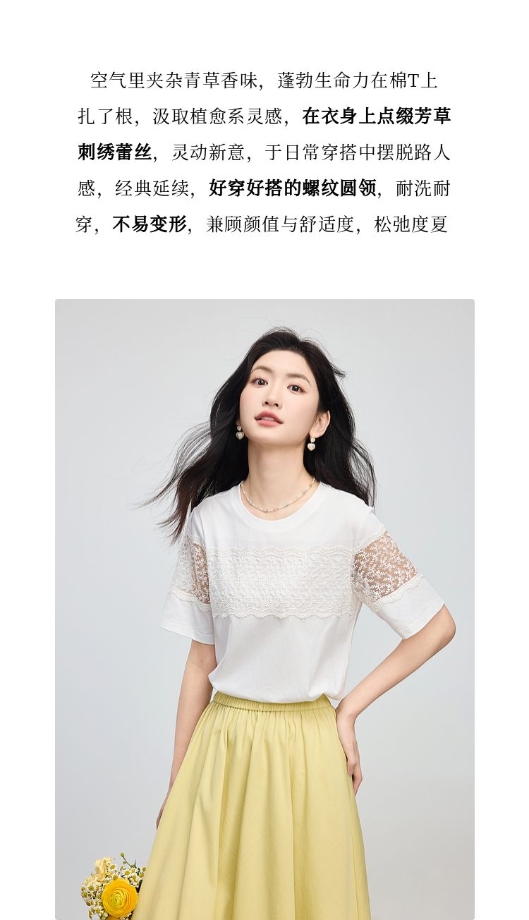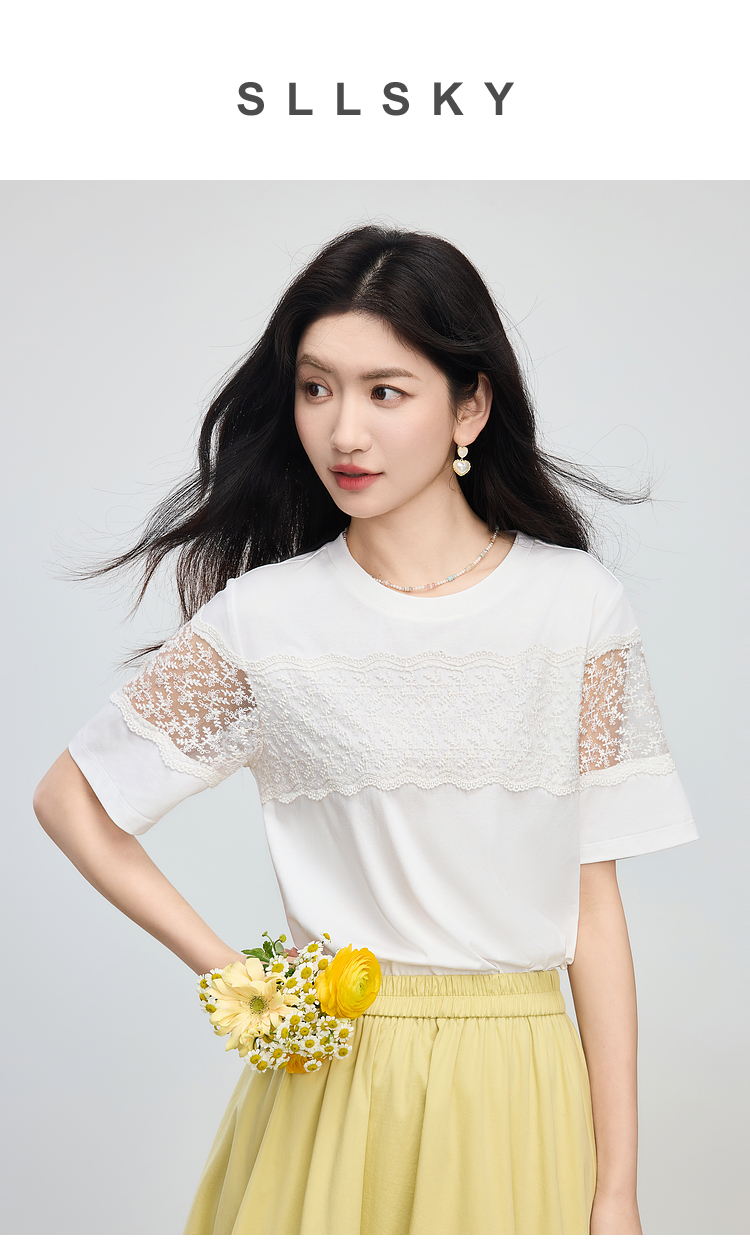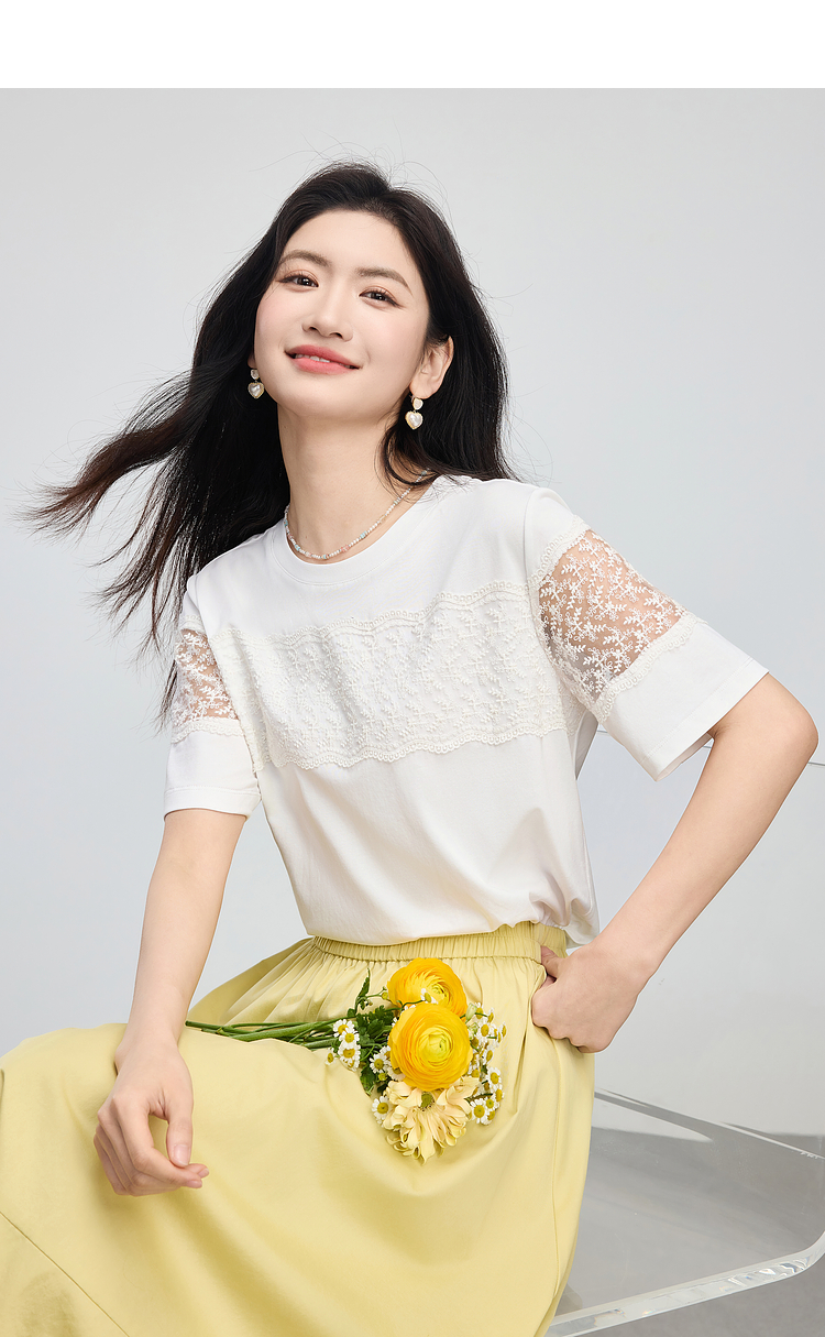 熙世界白色蕾丝拼接T恤女夏2025新款圆领短袖体恤独特超好看上衣