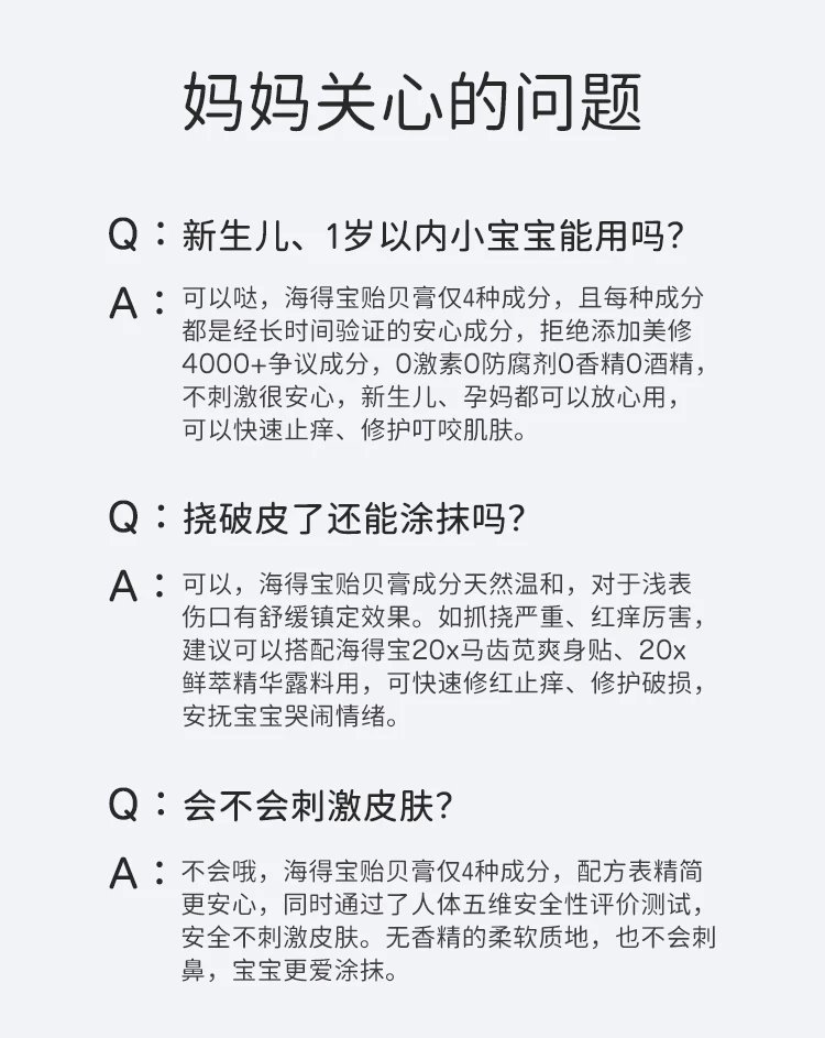 A、只有4种成分(世界成分最少的蚊虫叮咬止痒膏)极简配方,安全有效,特别适用于新生儿