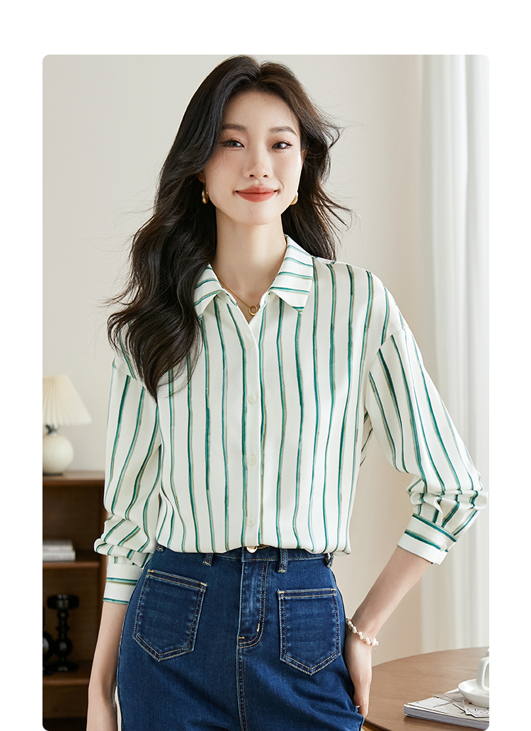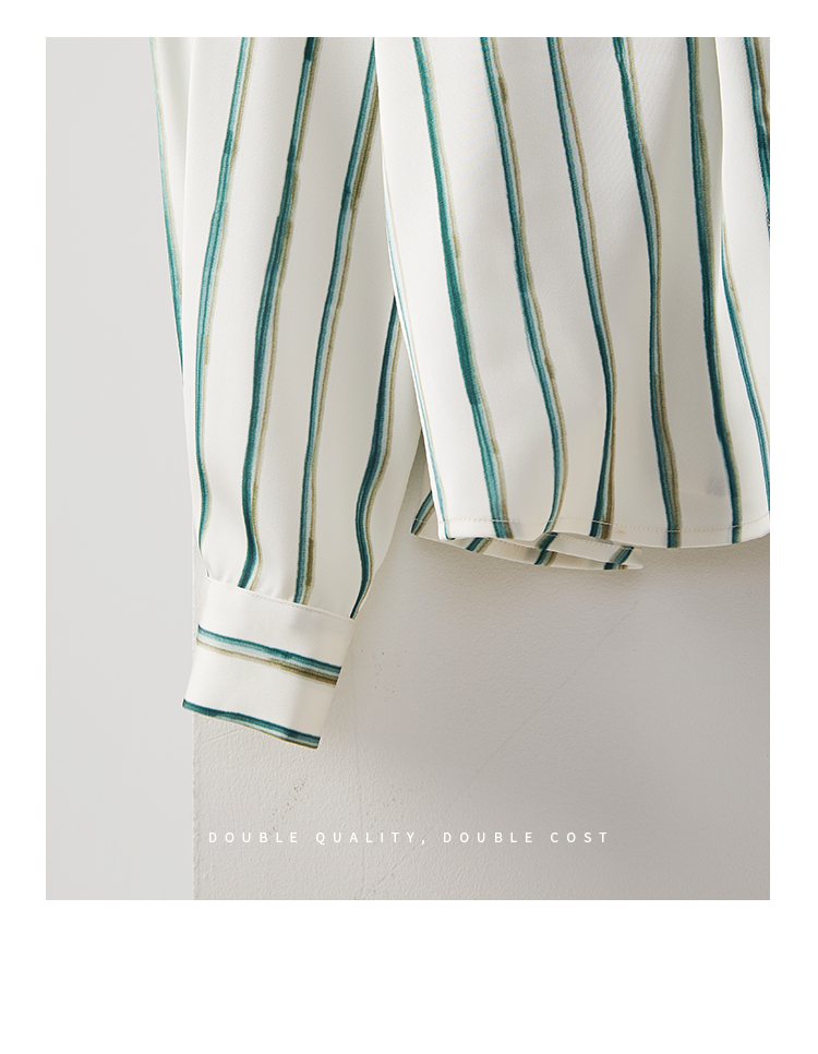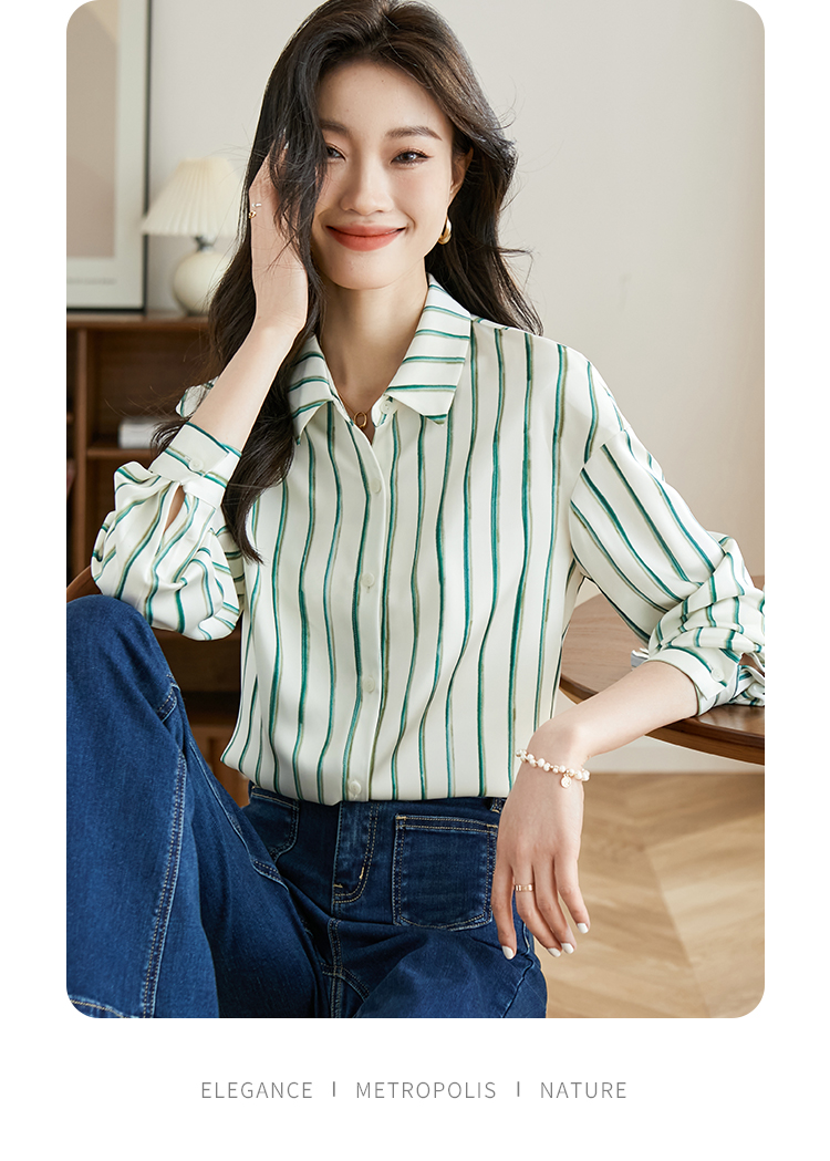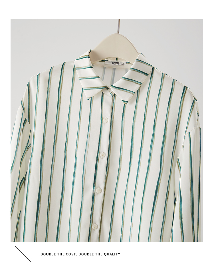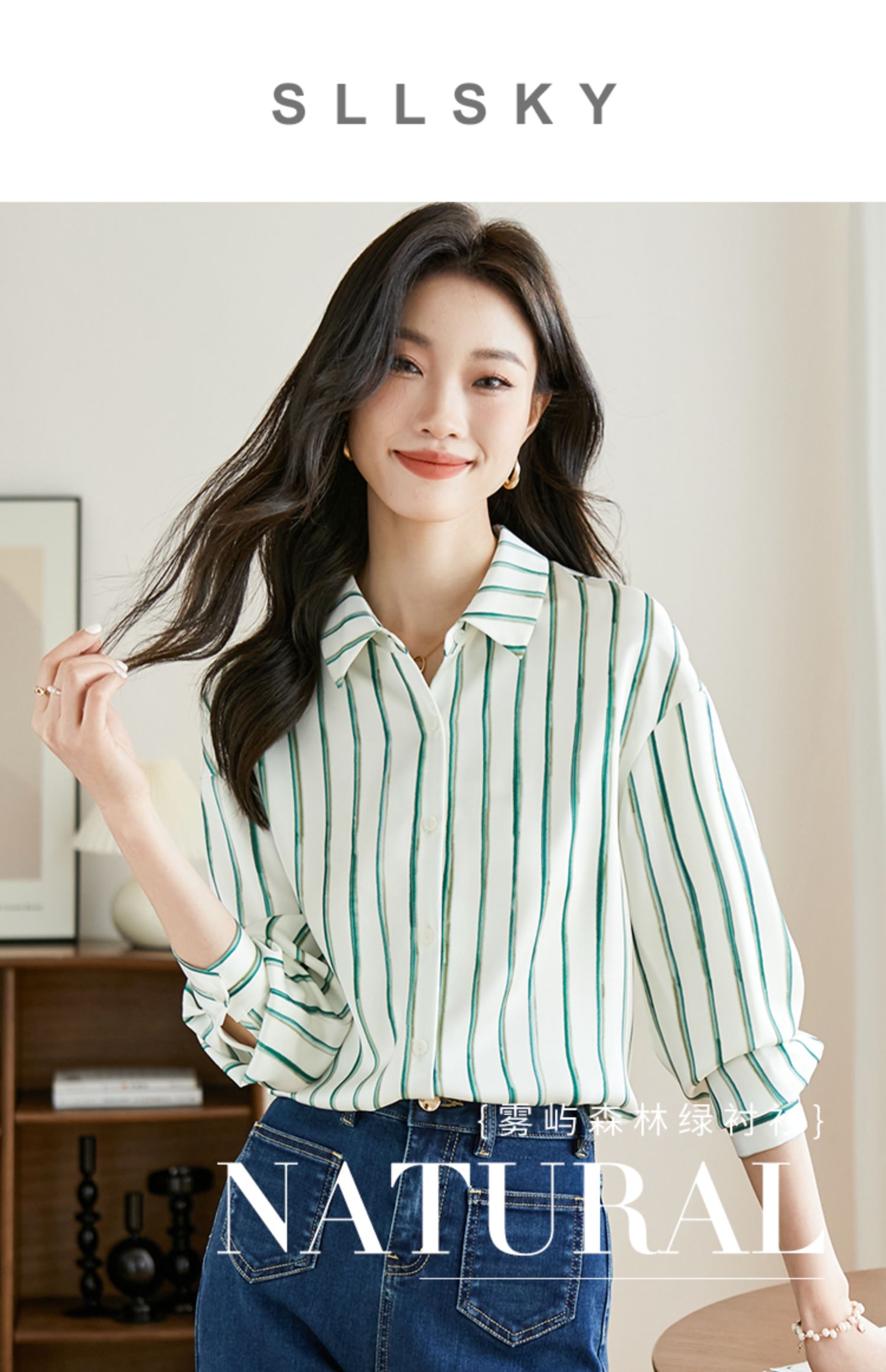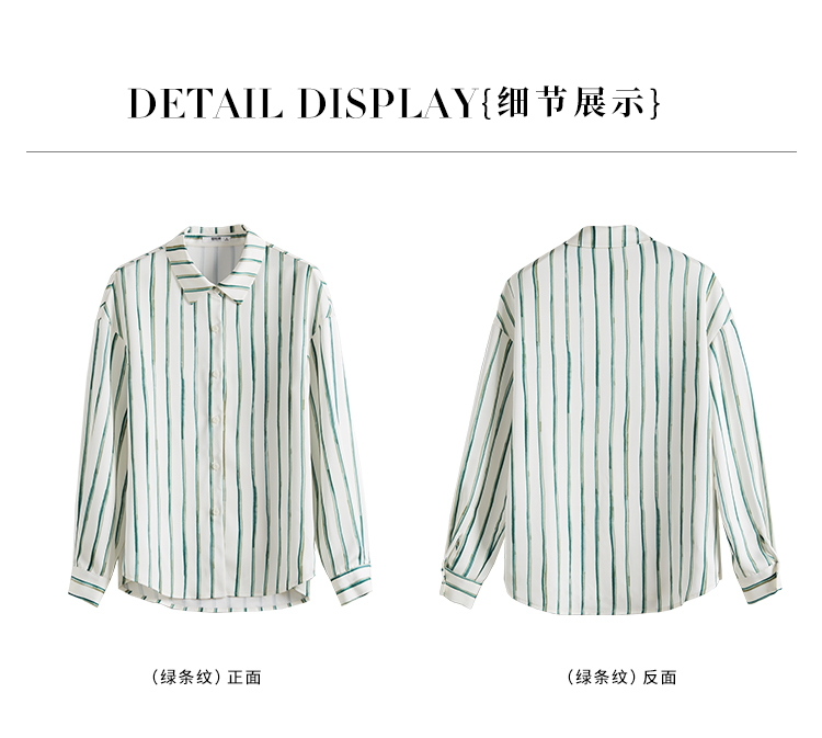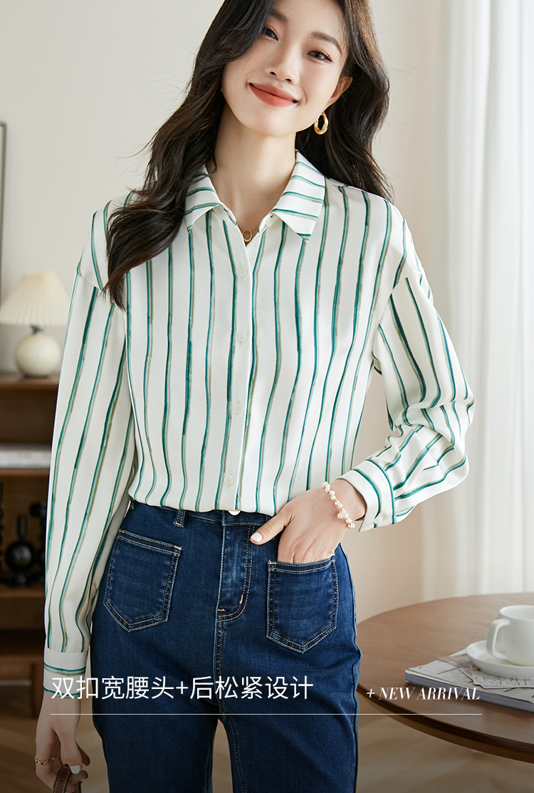 【年终特卖】熙世界复古绿条纹衬衫女2025早秋新款通勤职业长袖衬衣设计感上衣