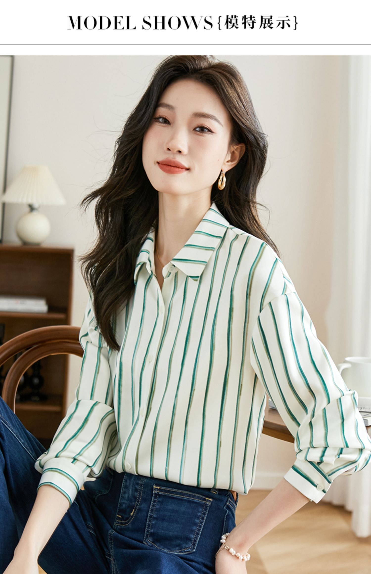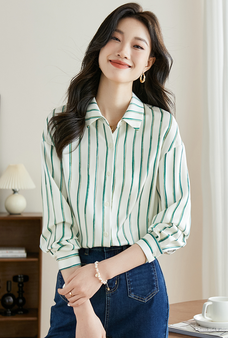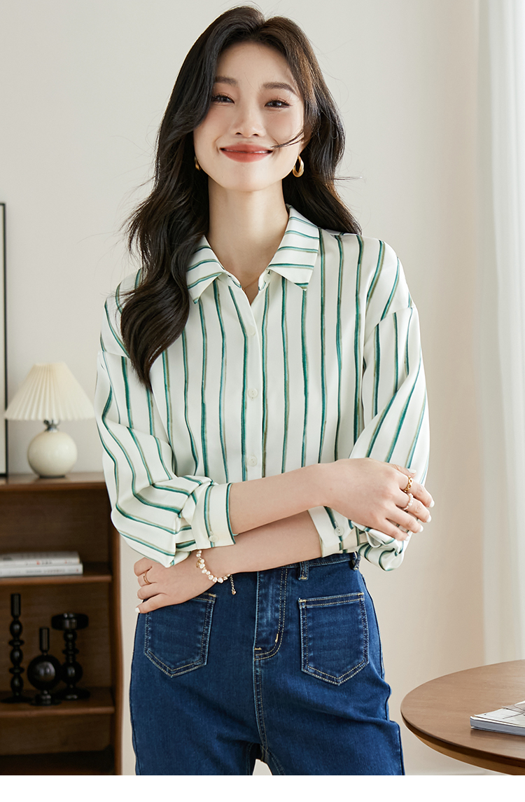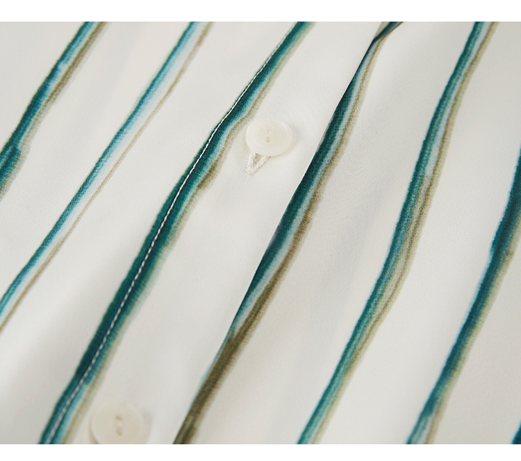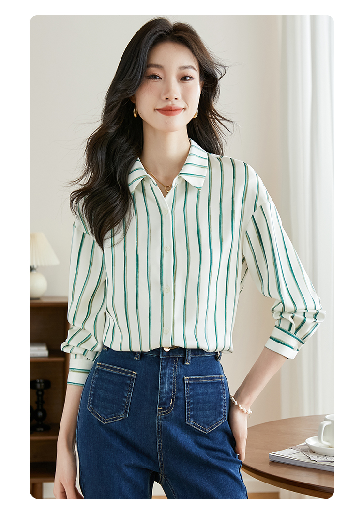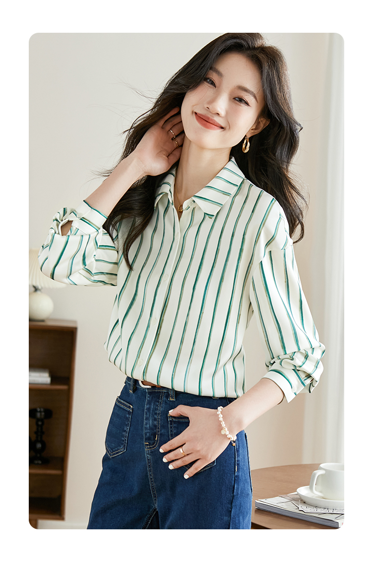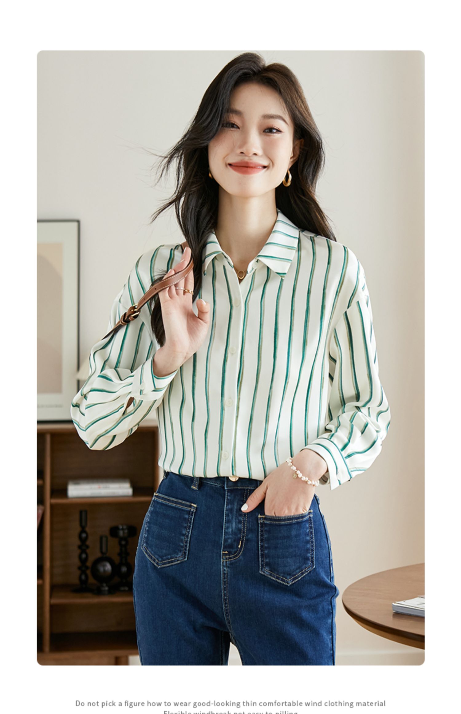 【年终特卖】熙世界复古绿条纹衬衫女2025早秋新款通勤职业长袖衬衣设计感上衣