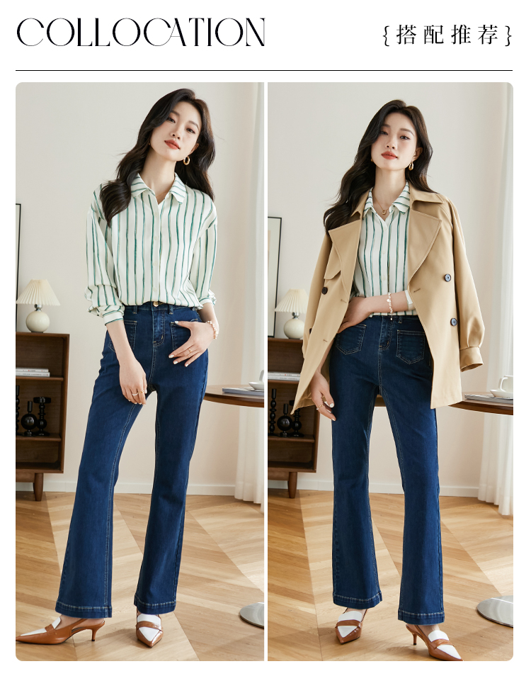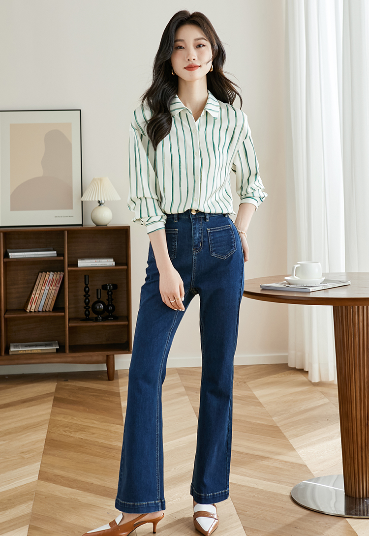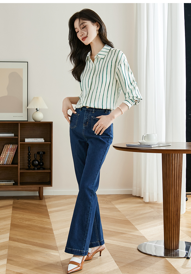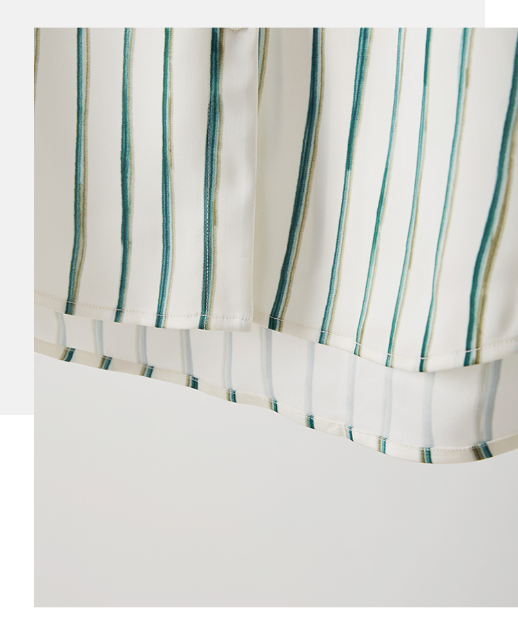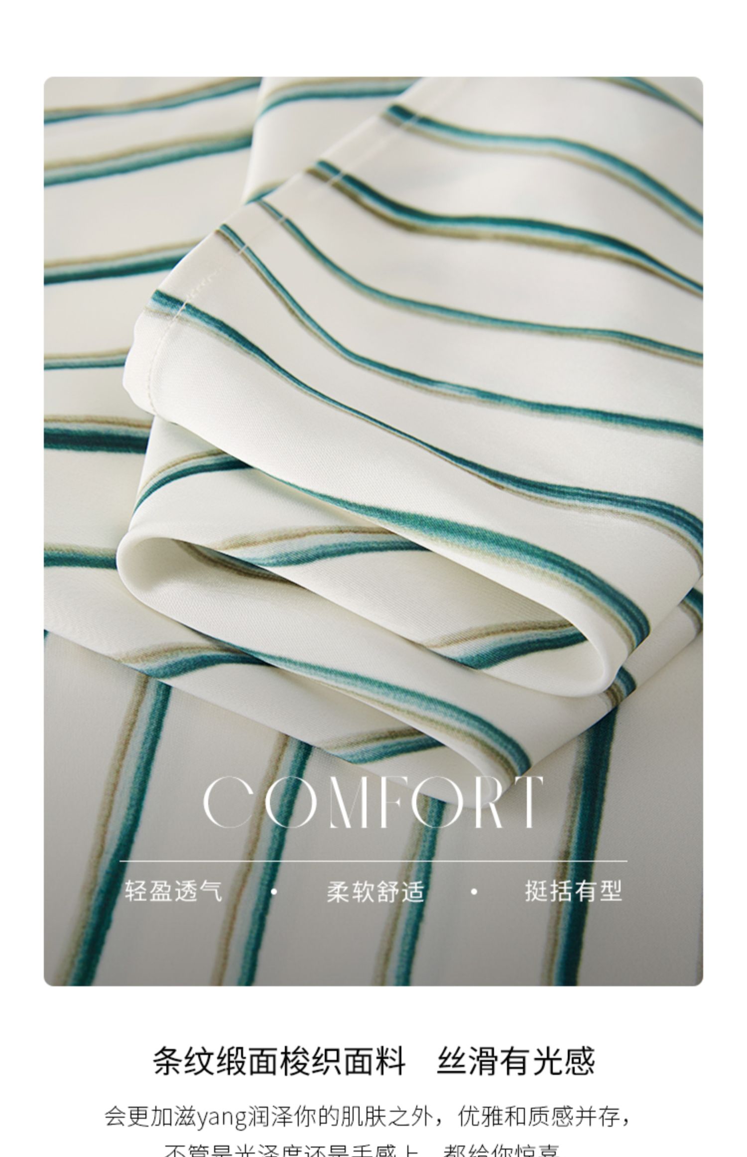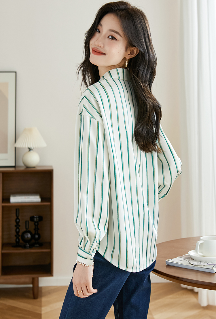 【年终特卖】熙世界复古绿条纹衬衫女2025早秋新款通勤职业长袖衬衣设计感上衣