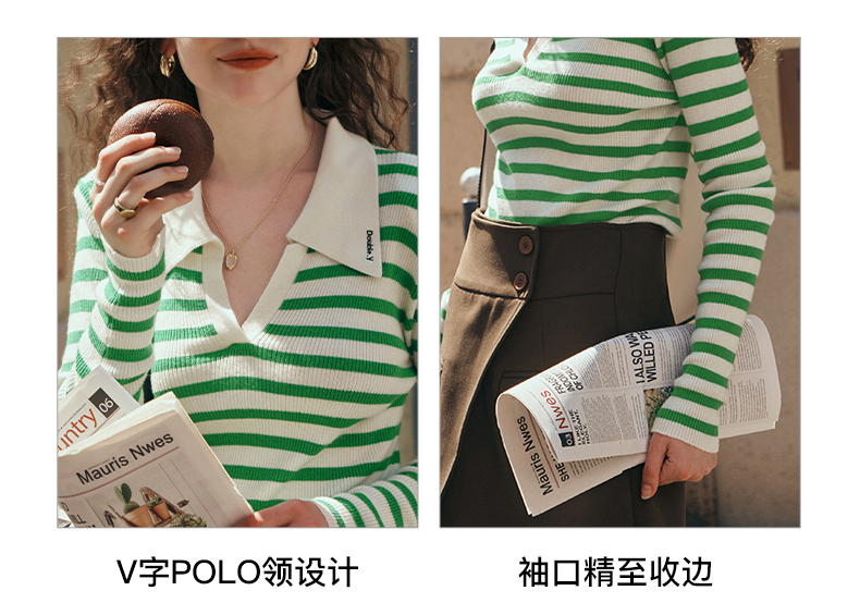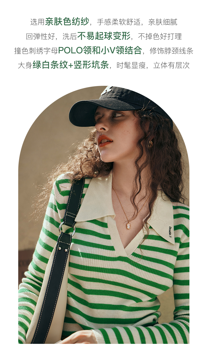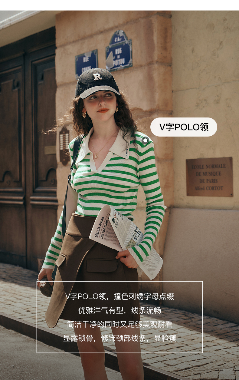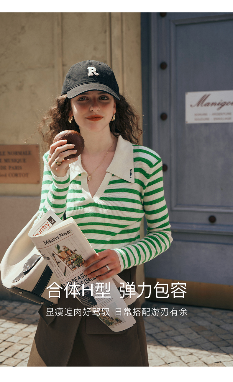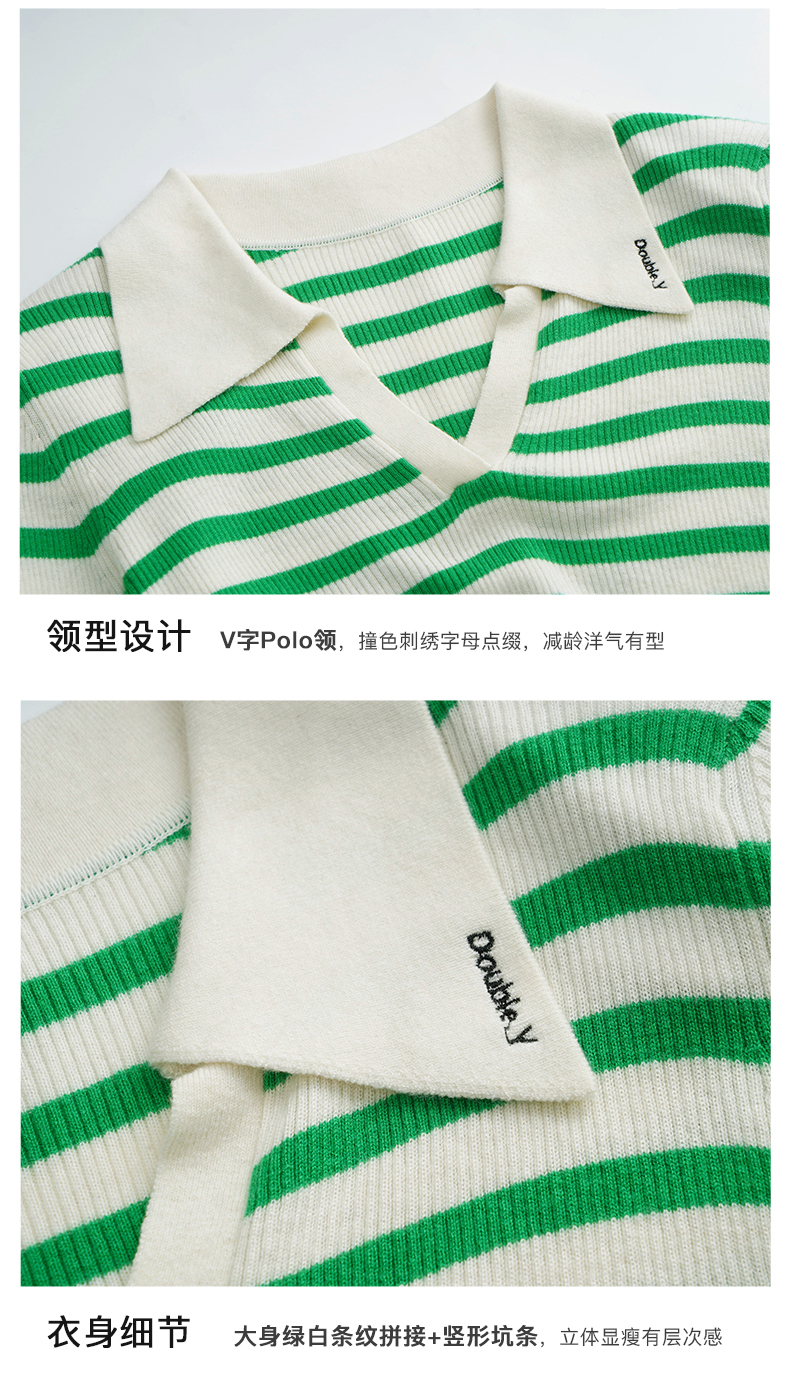 OLrain欧芮儿Polo领条纹毛衣女秋季2025年新款宽松撞色刺绣套头衫