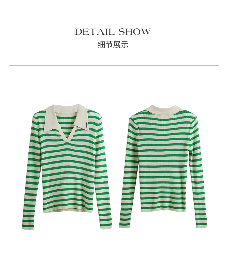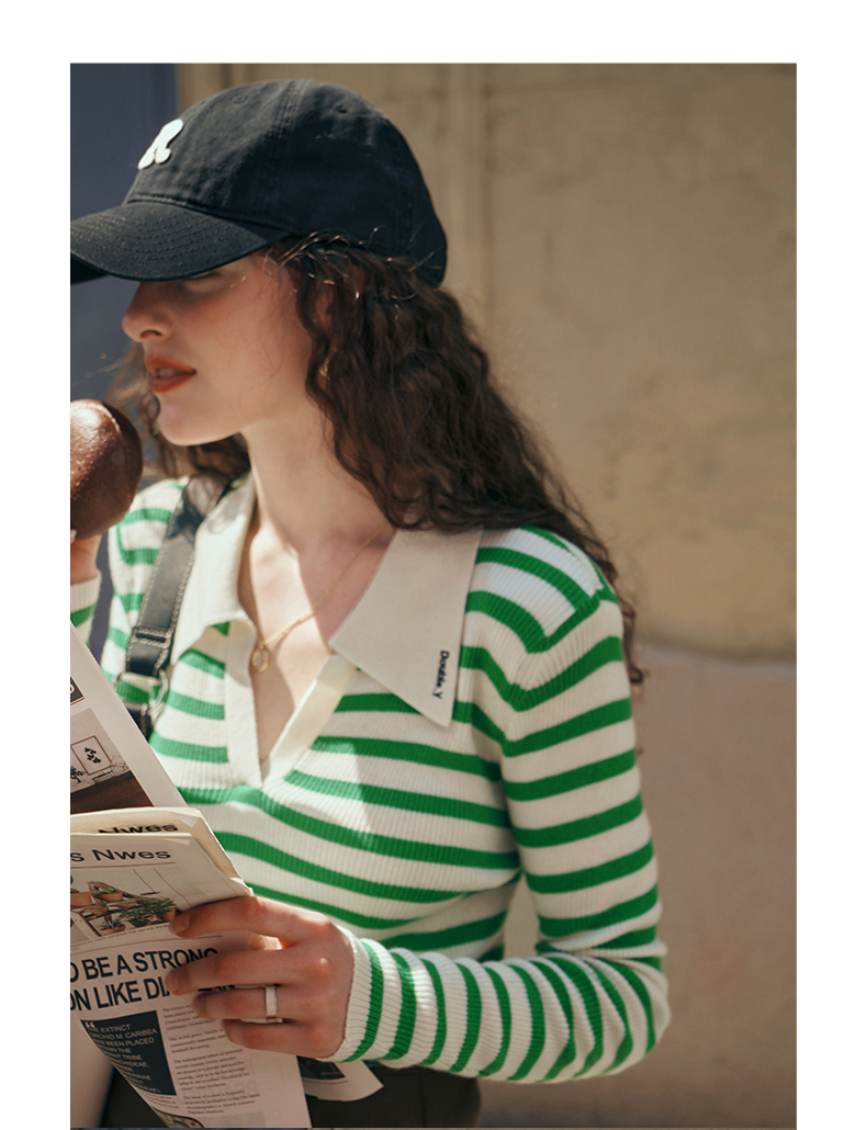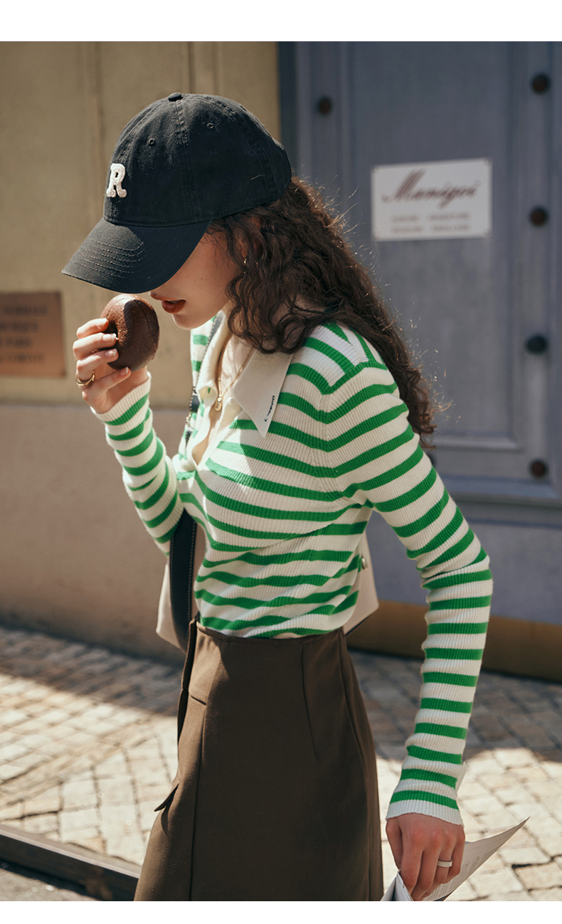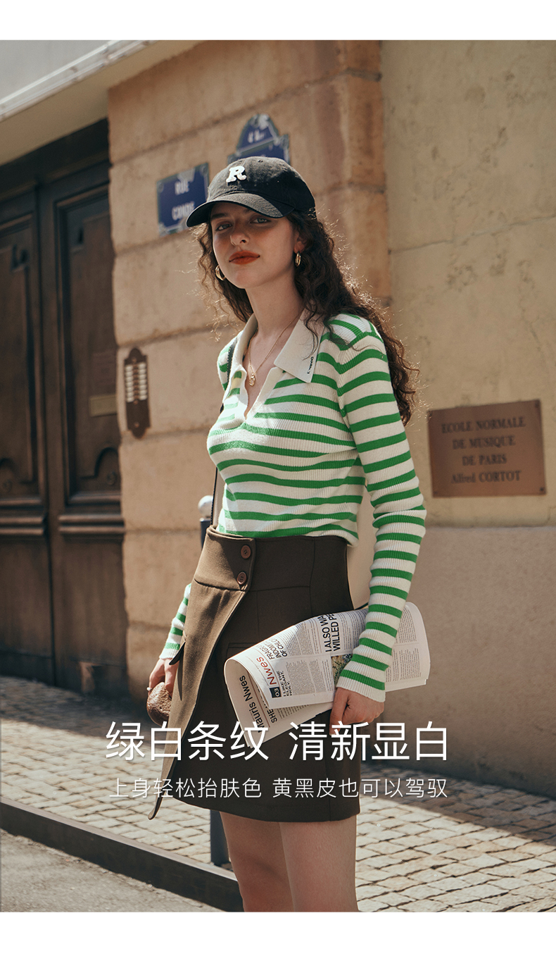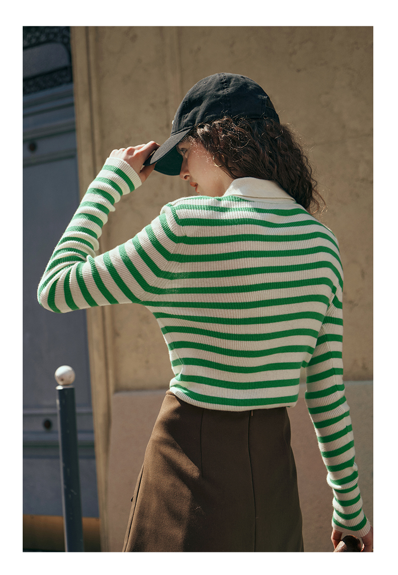 OLrain欧芮儿Polo领条纹毛衣女秋季2025年新款宽松撞色刺绣套头衫